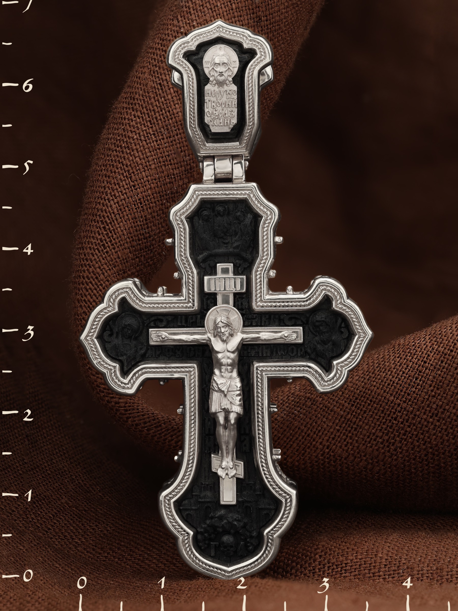 На лицевой стороне креста изображено Распятие Господа и Спасителя нашего Иисуса Христа, отдавшего Себя на смерть, чтобы другие могли жить — жить вечной жизнью, жить с Богом. Через крестную жертву Бог раскрывает нам Свою безмерную любовь и призывает к ответной любви. Своею кровью Господь освятил крест и сделал его проводником Своей благодати, источником освящения верующих. На верхней табличке, выше головы Иисуса, расположена надпись, составленная Понтием Пилатом — «IНЦI». Она означает «Иисус Назорей, Царь Иудейский». Распятие сопровождается каноническими надписями. Надпись «IС» « ХС» означает Иисус Христос и помещается над Распятием. Надпись «Царь Славы» помещается на разных сторонах поперечной (большой) перекладины креста. Ниже расположены надпись «Сын Божий» и слово «НИКА», что означает «победитель». Слева от Распятия изображена Пресвятая Богородица, Справа изображен Пророк Предтеча и Креститель Господень Иоанн. За Распятием высится Иерусалимская стена, в знак того, что Господь был распят вне стен города. Возвышение, на котором стоит Крест, символизирует гору Голгофу, на которой произошло Распятие. Под подножием Креста изображена покоящаяся голова (череп) Адама и надпись «Г.А.». Над распятием помещено изображение иконы Святой Троицы в виде трех ангелов. На кулонном кольце изображен Нерукотворный образ Господа и Спасителя нашего Иисуса Христа, чудесно отпечатавшийся на плате, котором Христос вытер свой лик.