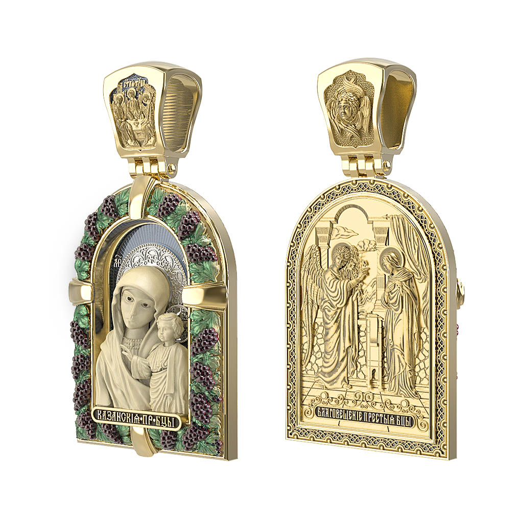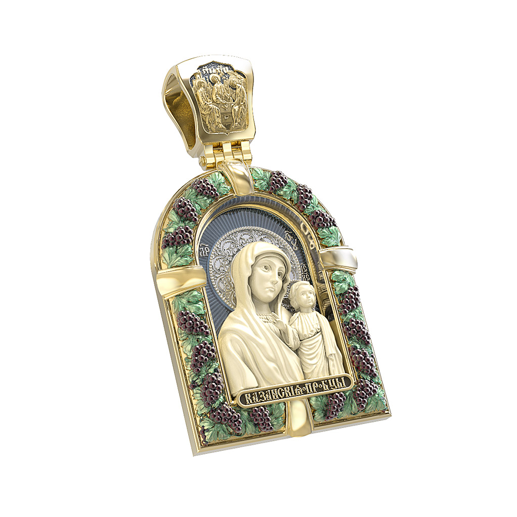 Казанская икона Божией Матери — одна из самых почитаемых в России чудотворных икон Богородицы. Богословское значение Казанской иконы — указать верующим истинный Путь к спасению, который лежит через Христа. Только Божия Матерь имеет настолько сильное дерзновение к Спасителю, что может ходатайствовать перед Ним за всех верных. Именно этот образ дарится новой повенчанной паре, как хранитель очага и семейная реликвия. Молитва перед Казанской иконой Божьей Матери помогает во всех сложных случаях жизни, в болезнях, во всех печалях, невзгодах, скорбях. Уникальная история появления, чудеса, случившиеся по молитвам православных людей возле образа — все это делает Казанскую Богородицу особенной, среди тысяч других икон. Вверху — икона Святой Троицы, на которой запечатлено явление Триединого Бога праотцу Аврааму в виде трех ангелов. Образок обвивает виноградная лоза — один из самых распространенных символических образов христианства. Она является символом Иисуса Христа, Который в Евангелии говорит о Себе: «Я есмь истинная виноградная лоза, и Отец мой — виноградарь». (Ин. 15:1). Поэтому именно из винограда изготавливается вино для Причастия, призванное символизировать Кровь Христову.