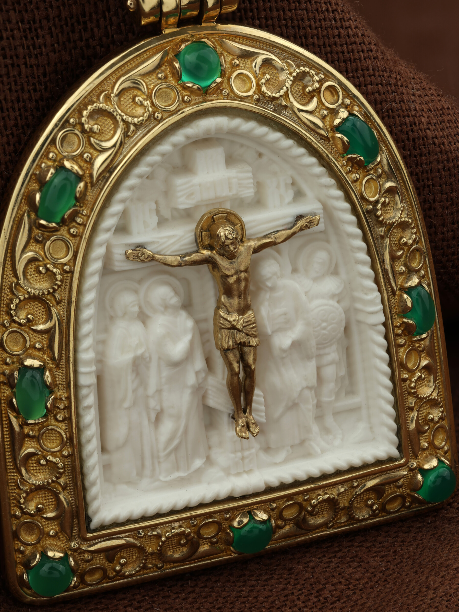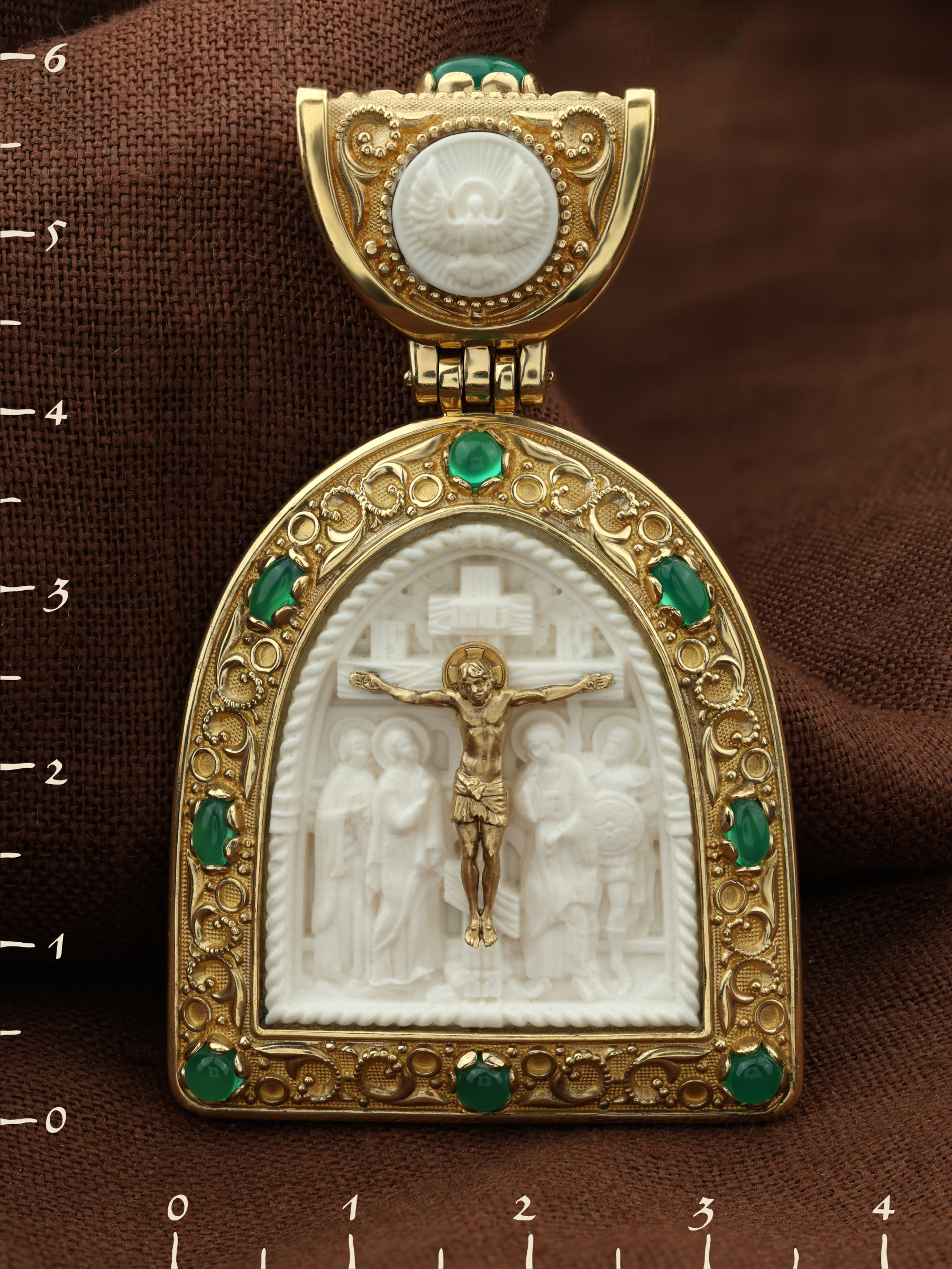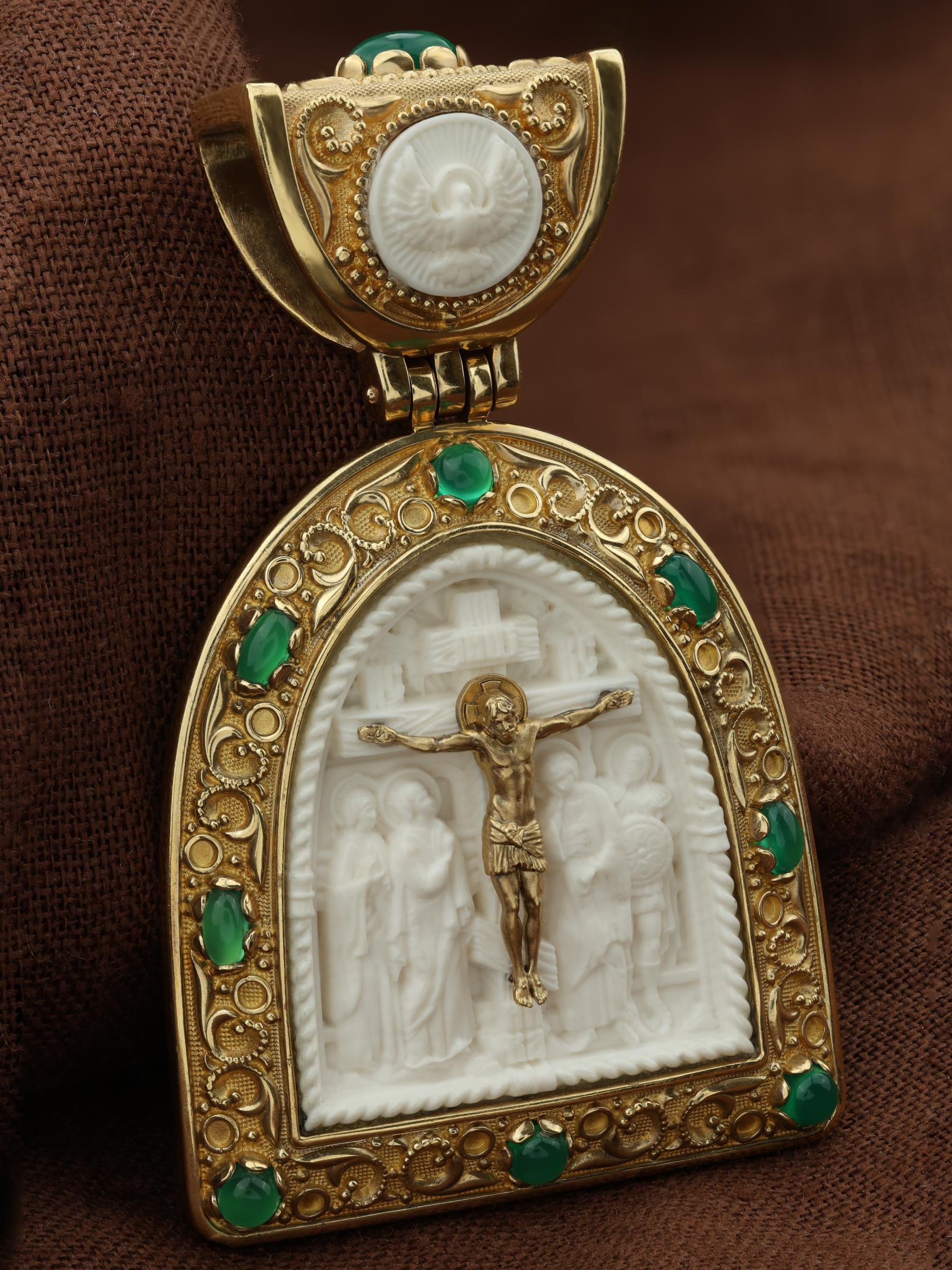 Образок из лимонного золота c эмалью, хризопразом и бивнем мамонта