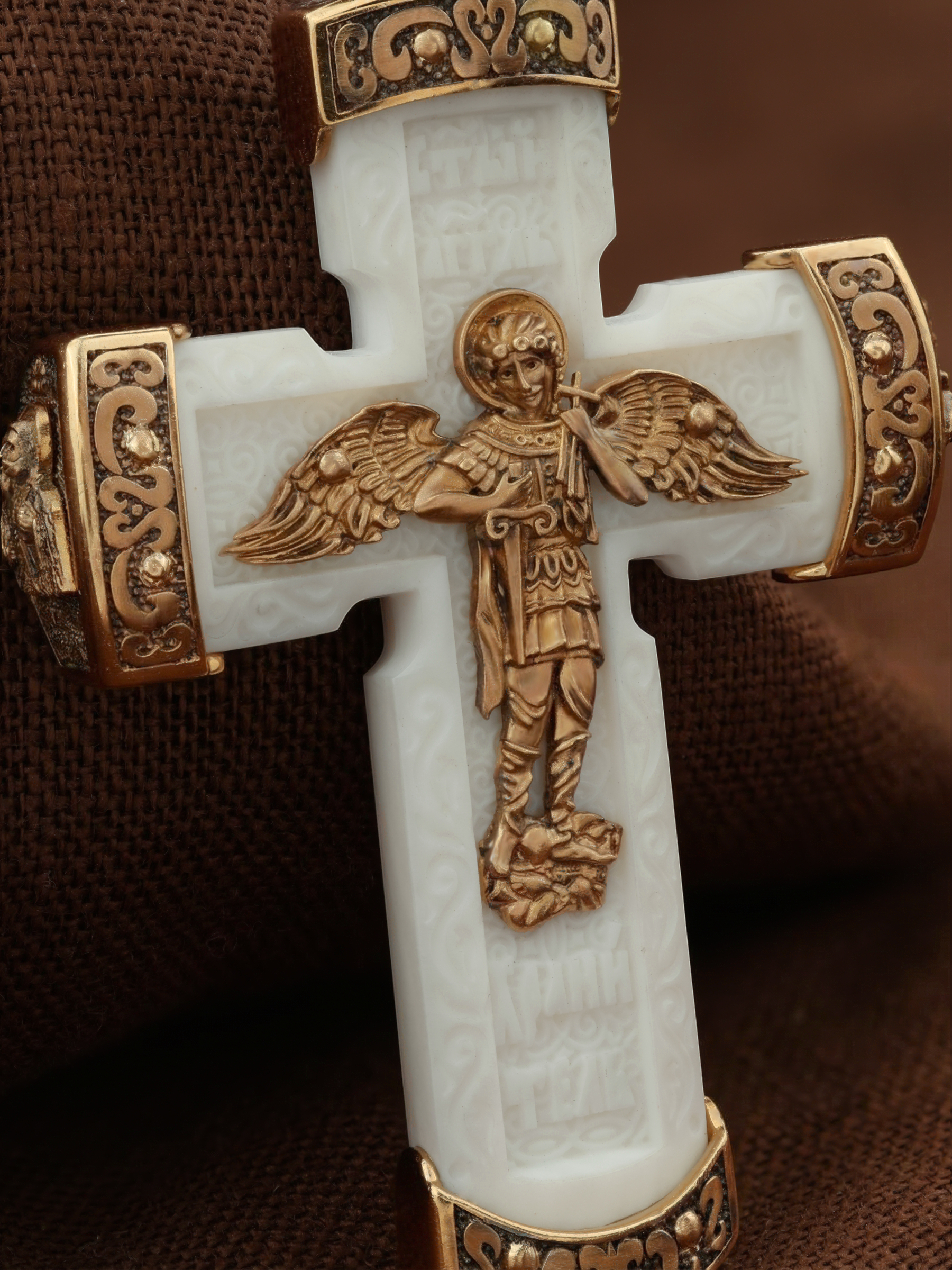 В центре оборота креста изображен Ангела Хранителя с традиционными атрибутами в руках: крестом, которым он осеняет человека, и мечом для прогнания бесов. По Православному учению, каждому, принявшему святое крещение, дается Господом Ангел Хранитель, который сопровождает человека всю его жизнь, помогая в добрых делах и охраняя от нападок злых духов. Святые отцы утверждают, что только верующий человек имеет рядом с собой Ангела Хранителя: «Тем, которые сподобились крещения и возносятся на высоту добродетелей, даны от Бога Ангелы, заботящиеся о них и содействующие им. В этом уверяет нас Господь, когда говорит, что есть Ангелы Хранители у всякого, кто верует в Него» (преп. Анастасий Синаит). Но Ангел Хранитель пребывает с христианином, если только мы не прогоним его греховными делами, поскольку «как дым разгоняет пчел, так и грех прогоняет от нас Ангела Хранителя» (свт. Василий Великий). Но и после завершения земного пути Ангел Хранитель не покидает христианина, а помогает душе преодолеть воздушные мытарства на пути в Царство Небесное.