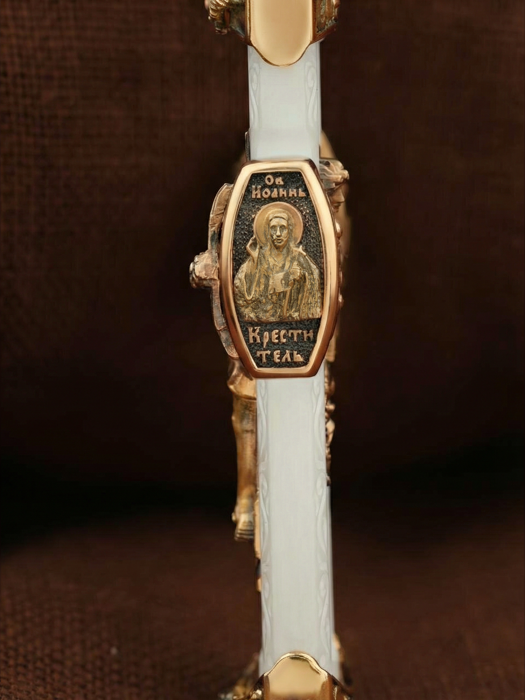 На торце изделия с левой стороны помещена икона Святого Николая Чудотворца — самый почитаемый в Православной Церкви, которого еще называют Николай Угодник за то, что он угодил своей жизнью Богу. Николай Чудотворец, помощник в делах, покровитель учащихся, утешитель обиженных и нуждающихся, целитель самых страшных и тяжелых недугов, предстатель и молитвенник за людей перед Богом. Также Святитель Николай Чудотворец известен своими молитвами за путешественников, когда непрестанный ветер и бушующие волны утихают и корабль заходит в спокойную гавань. На торце изделия с правой стороны — икона Святого Иоанна Крестителя. Святой Иоанн был последним пророком Израиля. Он призывал к покаянию, предвозвещая приближение Царствия Небесного (Мф. 3, 2), и удостоился стать Крестителем Христа. Иисус Христос говорит о нем: «Сей есть о котором написано: «Вот, Я посылаю Ангела Моего пред лицем Твоим, который приготовит путь Твой пред Тобою» (Лк. 7, 27). И еще: «Из рожденных женами нет ни одного пророка больше Иоанна Крестителя» (Лк. 7, 28).