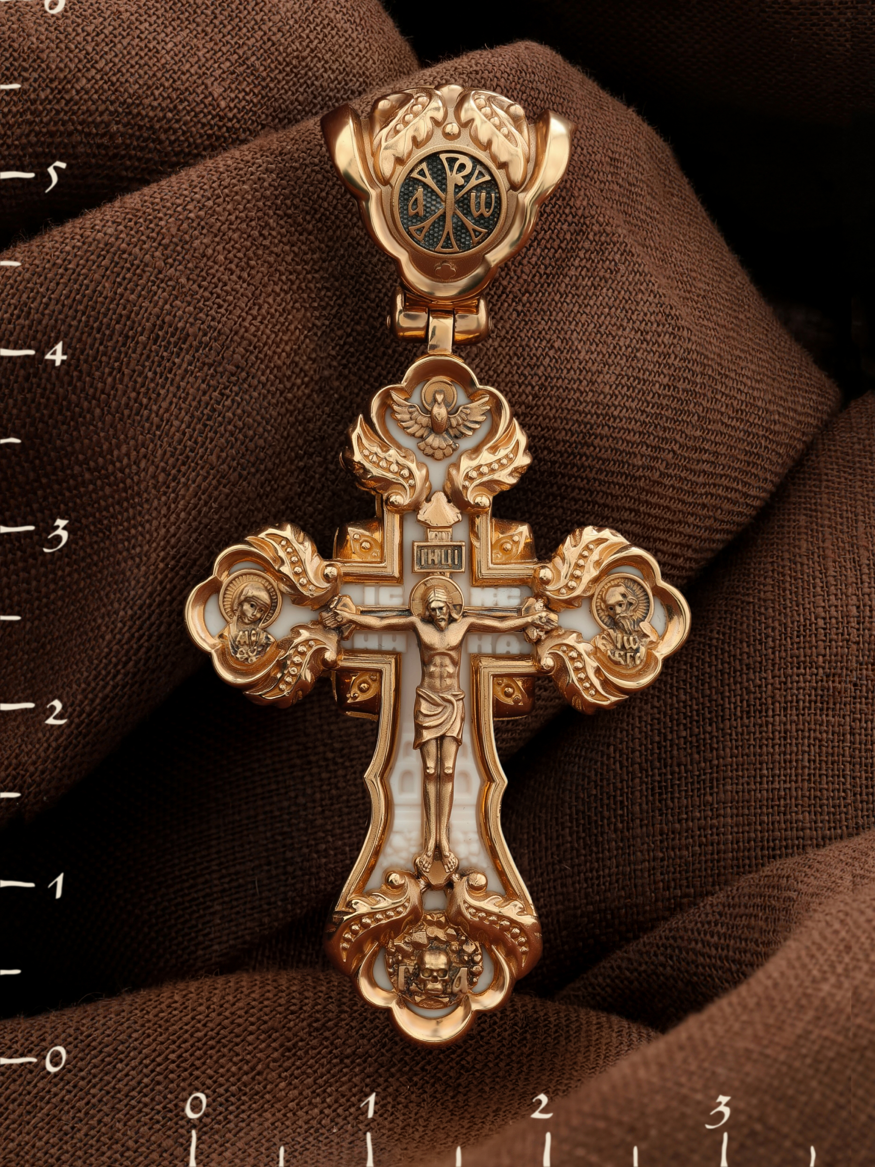 На лицевой стороне креста изображено Распятие Господа и Спасителя нашего Иисуса Христа. Крест- символ спасения и искупления рода человеческого, знамение победы над смертью и адом. Иисус Христос, как искупительная жертва освобождения человечества от власти греха, умер крестной смертью и в третий день воскрес. На верхней табличке, выше головы Иисуса, расположена надпись, составленная Понтием Пилатом — «ИНЦИ». Она означает «Иисус Назорей, Царь Иудейский». Над перекладиной написано сокращенно имя Спасителя «IC» «XC» — Иисус Христос. Ниже перекладины написано слово «НИКА» (греч. — Победитель). Крест стоит на горе камней, символизирующих Голгофу. В ее основании различается череп и надписи «Г.А.» — это голова Адама. Слева от Распятия помещен лик Пречистой Богородицы, скорой помощницы и заступницы рода Христианского. Слева изображен апостол и евангелист Иоанн Богослов, один из ближайших учеников Иисуса Христа. Над Распятием — изображение Духа Святого в виде голубя, сходящего с Небес. На кулонном кольце помещен крест.