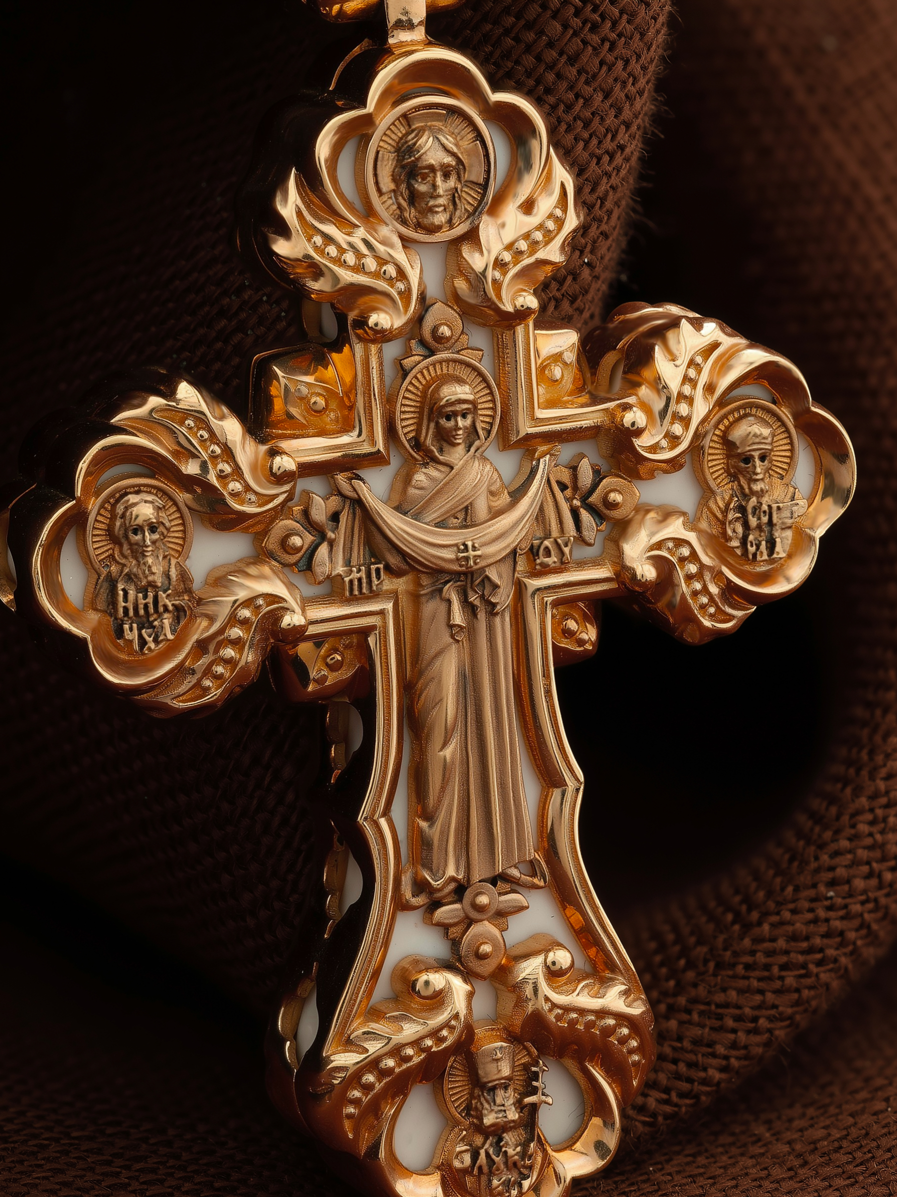 Центральную часть оборотной стороны креста украшает икона «Покров Пресвятой Богородицы». В руках Божьей Матери находится омофор, который она распростерла над людьми, покрывая их от всякого зла. Выше образа изображен Спас Нерукотворный, ниже — Святитель Лука (Войно-Ясенецкий). Слева от Распятия изображен Святитель Николай Чудотворец, архиепископ Мир Ликийских, справа — Преподобный Сергий, игумен Радонежский, Чудотворец. На кулонном кольце помещено изображение шестикрылого Серафима.