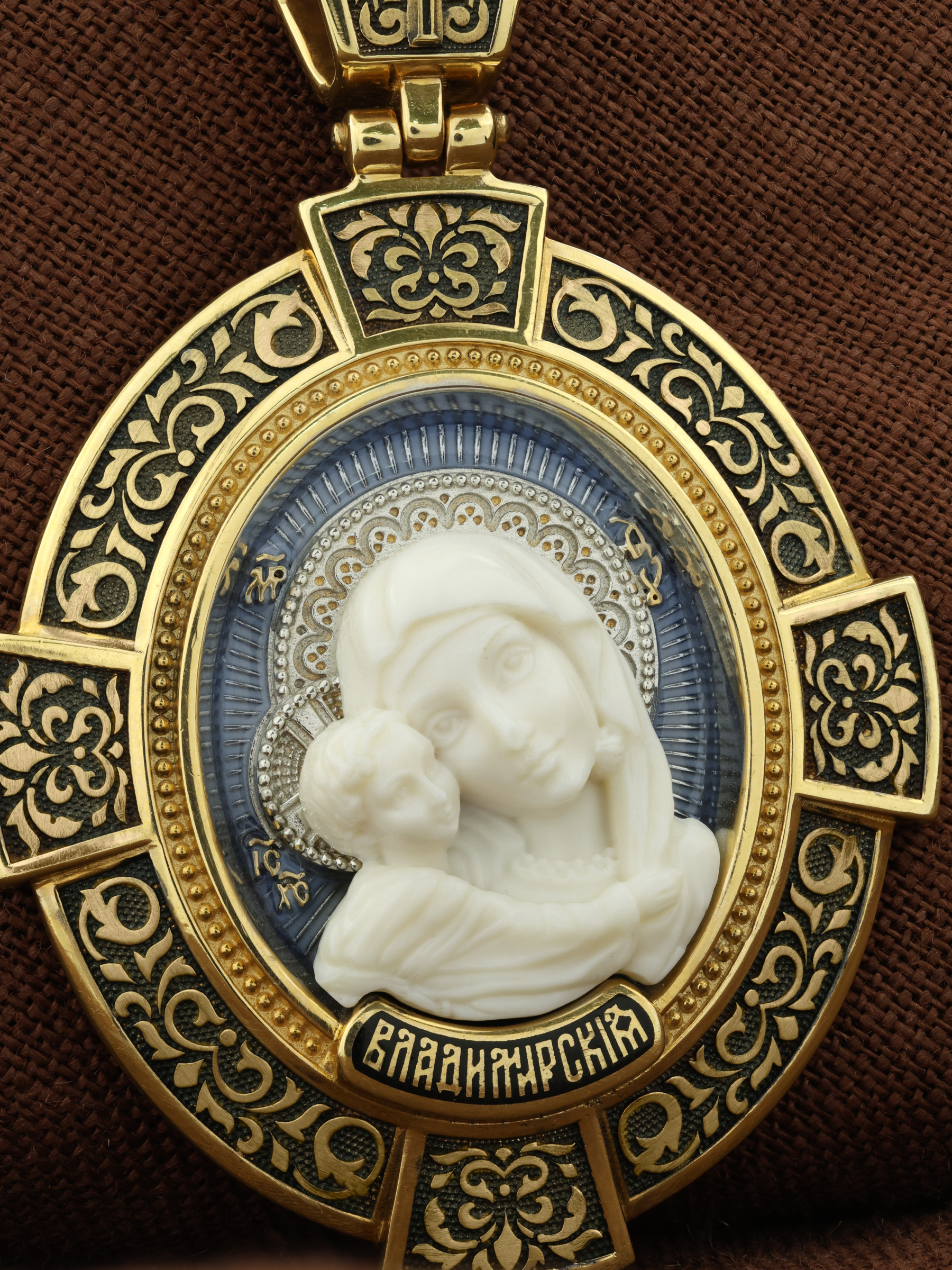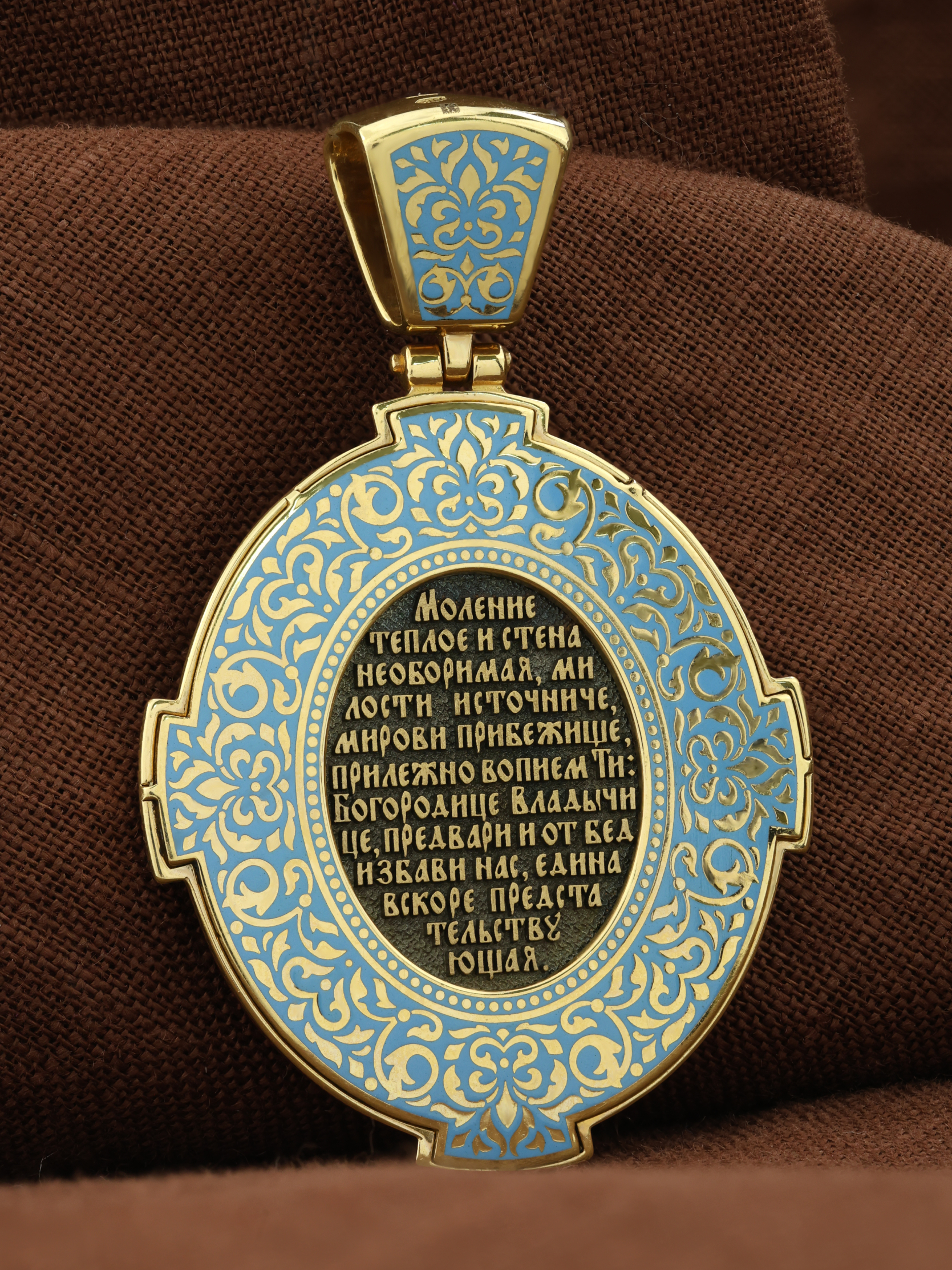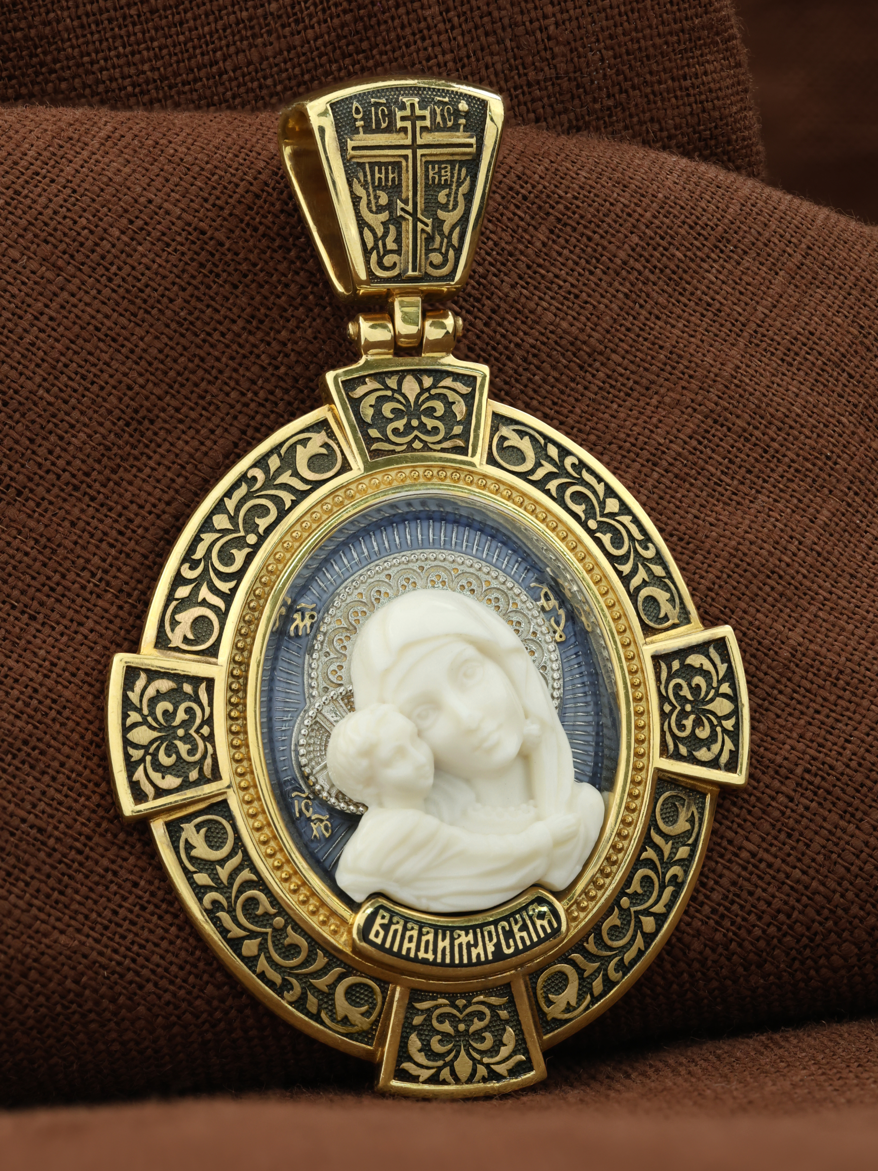 На лицевой стороне образка изображена Владимирская икона Божией Матери — одна из самых чтимых святынь Русской православной церкви. По преданию, икона была написана Святым апостолом и евангелистом Лукой во время земной жизни Богородицы. Дева Мария, увидев Свое изображение, молвила: «Отныне ублажат Мя вси роди. Благодать Рождшегося от Меня и Моя с сим образом да будет». Образ написан в лирическом иконографическом типе «Умиление». Младенец припал щекой к щеке Матери и тянется к ней правой рукой, другой нежно обнимая за шею. Икона вплоть до V века находилась в Иерусалиме, затем была перевезена в Византию. На Русь икона была привезена в 1131 г. За прошедшие столетия святыня неоднократно переезжала из Владимира в Москву и обратно, не раз спасая страну от захватчиков. Русская Православная Церковь установила троекратное празднование Владимирской иконе Божьей Матери. Каждый из дней празднования связан с избавлением русского народа от порабощения иноплеменниками по молитвам ко Пресвятой Богородице. В последующие века у иконы происходили многие важные исторические события: подписание актов, принятие присяги значимых государственных деятелей и возведение на престол. На кулонном кольце изображен Спас Нерукотворный — образ Господа и Спасителя нашего Иисуса Христа, чудесно отпечатавшийся на плате, котором Христос вытер свой лик.