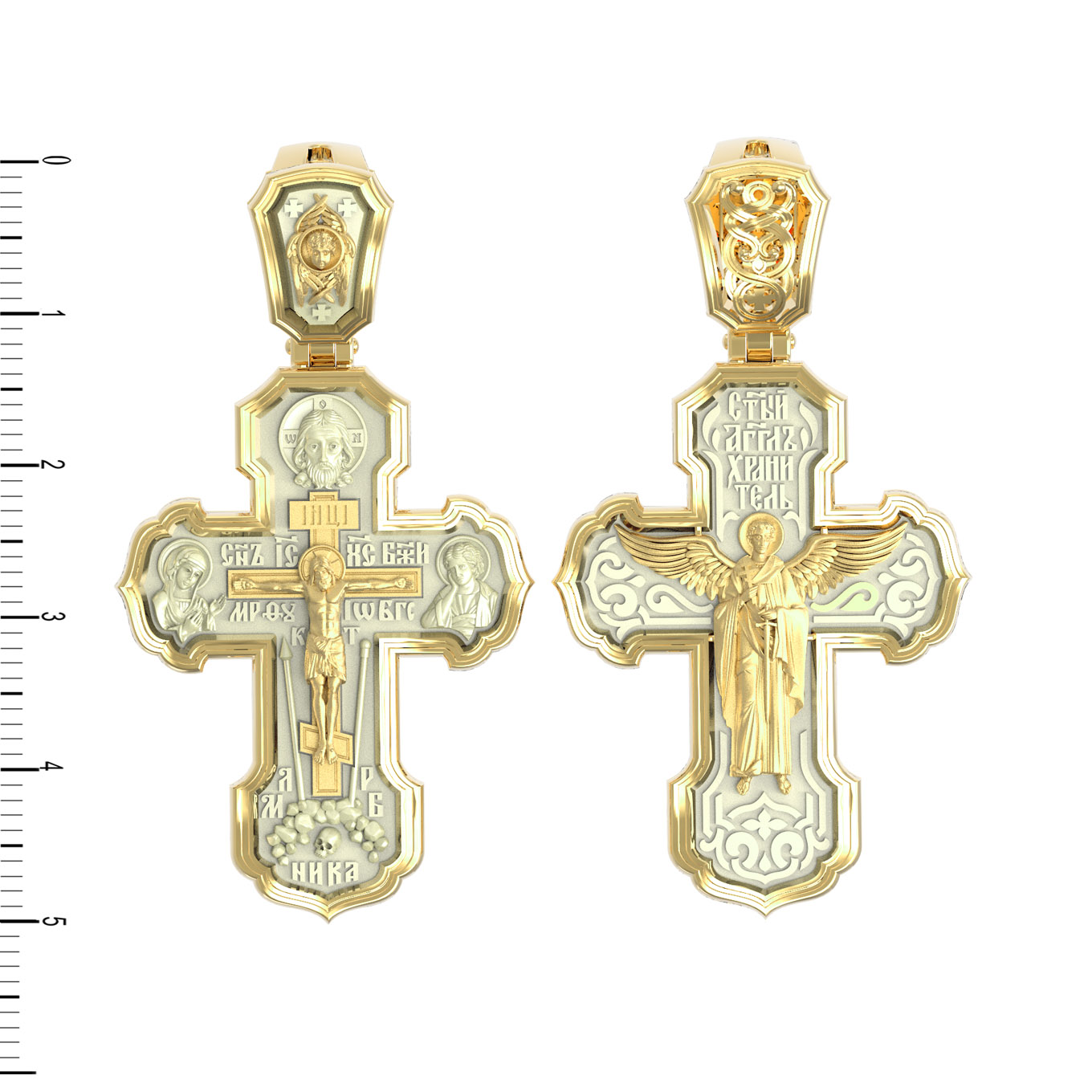 На лицевой стороне креста изображено Распятие Господа и Спасителя нашего Иисуса Христа. Крест- символ спасения и искупления рода человеческого, знамение победы над смертью и адом. Иисус Христос, как искупительная жертва освобождения человечества от власти греха, умер крестной смертью и в третий день воскрес. На верхней табличке, выше головы Иисуса, расположена надпись, составленная Понтием Пилатом — «IНЦI». Она означает «Иисус Назорей, Царь Иудейский». Надпись «IС» « ХС» означает Иисус Христос и помещается на разных сторонах поперечной (большой) перекладины креста. Рядом расположена надпись «Сын Божий». Выше Распятия изображен Нерукотворный образ Господа и Спасителя нашего Иисуса Христа. Слева от Распятия изображена Пресвятая Богородица, справа — апостол и евангелист Иоанн Богослов, один из ближайших учеников Иисуса Христа. Крест стоит на горе камней, символизирующих Голгофу. В ее основании различается череп — это голова Адама. Вдоль креста изображены копие сотника Лонгина и трость с губкой и буквы «К» и «Т». Надпись «МЛРБ» — «место лобное рай бысть» означает, что место лобное стало раем и помещаются в нижней части креста. Рядом — слово «НИКА», что означает «победитель». На православном кресте Христос не умирает, а свободно простирает руки, ладони Иисуса открыты, будто он хочет обнять все человечество, даря им свою любовь и открывая путь к вечной жизни. На кулонном кольце изображен шестикрылый Серафим.