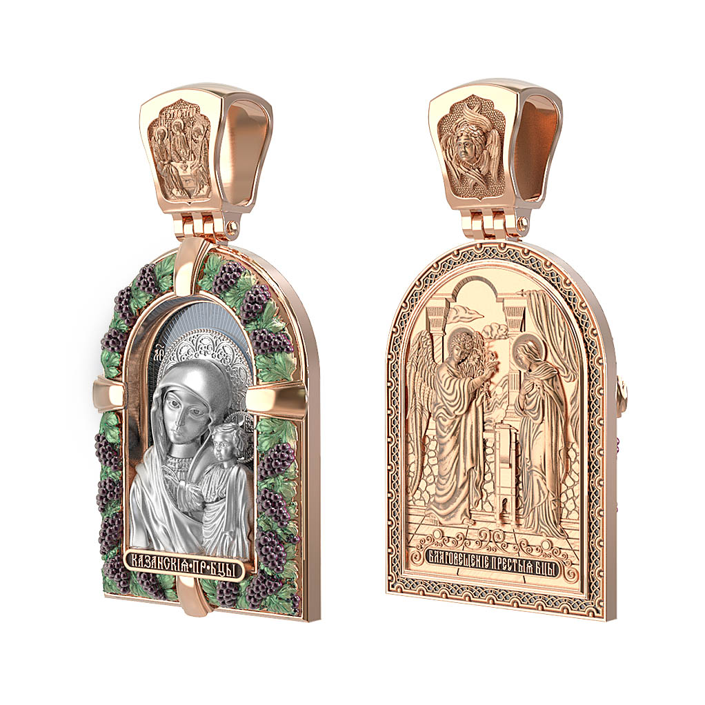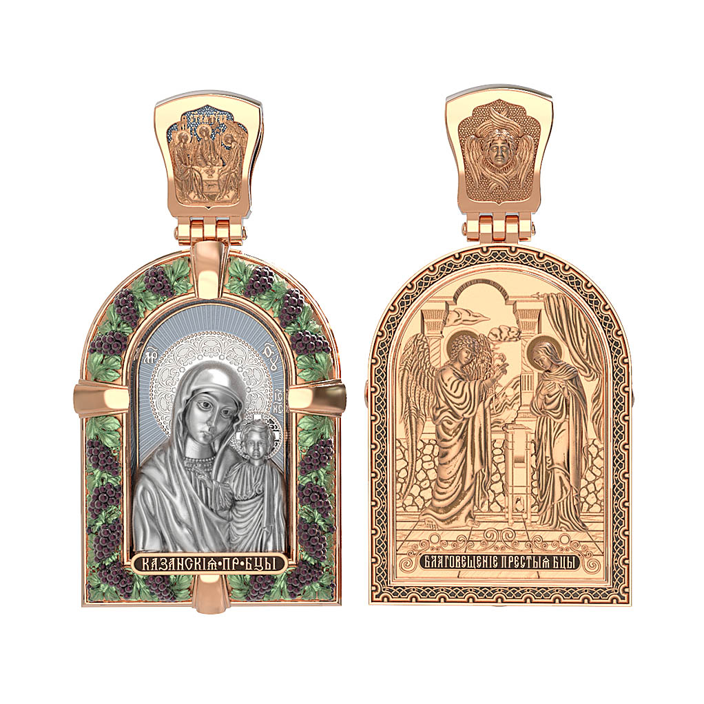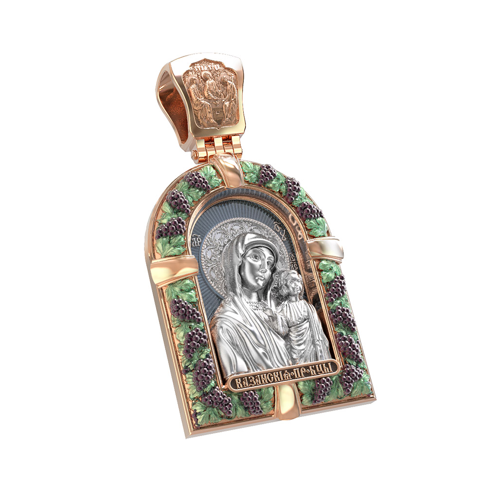 Казанская икона Божией Матери — одна из самых почитаемых в России чудотворных икон Богородицы. Богословское значение Казанской иконы — указать верующим истинный Путь к спасению, который лежит через Христа. Только Божия Матерь имеет настолько сильное дерзновение к Спасителю, что может ходатайствовать перед Ним за всех верных. Именно этот образ дарится новой повенчанной паре, как хранитель очага и семейная реликвия. Молитва перед Казанской иконой Божьей Матери помогает во всех сложных случаях жизни, в болезнях, во всех печалях, невзгодах, скорбях. Уникальная история появления, чудеса, случившиеся по молитвам православных людей возле образа — все это делает Казанскую Богородицу особенной, среди тысяч других икон. Вверху — икона Святой Троицы, на которой запечатлено явление Триединого Бога праотцу Аврааму в виде трех ангелов. Образок обвивает виноградная лоза — один из самых распространенных символических образов христианства. Она является символом Иисуса Христа, Который в Евангелии говорит о Себе: «Я есмь истинная виноградная лоза, и Отец мой — виноградарь». (Ин. 15:1). Поэтому именно из винограда изготавливается вино для Причастия, призванное символизировать Кровь Христову.