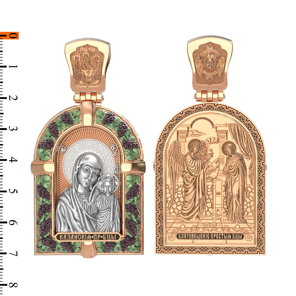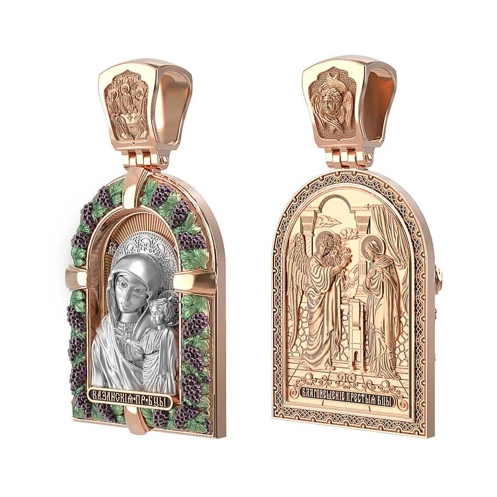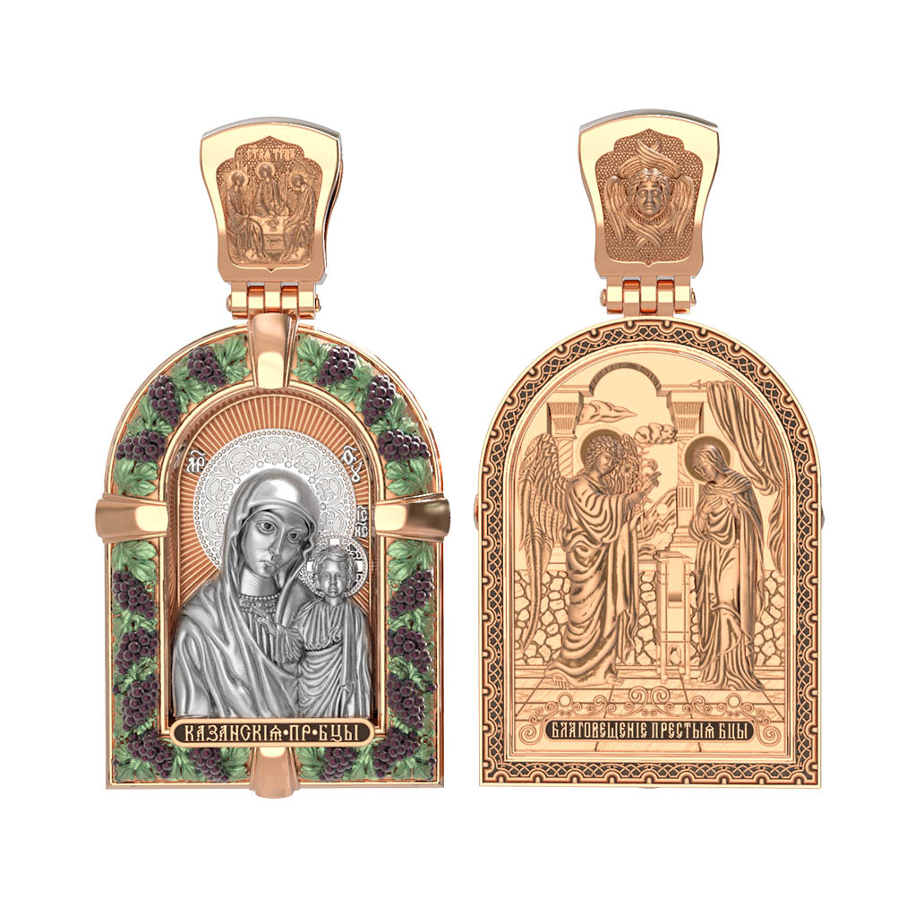Казанская икона Божией Матери — одна из самых почитаемых в России чудотворных икон Богородицы. Богословское значение Казанской иконы — указать верующим истинный Путь к спасению, который лежит через Христа. Только Божия Матерь имеет настолько сильное дерзновение к Спасителю, что может ходатайствовать перед Ним за всех верных. Именно этот образ дарится новой повенчанной паре, как хранитель очага и семейная реликвия. Молитва перед Казанской иконой Божьей Матери помогает во всех сложных случаях жизни, в болезнях, во всех печалях, невзгодах, скорбях. Уникальная история появления, чудеса, случившиеся по молитвам православных людей возле образа — все это делает Казанскую Богородицу особенной, среди тысяч других икон. Вверху — икона Святой Троицы, на которой запечатлено явление Триединого Бога праотцу Аврааму в виде трех ангелов. Образок обвивает виноградная лоза — один из самых распространенных символических образов христианства. Она является символом Иисуса Христа, Который в Евангелии говорит о Себе: «Я есмь истинная виноградная лоза, и Отец мой — виноградарь». (Ин. 15:1). Поэтому именно из винограда изготавливается вино для Причастия, призванное символизировать Кровь Христову.