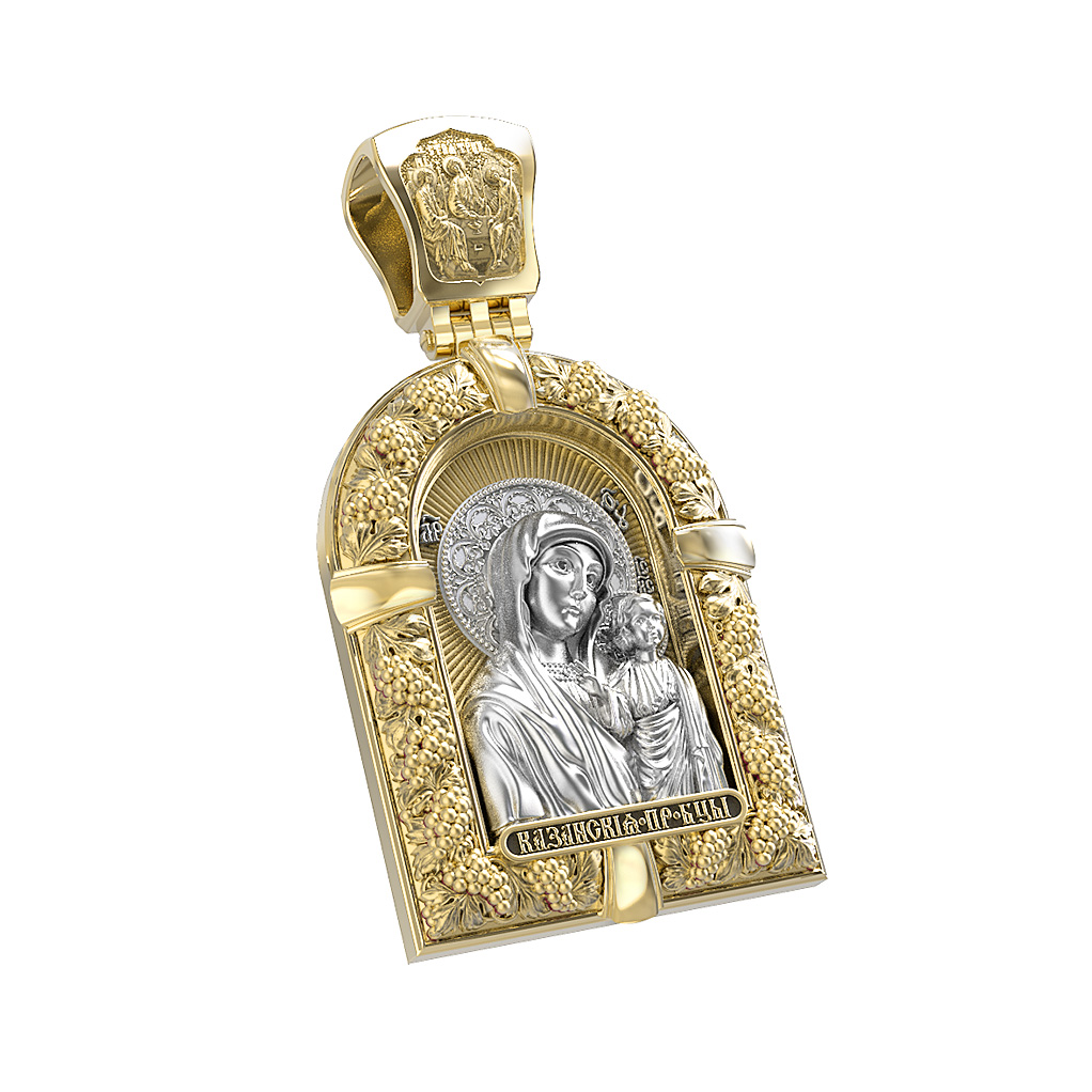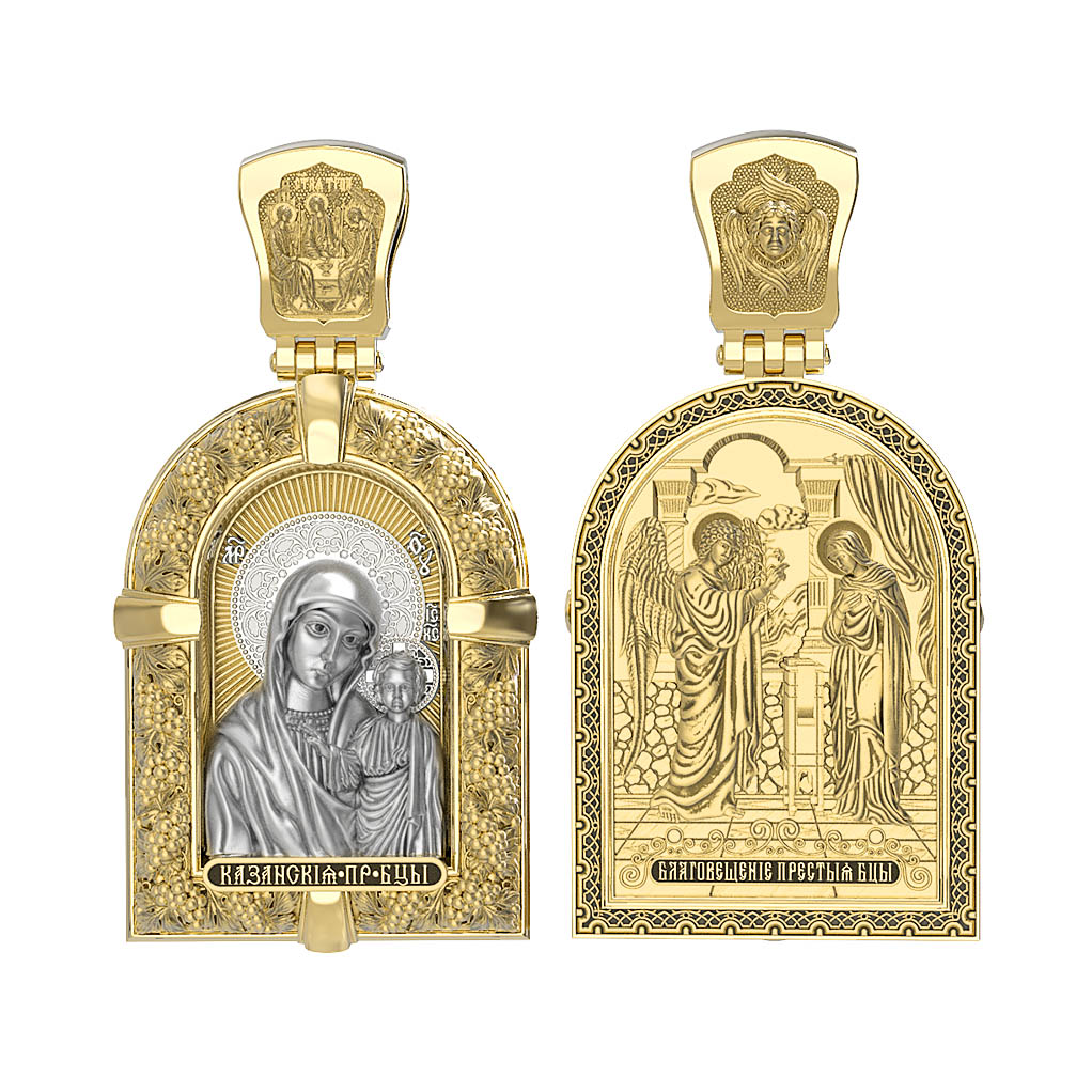 Казанская икона Божией Матери — одна из самых почитаемых в России чудотворных икон Богородицы. Богословское значение Казанской иконы — указать верующим истинный Путь к спасению, который лежит через Христа. Только Божия Матерь имеет настолько сильное дерзновение к Спасителю, что может ходатайствовать перед Ним за всех верных. Именно этот образ дарится новой повенчанной паре, как хранитель очага и семейная реликвия. Молитва перед Казанской иконой Божьей Матери помогает во всех сложных случаях жизни, в болезнях, во всех печалях, невзгодах, скорбях. Уникальная история появления, чудеса, случившиеся по молитвам православных людей возле образа — все это делает Казанскую Богородицу особенной, среди тысяч других икон. Вверху — икона Святой Троицы, на которой запечатлено явление Триединого Бога праотцу Аврааму в виде трех ангелов. Образок обвивает виноградная лоза — один из самых распространенных символических образов христианства. Она является символом Иисуса Христа, Который в Евангелии говорит о Себе: «Я есмь истинная виноградная лоза, и Отец мой — виноградарь». (Ин. 15:1). Поэтому именно из винограда изготавливается вино для Причастия, призванное символизировать Кровь Христову.