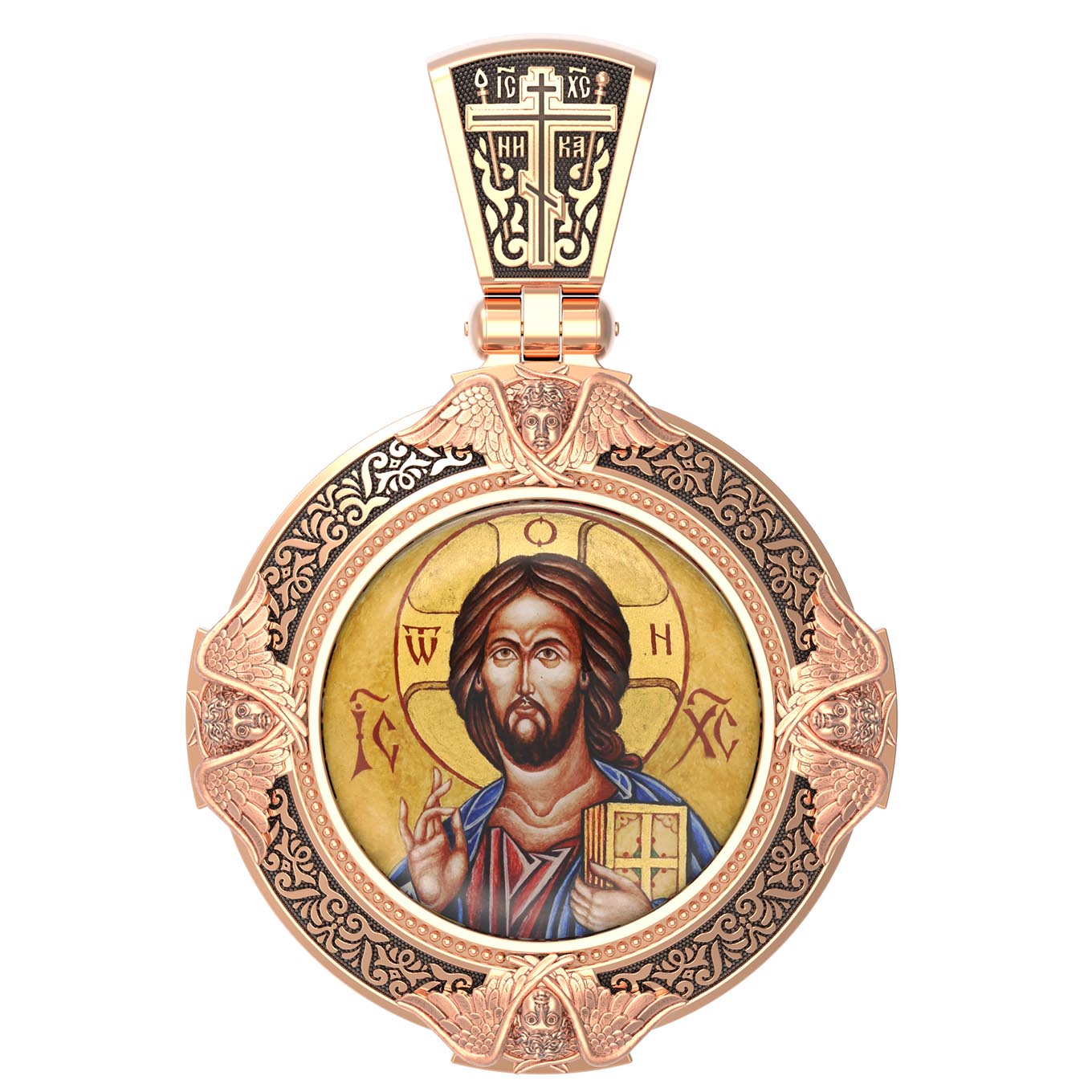 На лицевой стороне образка изображена икона Господа и Спасителя нашего Иисуса Христа — Господь Вседержитель или Пантократор (от греч. всевластный, всесильный). Он представлен как Царь Небесный и будущий Судия мира. Именование Иисуса «Вседержителем» указывает, с одной стороны, на Его Божественную природу: «Аз есмь Альфа и Омега, начало и конец, говорит Господь, Который есть и был и грядет, Вседержитель» (Откр. 1: 8). С другой стороны, такое именование связано и с человеческой природой Христа, искупившего крестной жертвой людские грехи и обновившего тем самым человеческую природу. Господь Иисусь Христос изображен фронтально огрудно. Главу Спасителя осеняет нимб, на нем угадывается крест. Крест символизирует голгофскую жертву Спасителя. По греческой традиции, на нимбе написаны буквы Омега, Омикрон, Ню — вместе они обозначают слово Сущий, одно из имен и характеристику Бога, согласно Священному Писанию. Правой рукой Он благословляет, а левой держит Евангелие — благую весть, принесенную Христом всему миру. Также означает она тот новый мир, который будет сотворен Богом после второго пришествия Христа. Символизирует и Книгу Жизни, где записаны имена всех, возлюбивших Бога. Всемогущий Бог предстает здесь не как обличающий судья, а как милостивый отец, ждущий возвращения блудных детей.