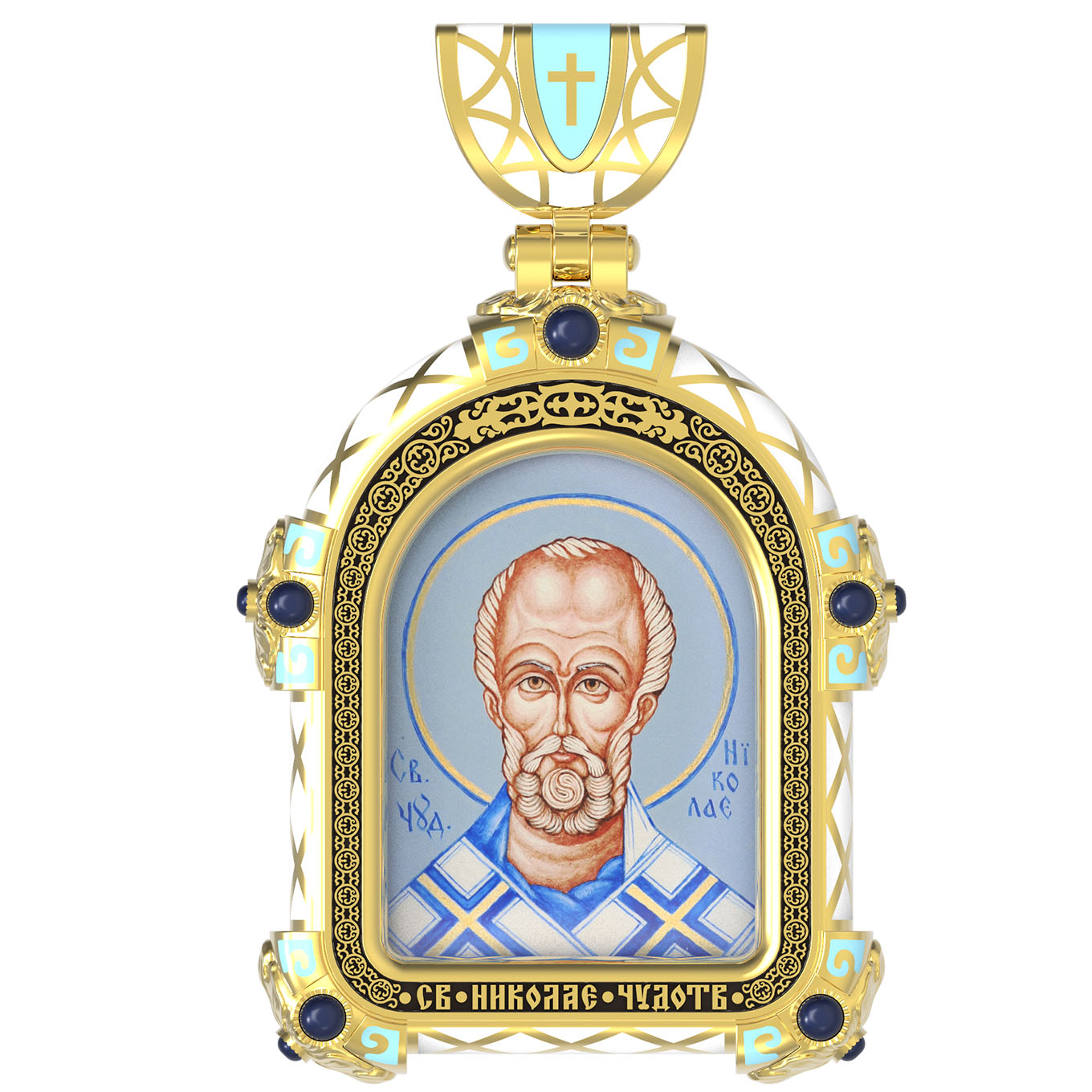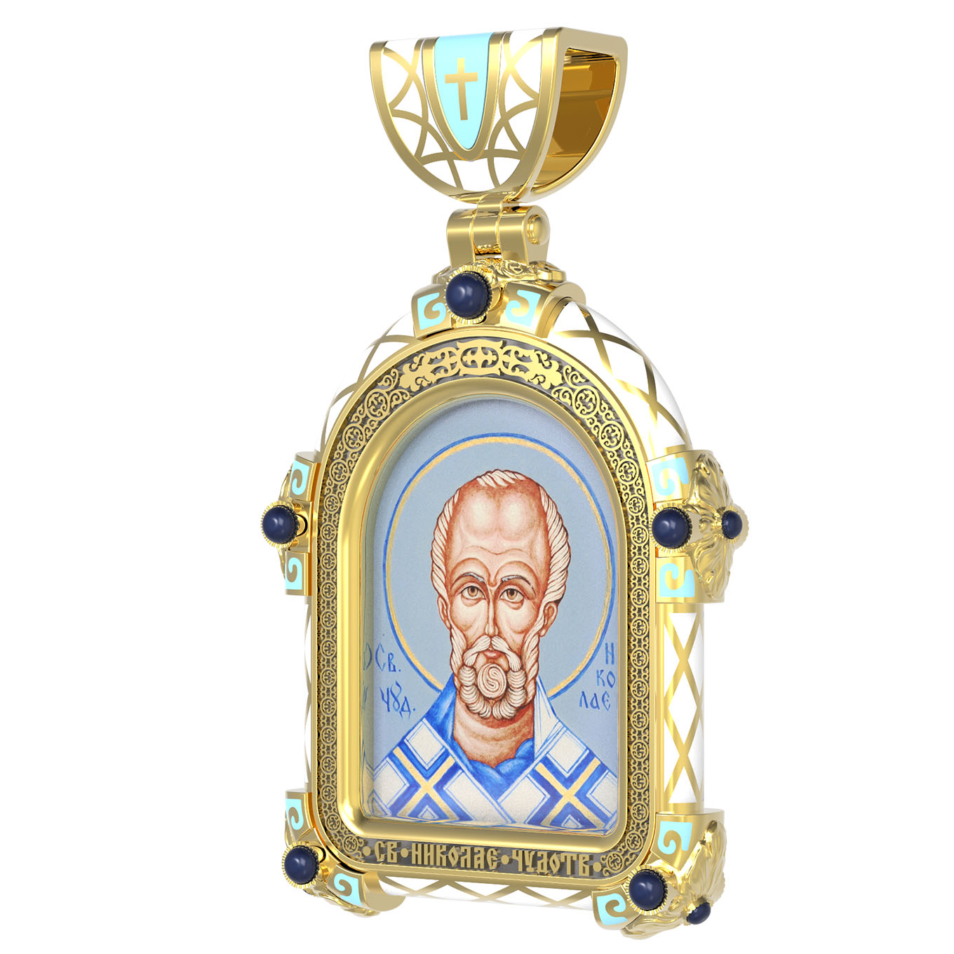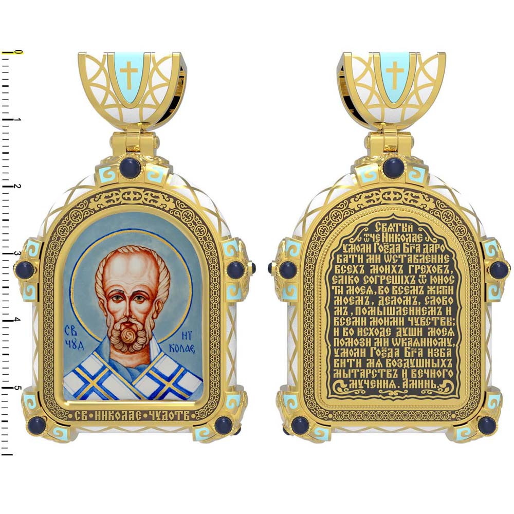 На лицевой стороне образка изображен Святитель Николай архиепископ Мир Ликийских, Чудотворец. Он является одним из самых известных на Руси святых, издревле считающийся помощником и молитвенником за всех, притекающих к нему. Чудес его исчислить невозможно. Николай Чудотворец подавал многим исцеления в болезнях и телесных недугах, обогащал бедствующих в крайней нищете, подавал голодным пищу, спасал от потопления, освобождал из плена и избавлял от смерти.