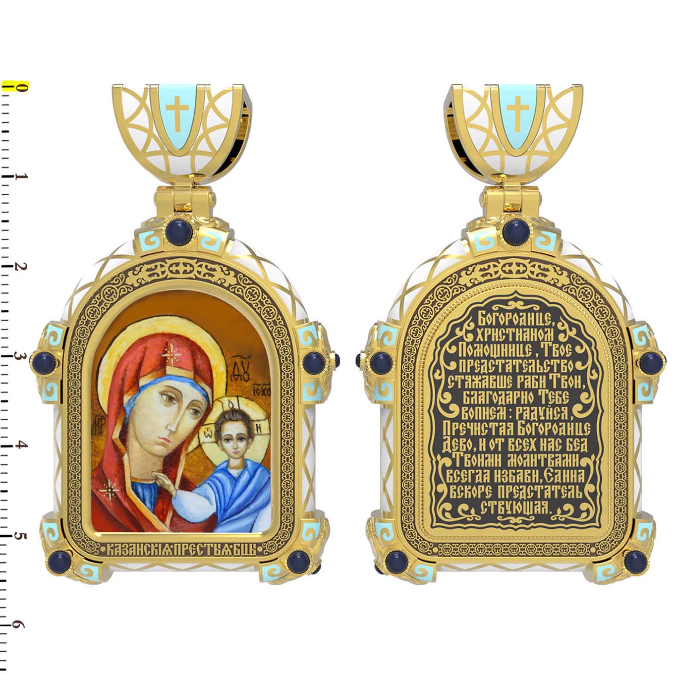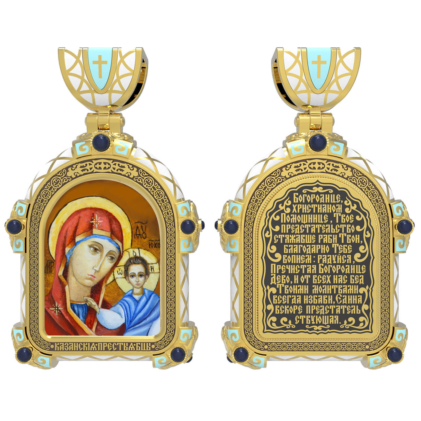 На лицевой стороне образка изображена Казанская икона Божией Матери. Пресвятая Богородица — милосердная заступница, просительница за нас перед Богом. Она стала воистину нашей Матушкой, охраняющей и поддерживающей нас от рождения до самой смерти, а Ее благодатная помощь изливается на нас по молитвам у ее чудотворных икон. Казанская икона явилась в 1579 году в Казани, вскоре после взятия Казанского царства у татар Иоанном Грозным. Этот образ Богородицы не раз сопровождал русский народ в бедствиях. Икона Божией Матери Казанская вдохновляла русских ратников в период Смутного времени при освобождении Москвы от поляков. Перед Казанской иконой в 1709 году, накануне Полтавской победы, император Петр I молился о даровании победы русскому войску. В 1812 году накануне отъезда в действующую армию перед чудотворной иконой Божией Матери молился князь Михаил Кутузов. Не только государственным мужам и дружинам указывала путь икона — по доброй традиции именно этой иконой благословляют на брак молодых родители, длинным списком чудес сопровождается этот образ Богоматери — один из самых любимых на Руси. Существует множество древних списков с этой удивительной иконы. На кулонном кольце изображен Спас Нерукотворный — образ Господа и Спасителя нашего Иисуса Христа, чудесно отпечатавшийся на плате, котором Христос вытер свой лик.