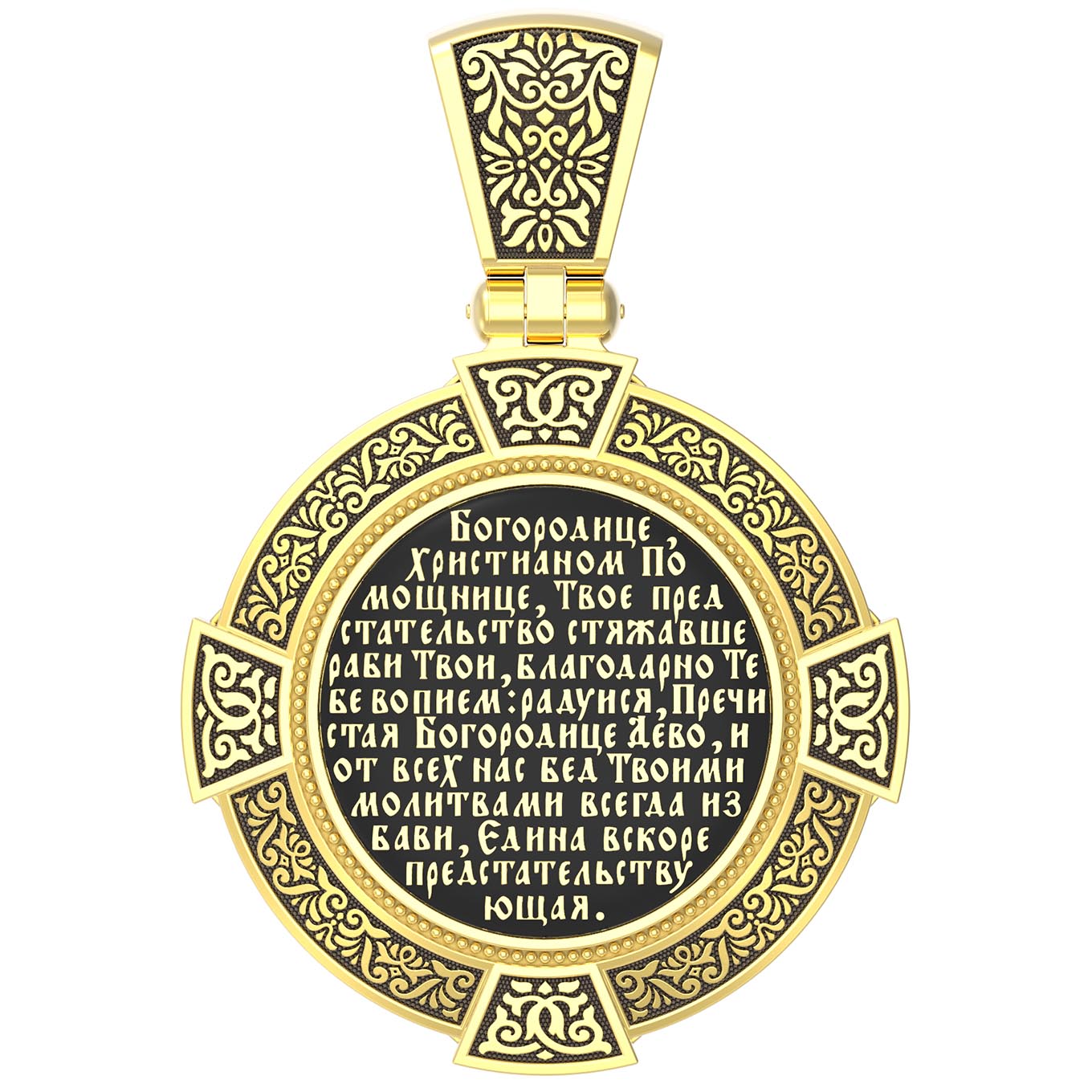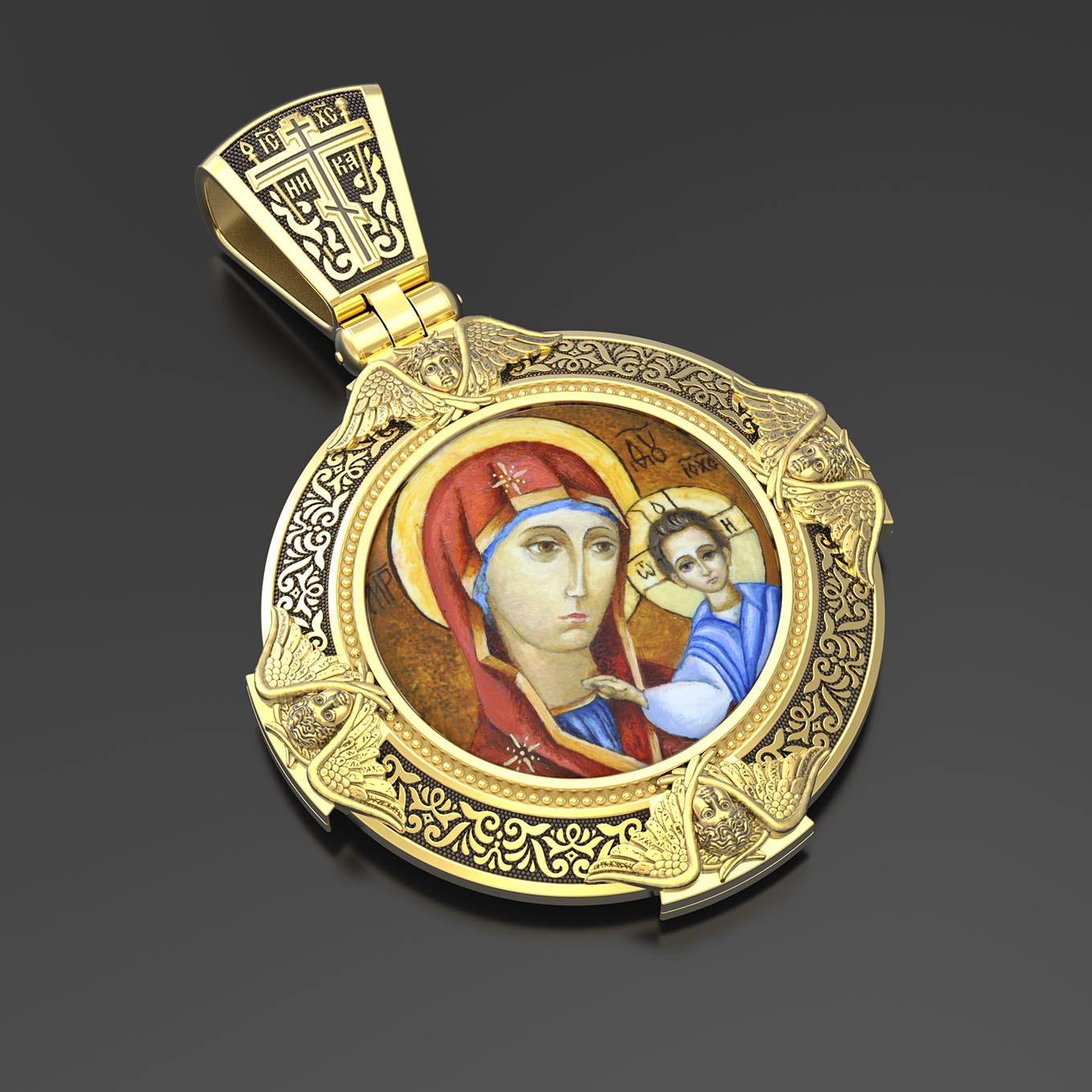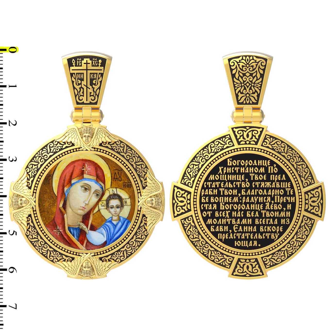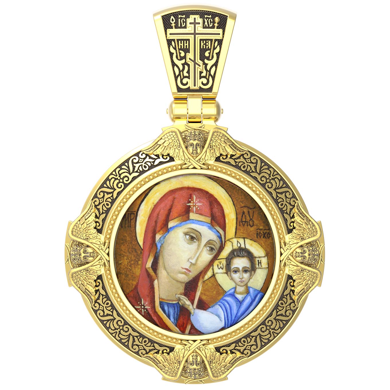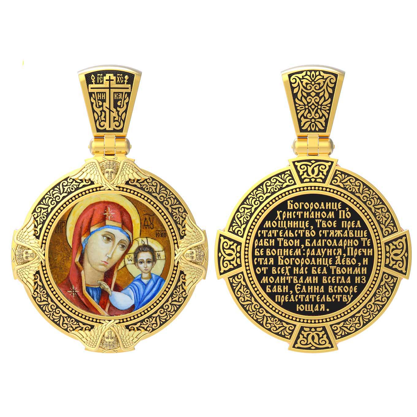 На лицевой стороне образка изображена Казанская икона Божией Матери. Пресвятая Богородица — милосердная заступница, просительница за нас перед Богом. Она стала воистину нашей Матушкой, охраняющей и поддерживающей нас от рождения до самой смерти, а Ее благодатная помощь изливается на нас по молитвам у ее чудотворных икон. Казанская икона явилась в 1579 году в Казани, вскоре после взятия Казанского царства у татар Иоанном Грозным. Этот образ Богородицы не раз сопровождал русский народ в бедствиях. Икона Божией Матери Казанская вдохновляла русских ратников в период Смутного времени при освобождении Москвы от поляков. Перед Казанской иконой в 1709 году, накануне Полтавской победы, император Петр I молился о даровании победы русскому войску. В 1812 году накануне отъезда в действующую армию перед чудотворной иконой Божией Матери молился князь Михаил Кутузов. Не только государственным мужам и дружинам указывала путь икона — по доброй традиции именно этой иконой благословляют на брак молодых родители, длинным списком чудес сопровождается этот образ Богоматери — один из самых любимых на Руси. Существует множество древних списков с этой удивительной иконы. На кулонном кольце изображен Спас Нерукотворный — образ Господа и Спасителя нашего Иисуса Христа, чудесно отпечатавшийся на плате, котором Христос вытер свой лик.
