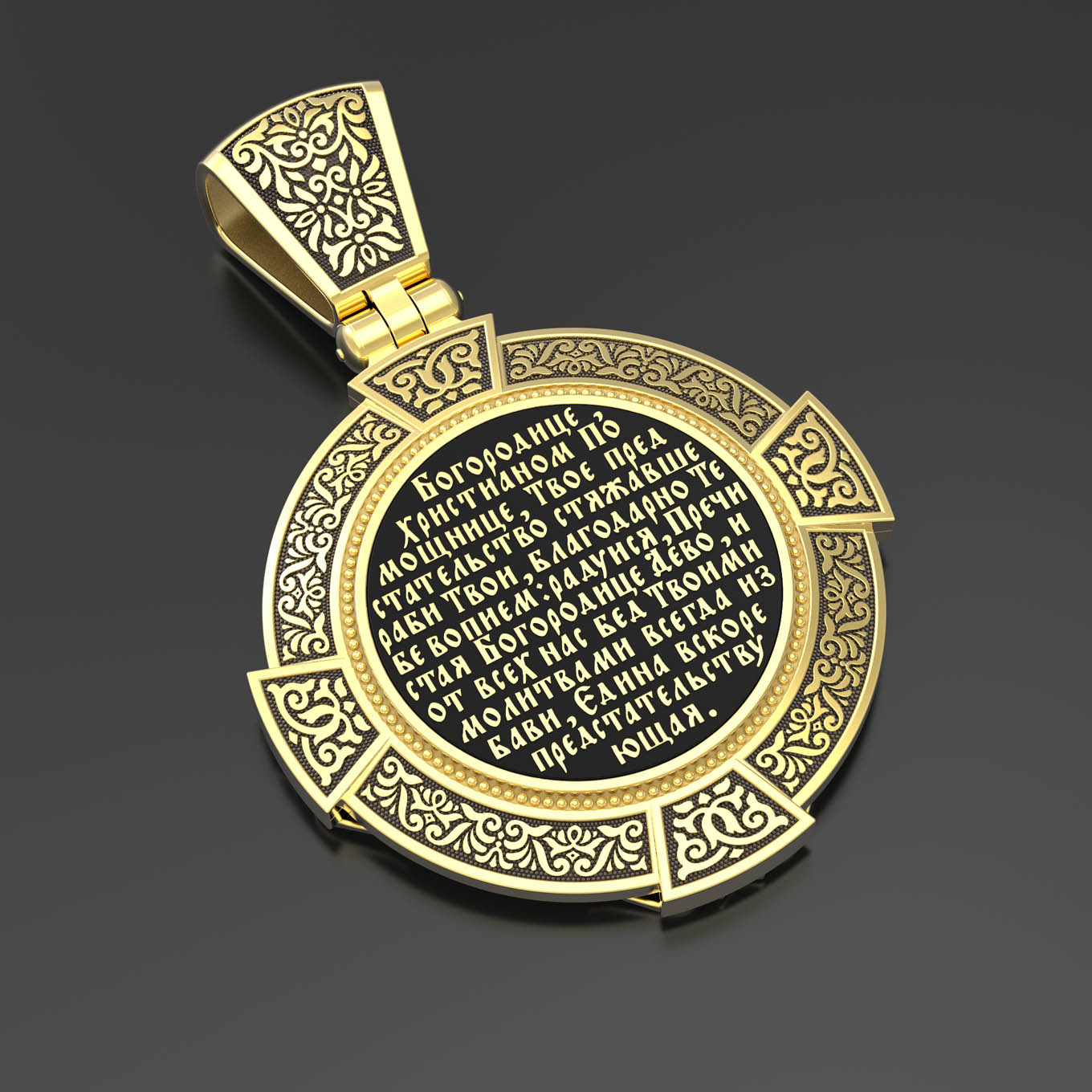 На лицевой стороне образка изображена Владимирская икона Божией Матери — одна из самых чтимых святынь Русской православной церкви. По преданию, икона была написана Святым апостолом и евангелистом Лукой во время земной жизни Богородицы. Дева Мария, увидев Свое изображение, молвила: «Отныне ублажат Мя вси роди. Благодать Рождшегося от Меня и Моя с сим образом да будет». Образ написан в лирическом иконографическом типе «Умиление». Младенец припал щекой к щеке Матери и тянется к ней правой рукой, другой нежно обнимая за шею. Икона вплоть до V века находилась в Иерусалиме, затем была перевезена в Византию. На Русь икона была привезена в 1131 г. За прошедшие столетия святыня неоднократно переезжала из Владимира в Москву и обратно, не раз спасая страну от захватчиков. Русская Православная Церковь установила троекратное празднование Владимирской иконе Божьей Матери. Каждый из дней празднования связан с избавлением русского народа от порабощения иноплеменниками по молитвам ко Пресвятой Богородице. В последующие века у иконы происходили многие важные исторические события: подписание актов, принятие присяги значимых государственных деятелей и возведение на престол. На кулонном кольце изображен Спас Нерукотворный — образ Господа и Спасителя нашего Иисуса Христа, чудесно отпечатавшийся на плате, котором Христос вытер свой лик.