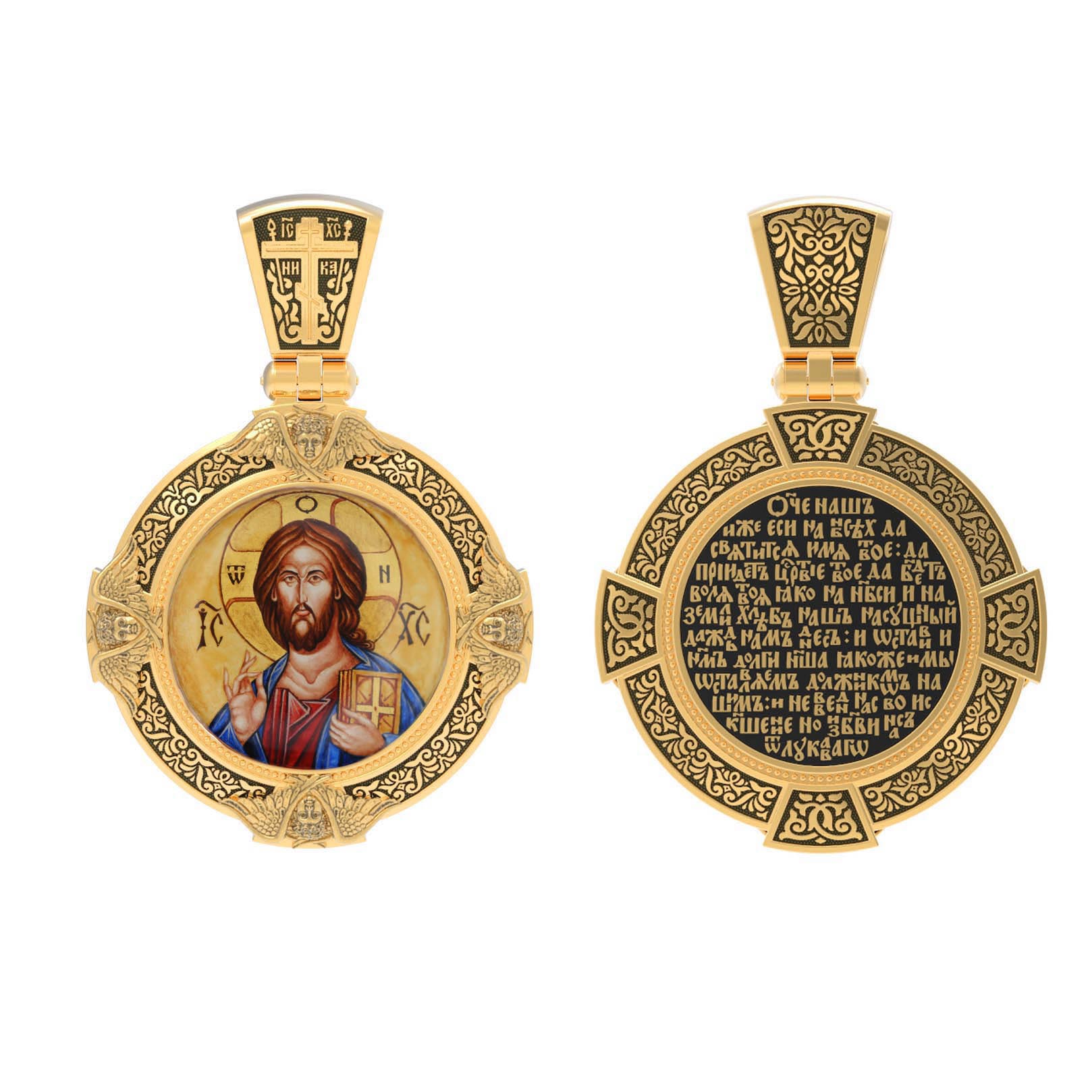 На лицевой стороне образка изображена икона Господа и Спасителя нашего Иисуса Христа — Господь Вседержитель или Пантократор (от греч. всевластный, всесильный). Он представлен как Царь Небесный и будущий Судия мира. Именование Иисуса «Вседержителем» указывает, с одной стороны, на Его Божественную природу: «Аз есмь Альфа и Омега, начало и конец, говорит Господь, Который есть и был и грядет, Вседержитель» (Откр. 1: 8). С другой стороны, такое именование связано и с человеческой природой Христа, искупившего крестной жертвой людские грехи и обновившего тем самым человеческую природу. Господь Иисусь Христос изображен фронтально огрудно. Главу Спасителя осеняет нимб, на нем угадывается крест. Крест символизирует голгофскую жертву Спасителя. По греческой традиции, на нимбе написаны буквы Омега, Омикрон, Ню — вместе они обозначают слово Сущий, одно из имен и характеристику Бога, согласно Священному Писанию. Правой рукой Он благословляет, а левой держит Евангелие — благую весть, принесенную Христом всему миру. Также означает она тот новый мир, который будет сотворен Богом после второго пришествия Христа. Символизирует и Книгу Жизни, где записаны имена всех, возлюбивших Бога. Всемогущий Бог предстает здесь не как обличающий судья, а как милостивый отец, ждущий возвращения блудных детей.