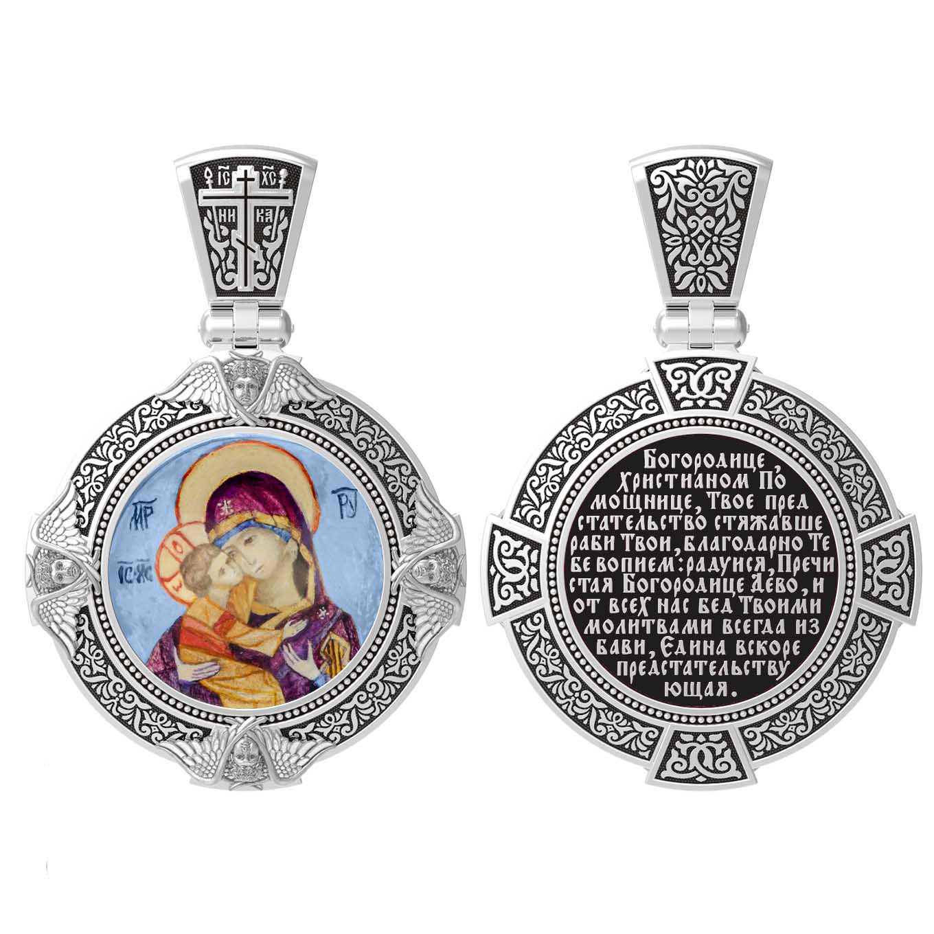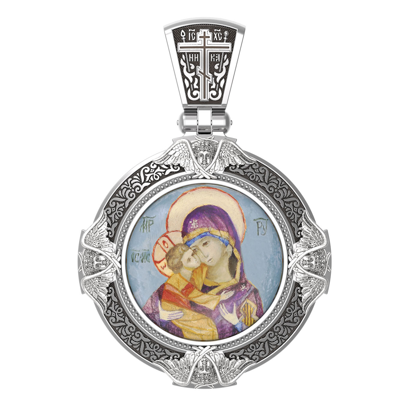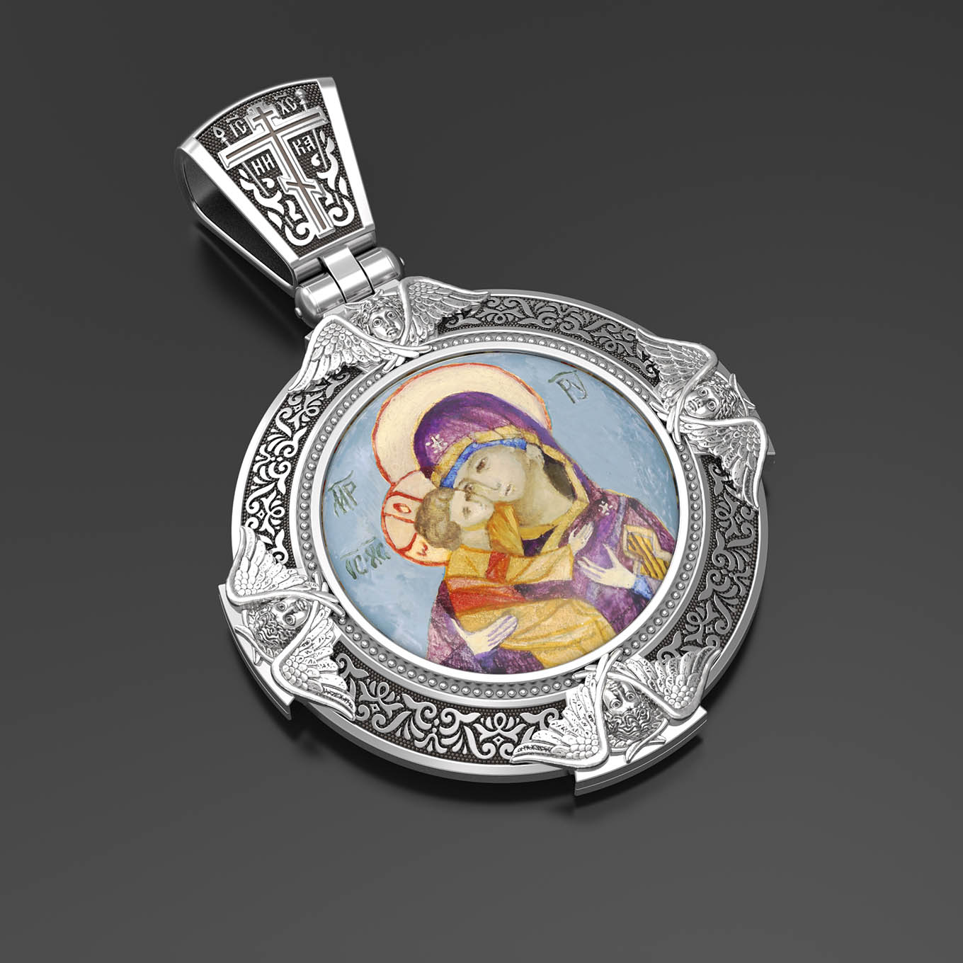 На лицевой стороне образка изображена Владимирская икона Божией Матери — одна из самых чтимых святынь Русской православной церкви. По преданию, икона была написана Святым апостолом и евангелистом Лукой во время земной жизни Богородицы. Дева Мария, увидев Свое изображение, молвила: «Отныне ублажат Мя вси роди. Благодать Рождшегося от Меня и Моя с сим образом да будет». Образ написан в лирическом иконографическом типе «Умиление». Младенец припал щекой к щеке Матери и тянется к ней правой рукой, другой нежно обнимая за шею. Икона вплоть до V века находилась в Иерусалиме, затем была перевезена в Византию. На Русь икона была привезена в 1131 г. За прошедшие столетия святыня неоднократно переезжала из Владимира в Москву и обратно, не раз спасая страну от захватчиков. Русская Православная Церковь установила троекратное празднование Владимирской иконе Божьей Матери. Каждый из дней празднования связан с избавлением русского народа от порабощения иноплеменниками по молитвам ко Пресвятой Богородице. В последующие века у иконы происходили многие важные исторические события: подписание актов, принятие присяги значимых государственных деятелей и возведение на престол. На кулонном кольце изображен Спас Нерукотворный — образ Господа и Спасителя нашего Иисуса Христа, чудесно отпечатавшийся на плате, котором Христос вытер свой лик.