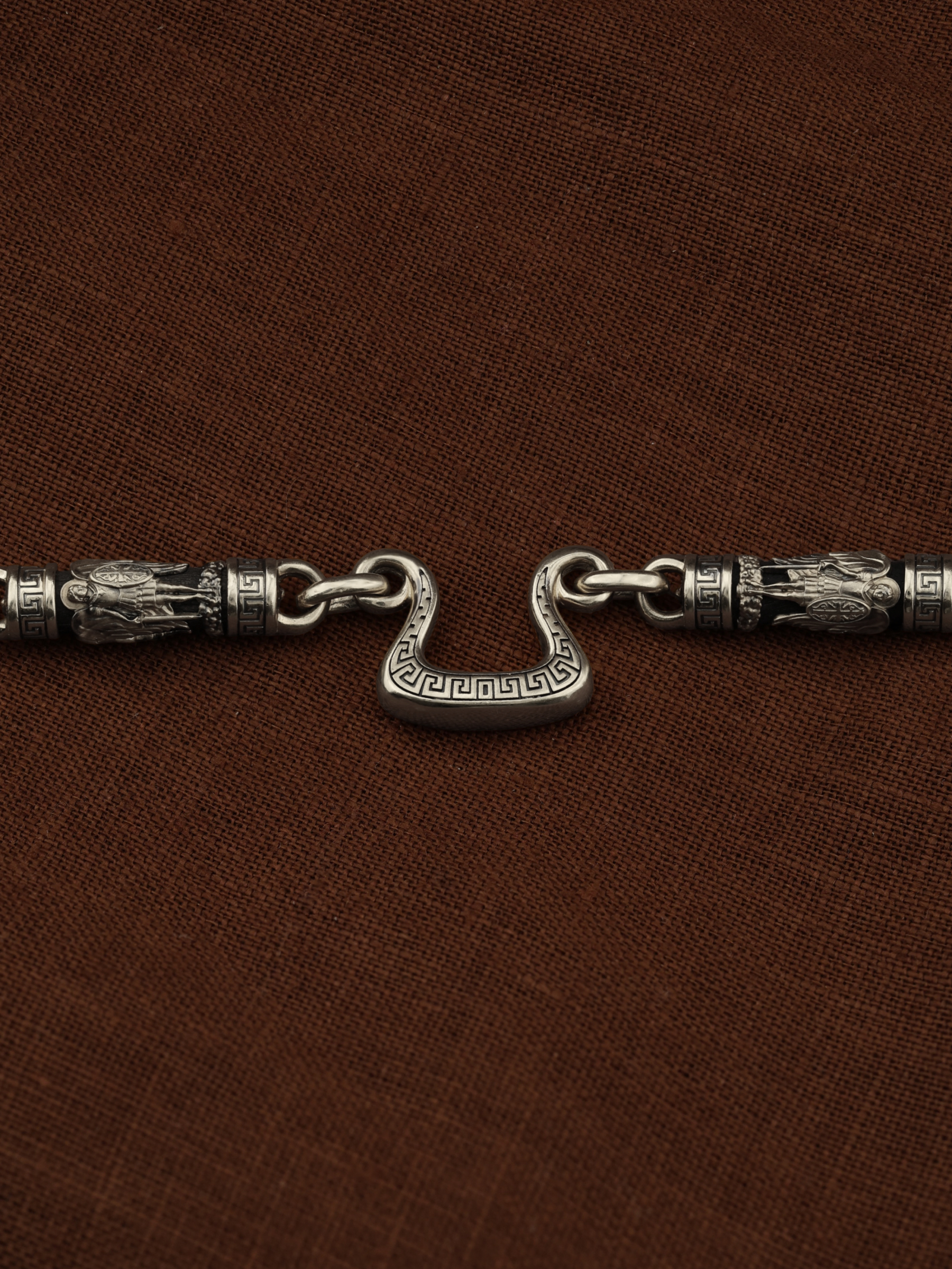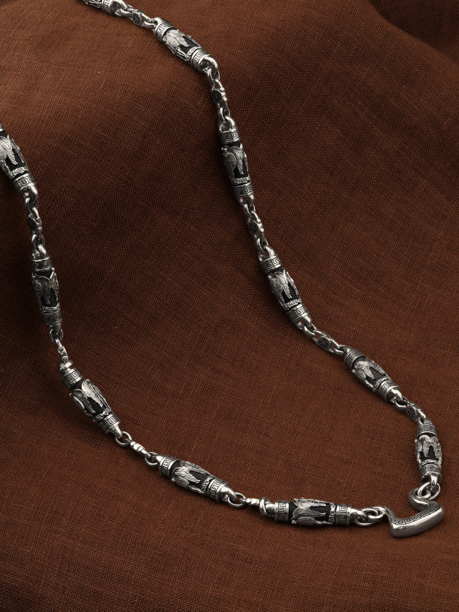 На звеньях цепи изображена Хризма — монограмма имени Христа, которая состоит из двух начальных греческих букв имени — Х (хи) и Р (ро), скрещённых между собой. По краям монограммы помещены греческие буквы a и w. Такое употребление этих букв восходит к тексту Апокалипсиса: «Аз есмь Альфа и Омега, начало и конец, говорит Господь, Который есть и был и грядет, Вседержитель.» (Откр. 1:8; см. также Откр. 22:13). Также на звеньях изображен Святой Ангел-Хранитель в виде прекрасного юноши держащего в правой руке мечь, а в левой — щит. Ангел-Хранитель — это Ангел приставляемый Богом к человеку при крещении для охраны и помощи в добрых делах. Он невидимо находится при человеке на протяжении всей его жизни, если человек сохраняет в себе любовь к Богу и истинную веру перед Ним. Ангел-Xранитель делают для нас все, что служит к истинному нашему благу и спасению. Невидимо пребывая при нас постоянно, он, руководствуя нас ко спасению, не только по нашему желанию таинственно наставляет нас на все доброе и полезное, не только возносит наши молитвы к Богу, но еще и сам от себя охраняют и защищают нас от врагов видимых и невидимых и ходатайствует за нас пред Богом. Ангел-Хранитель так любит нас, как никто на земле любить не может. Одного лишь каждому из нас он желает — спасения души; к этому он направляет все свои заботы. И если видит нас также заботящимися о спасении, радуется, если же видит нас пребывающими в нерадении о душе своей, скорбит. Но и самый великий грешник может примириться со своим Ангелом-Хранителем посредством искреннего раскаяния в грехах и оставления их навсегда. В таком случае, по слову Писания, великая радость бывает для всех ангелов на небесах (Лк. 15:10). Цепь украшена орнаментом.