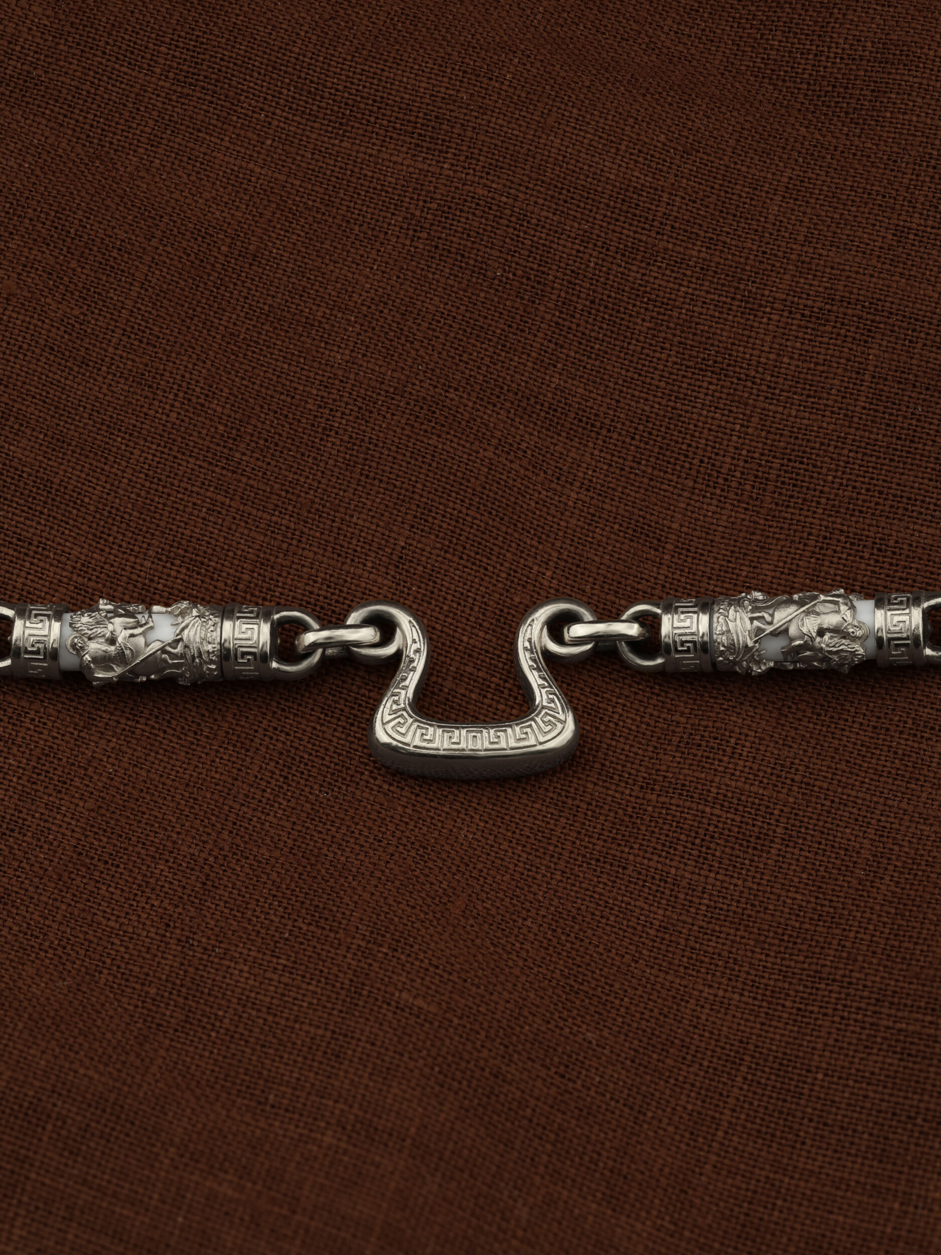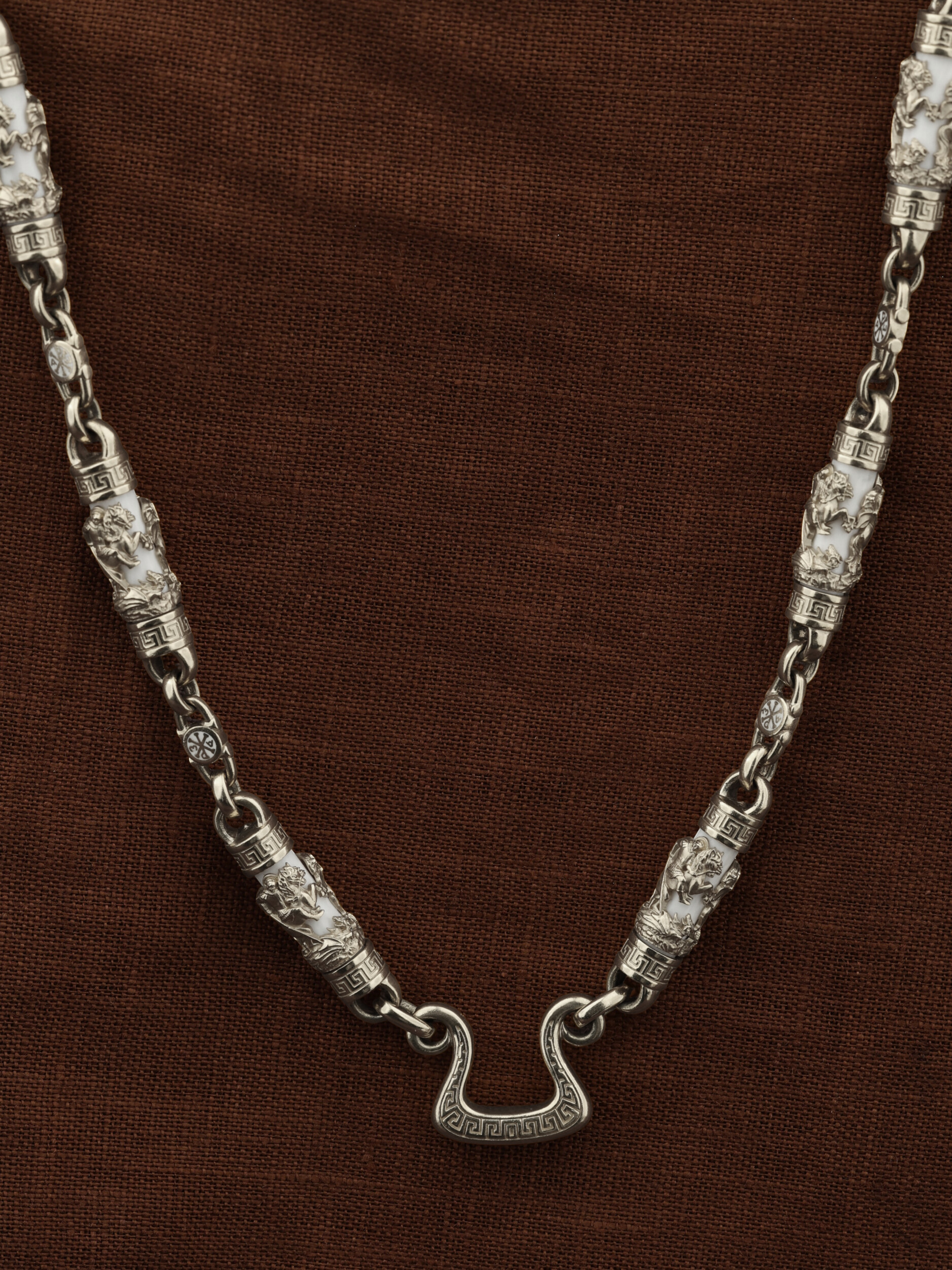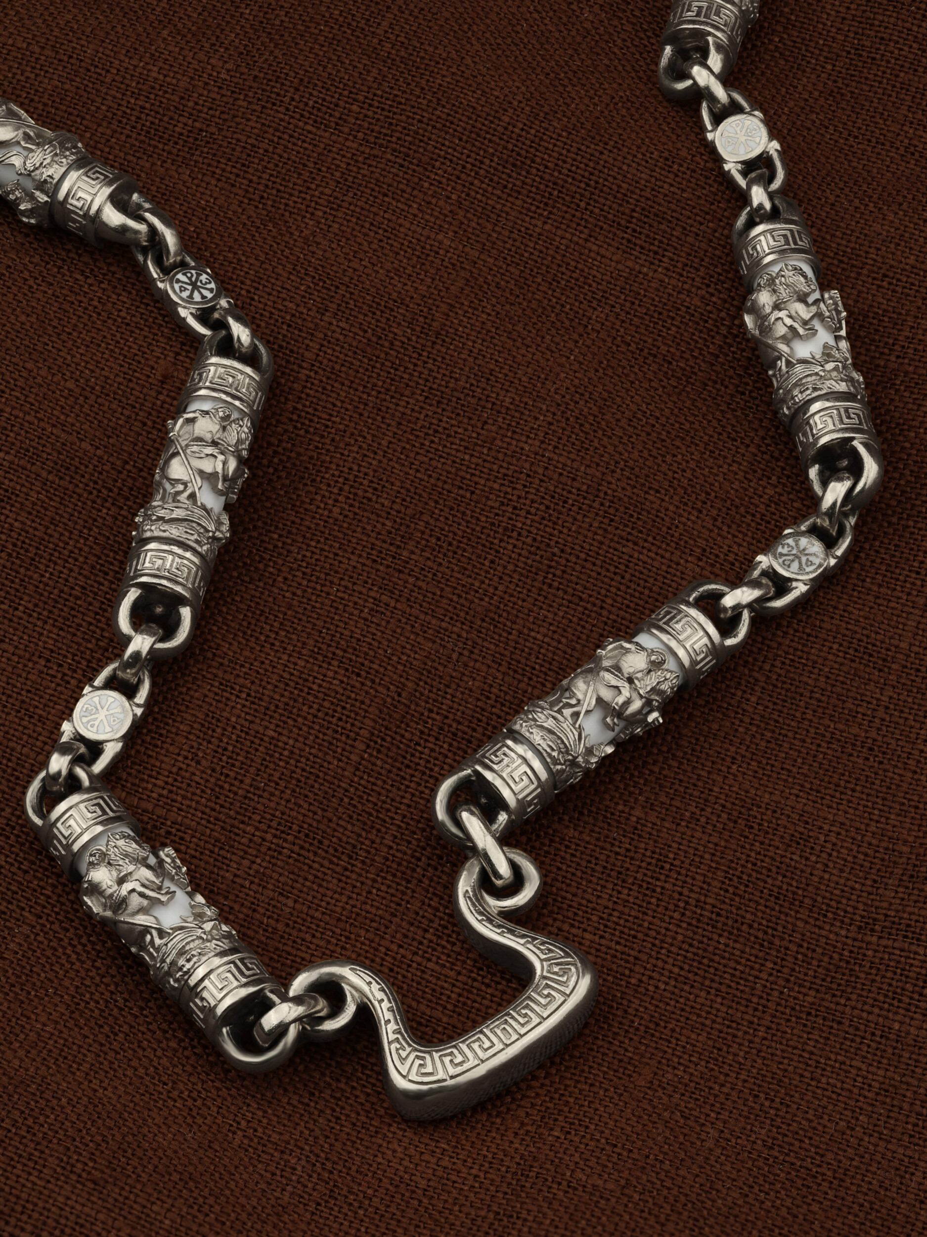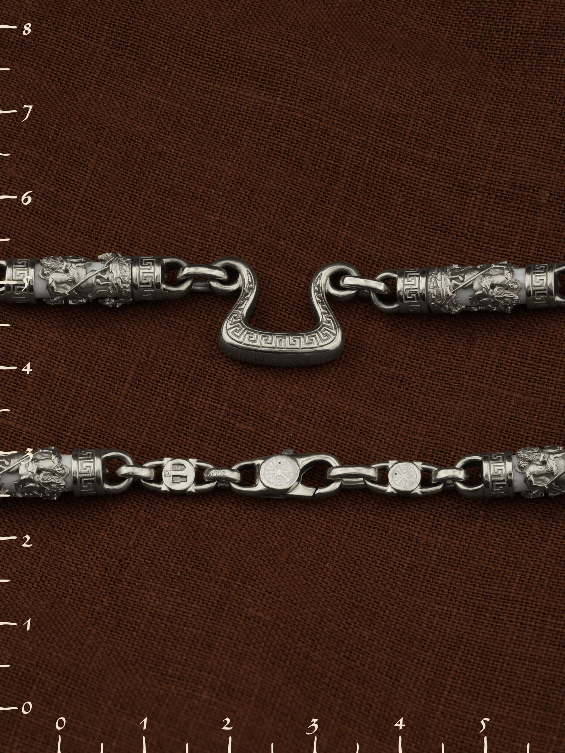 На звеньях цепи изображена Хризма — монограмма имени Христа, которая состоит из двух начальных греческих букв имени — Х (хи) и Р (ро), скрещённых между собой. По краям монограммы помещены греческие буквы a и w. Такое употребление этих букв восходит к тексту Апокалипсиса: «Аз есмь Альфа и Омега, начало и конец, говорит Господь, Который есть и был и грядет, Вседержитель.» (Откр. 1:8; см. также Откр. 22:13). Также на звеньях цепи помещено изображен святого великомученика Георгия Победоносца — одного из самых почитаемых и удивительных святых. Георгий родился в Каппадокии (Малая Азия) в семье богатых и знатных горожан. Юношей поступил на службу к римскому императору Диоклетиану, за отличное знание военного дела и проявленную в боях и походах храбрость был приближен к императору и удостоен высокого воинского звания. Во время начавшихся гонений на христиан, перешел на сторону гонимых и, отвергнув человеческий страх, стал ярым проповедником учения Христа. Мучители подвергли опального воеводу жесточайшим восьмидневным пыткам и казнили его (обезглавили) в возрасте около тридцати лет в 303 году. На Руси он известен как Юрий или Егорий, заступник для верующих, чья жизнь имеет какое-либо отношение к военным делам, помощник в крестьянском труде. На цепи Георгий изображен как воитель, сидящий на вздыбленном коне и поражающий копьем огнедышащего змея. Змей символизирует собою сатанинские силы. Молитвами вознесенными к Всевышнему и своей непреклонной верой он смог одолеть чудовище. Святой убил змея, спас царскую дочь, принесенную в жертву, и жителей города, их души от влияния дьявола, породив в них надежду и веру в Господа, призывая людей принять христианскую веру. Цепь украшена орнаментом.