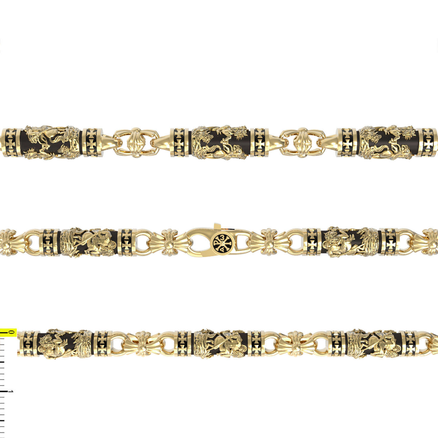 На звеньях цепи помещено изображение святого великомученика Георгия Победоносца — одного из самых почитаемых и удивительных святых. Георгий родился в Каппадокии (Малая Азия) в семье богатых и знатных горожан. Юношей поступил на службу к римскому императору Диоклетиану, за отличное знание военного дела и проявленную в боях и походах храбрость был приближен к императору и удостоен высокого воинского звания. Во время начавшихся гонений на христиан, перешел на сторону гонимых и, отвергнув человеческий страх, стал ярым проповедником учения Христа. Мучители подвергли опального воеводу жесточайшим восьмидневным пыткам и казнили его (обезглавили) в возрасте около тридцати лет в 303 году. На Руси он известен как Юрий или Егорий, заступник для верующих, чья жизнь имеет какое-либо отношение к военным делам, помощник в крестьянском труде. На цепи Георгий изображен как воитель, сидящий на вздыбленном коне и поражающий копьем огнедышащего змея. Змей символизирует собою сатанинские силы. Молитвами вознесенными к Всевышнему и своей непреклонной верой он смог одолеть чудовище. Святой убил змея, спас царскую дочь, принесенную в жертву, и жителей города, их души от влияния дьявола, породив в них надежду и веру в Господа, призывая людей принять христианскую веру.. На замке цепи изображена Хризма — монограмма имени Христа, которая состоит из двух начальных греческих букв имени — Х (хи) и Р (ро), скрещённых между собой. По краям монограммы помещены греческие буквы a и w. Такое употребление этих букв восходит к тексту Апокалипсиса: «Аз есмь Альфа и Омега, начало и конец, говорит Господь, Который есть и был и грядет, Вседержитель.» (Откр. 1:8; см. также Откр. 22:13).