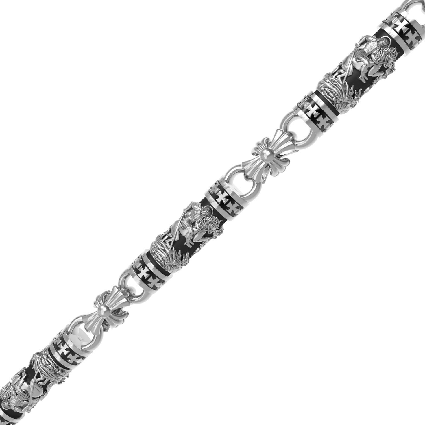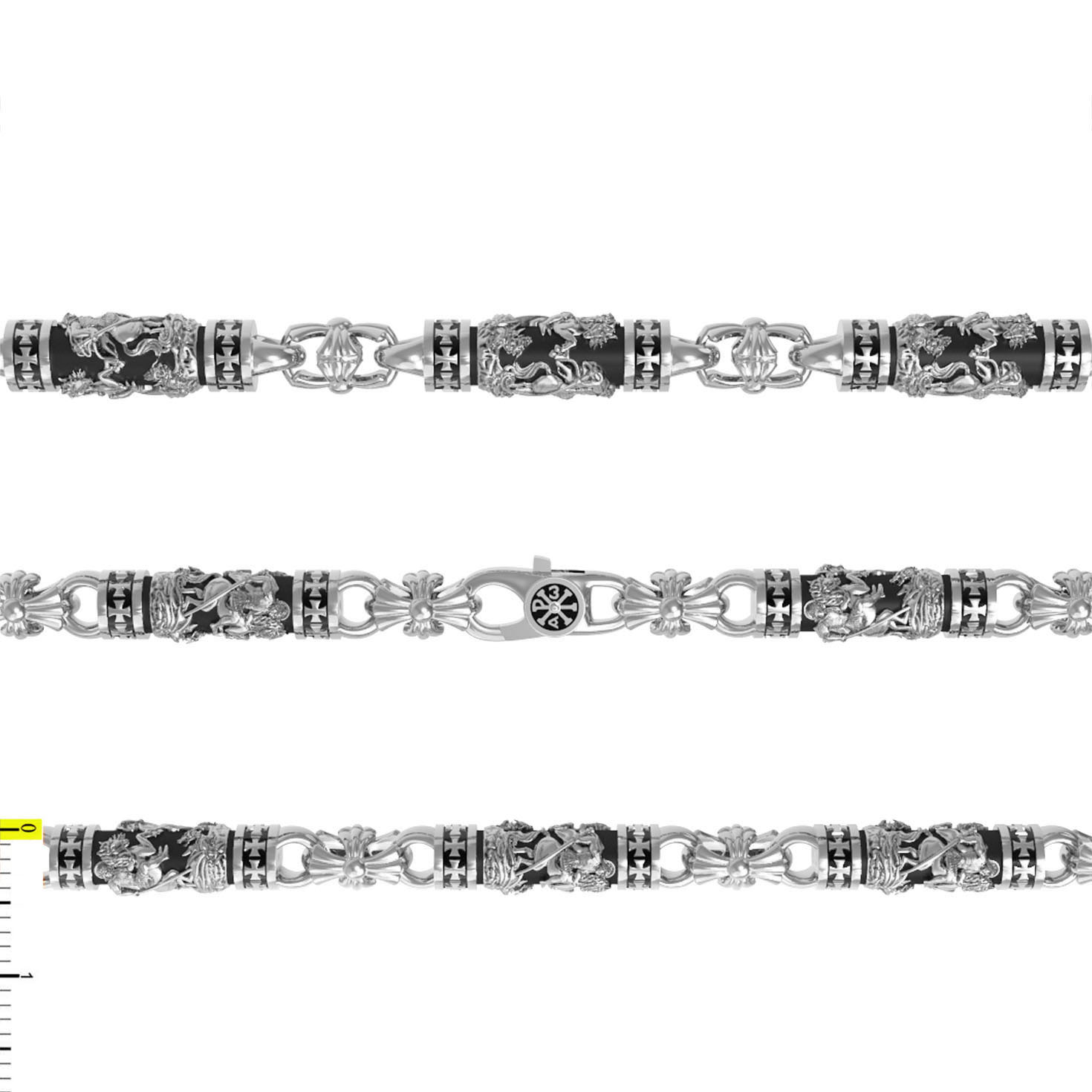 На звеньях цепи помещено изображение святого великомученика Георгия Победоносца — одного из самых почитаемых и удивительных святых. Георгий родился в Каппадокии (Малая Азия) в семье богатых и знатных горожан. Юношей поступил на службу к римскому императору Диоклетиану, за отличное знание военного дела и проявленную в боях и походах храбрость был приближен к императору и удостоен высокого воинского звания. Во время начавшихся гонений на христиан, перешел на сторону гонимых и, отвергнув человеческий страх, стал ярым проповедником учения Христа. Мучители подвергли опального воеводу жесточайшим восьмидневным пыткам и казнили его (обезглавили) в возрасте около тридцати лет в 303 году. На Руси он известен как Юрий или Егорий, заступник для верующих, чья жизнь имеет какое-либо отношение к военным делам, помощник в крестьянском труде. На цепи Георгий изображен как воитель, сидящий на вздыбленном коне и поражающий копьем огнедышащего змея. Змей символизирует собою сатанинские силы. Молитвами вознесенными к Всевышнему и своей непреклонной верой он смог одолеть чудовище. Святой убил змея, спас царскую дочь, принесенную в жертву, и жителей города, их души от влияния дьявола, породив в них надежду и веру в Господа, призывая людей принять христианскую веру.. На замке цепи изображена Хризма — монограмма имени Христа, которая состоит из двух начальных греческих букв имени — Х (хи) и Р (ро), скрещённых между собой. По краям монограммы помещены греческие буквы a и w. Такое употребление этих букв восходит к тексту Апокалипсиса: «Аз есмь Альфа и Омега, начало и конец, говорит Господь, Который есть и был и грядет, Вседержитель.» (Откр. 1:8; см. также Откр. 22:13).