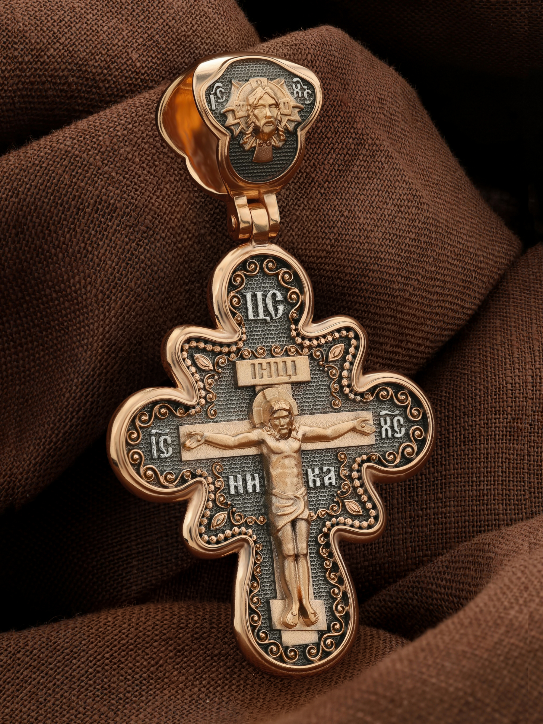 На лицевой стороне креста изображено Распятие Господа и Спасителя нашего Иисуса Христа. Крест- символ спасения и искупления рода человеческого, знамение победы над смертью и адом. Иисус Христос, как искупительная жертва освобождения человечества от власти греха, умер крестной смертью и в третий день воскрес. Над Распятием помещена надпись «Царь Славы». На верхней табличке, выше головы Иисуса, расположена надпись, составленная Понтием Пилатом — «IНЦI». Она означает «Иисус Назорей, Царь Иудейский». Надпись «IC» «ХC», означает Иисус Христос, помещается на разных сторонах поперечной перекладины креста. Рядом — слово «НИКА», что означает «победитель». На кулонном кольце изображен Нерукотворный образ Господа и Спасителя нашего Иисуса Христа, чудесно отпечатавшийся на плате, которым Христос вытер свой лик.