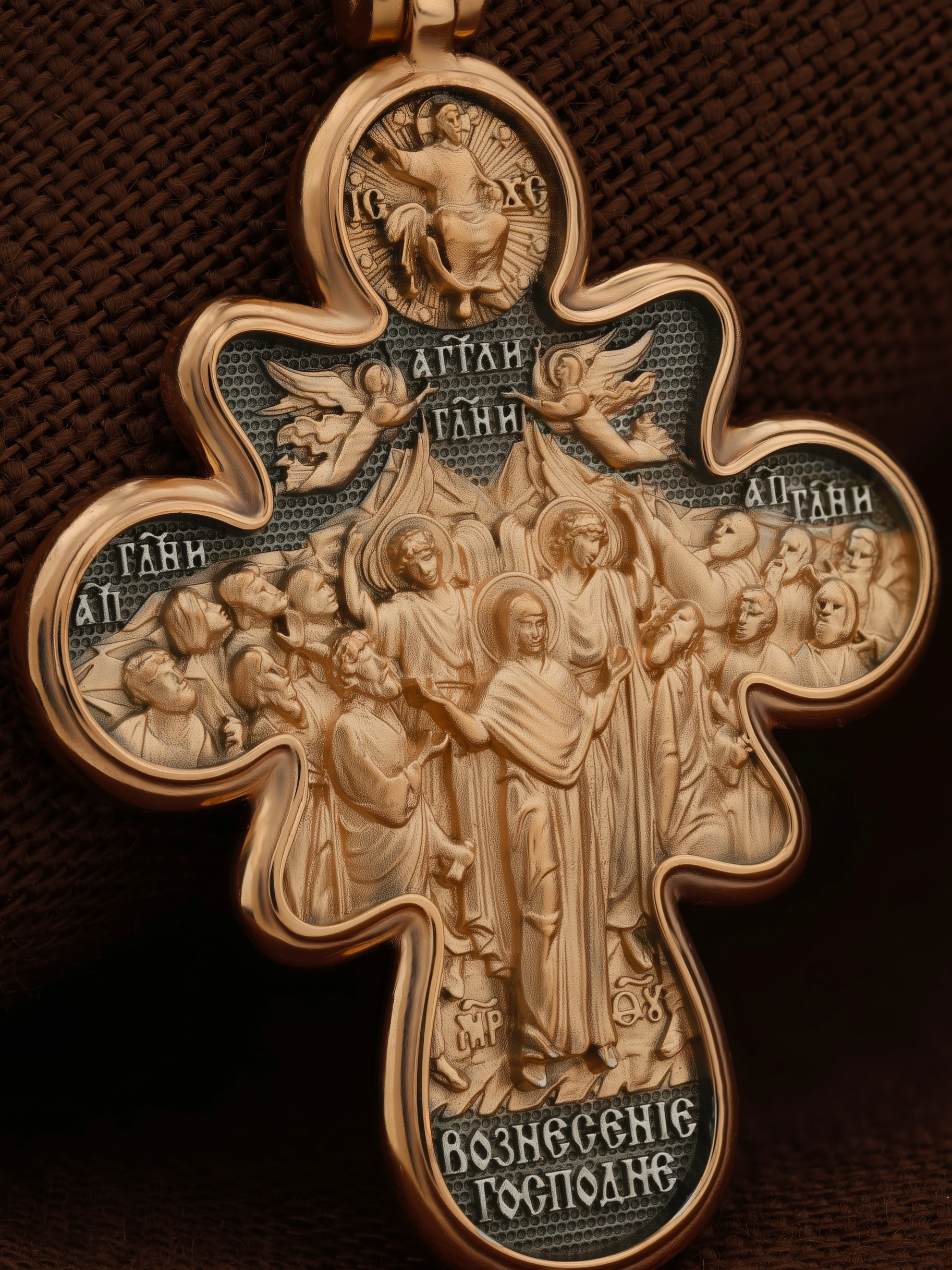 На оборотной стороне креста изображена икона Вознесение Господне. Описание события Вознесения Христова содержится в Евангелиях от Луки (Лк. 24, 50−51) и Марка (Мк. 16, 19), а также в Деяниях свв. апостолов (Деян 1, 9−11). Согласно этим повествованиям, после Своего Воскресения из мертвых Спаситель неоднократно являлся ученикам, чтобы удостоверить их в истинности Своего телесного Воскресения, укрепить в них веру и подготовить к принятию обетованного Святого Духа (Ин. 16, 7). На сороковой день после Своего Воскресения Господь Иисус Христос вывел учеников, собранных в Иерусалиме, из города в Вифанию, на гору Елеон (Деян. 1, 12). Здесь, после благословения апостолов, Он стал отдаляться от них и возноситься на небо. В Деяниях св. апостолов также упомянуто, что во время Вознесения Христова явились «два мужа в белой одежде», которые возвестили Его Второе пришествие: «Мужи галилейские! Что вы стоите и смотрите на небо? Сей Иисус, вознесшийся от вас на небо, придет таким же образом, как вы видели его восходящим на небо» (Деян. 1, 11). После Вознесения Господня ученики с радостью вернулись в Иерусалим (Лк. 24, 52), ожидая сошествия на них Святого Духа, которое произошло через несколько дней (Деян. 2, 1−4). На кулонном кольце изображен шестикрылый Ангел — Серафим.