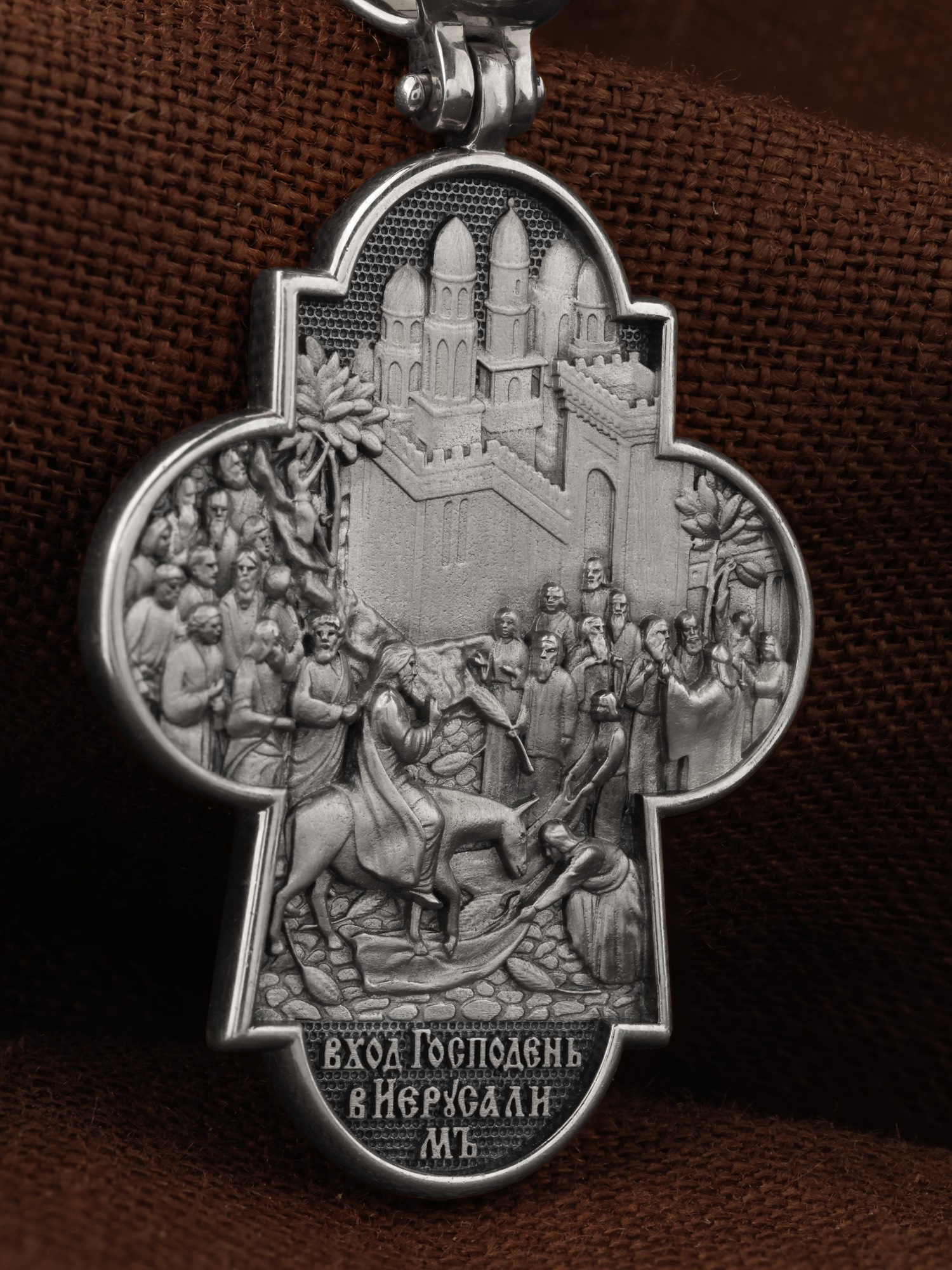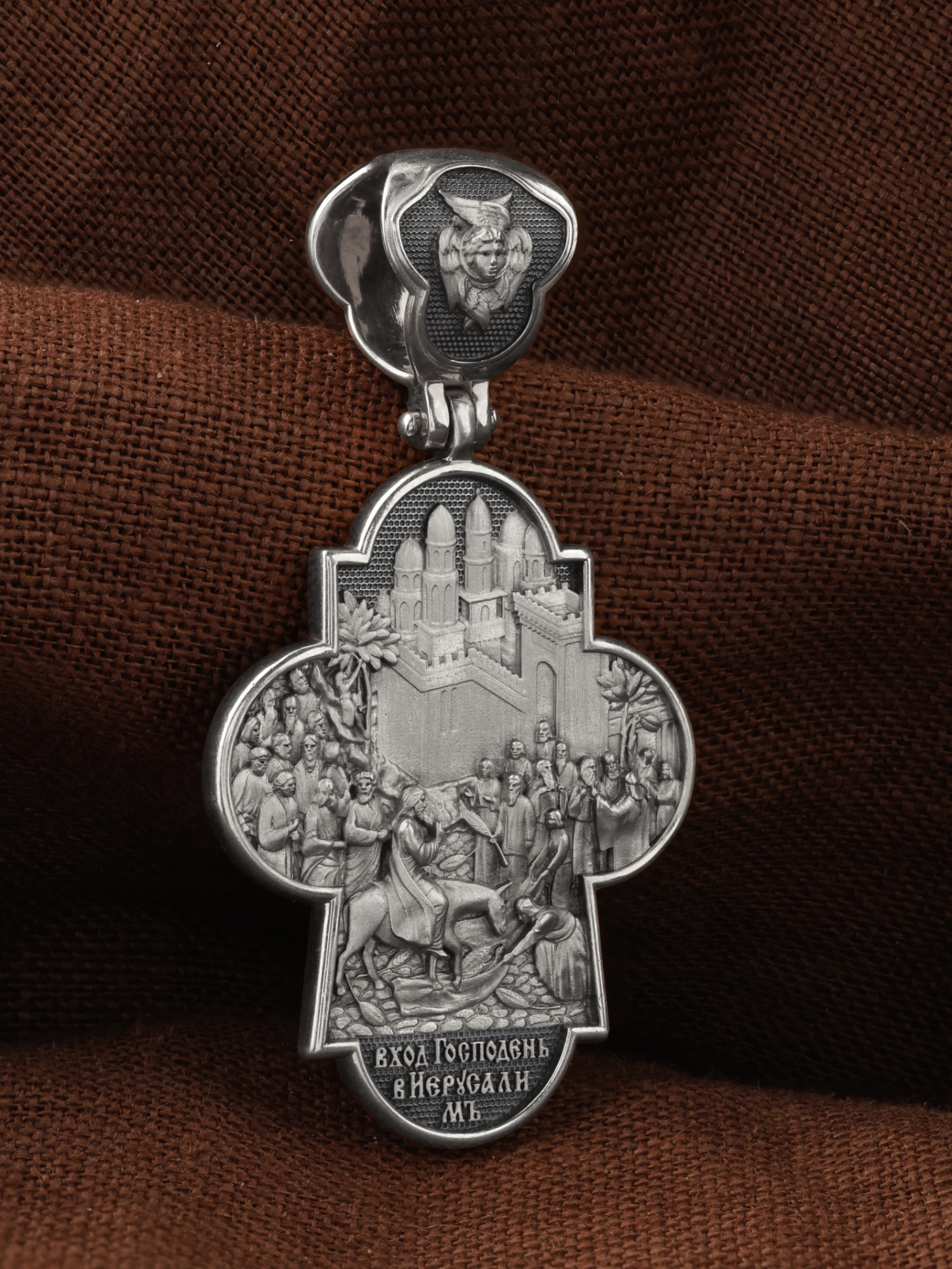 На оборотной стороне креста изображена икона Вход Господень во Иерусалим. Вход Господень в Иерусалим является одним из главных событий последних дней земной жизни Господа Иисуса Христа; оно описано четырьмя евангелистами. Господь в сопровождении учеников выехал из села Вифании и направился в Святой Град. С Елеонской горы Господь устремил свой взор на Иерусалим, вглядываясь в раскинувшийся внизу город, которому предназначено было стать Чашей Его Страданий. Толпы народа встречали Его, держа в руках пальмовые ветви (вайи), приветствуя криками: «Осанна!», что значит «спасение, радость, слава». Вход Господень в Иерусалим символически означает Второе Пришествие Христа. В Своем Первом Пришествии на землю Он явил Себя человечеству как Искупитель и Спаситель; во Втором — придет как Царь мира и Судия. На кулонном кольце изображен шестикрылый Ангел — Серафим.