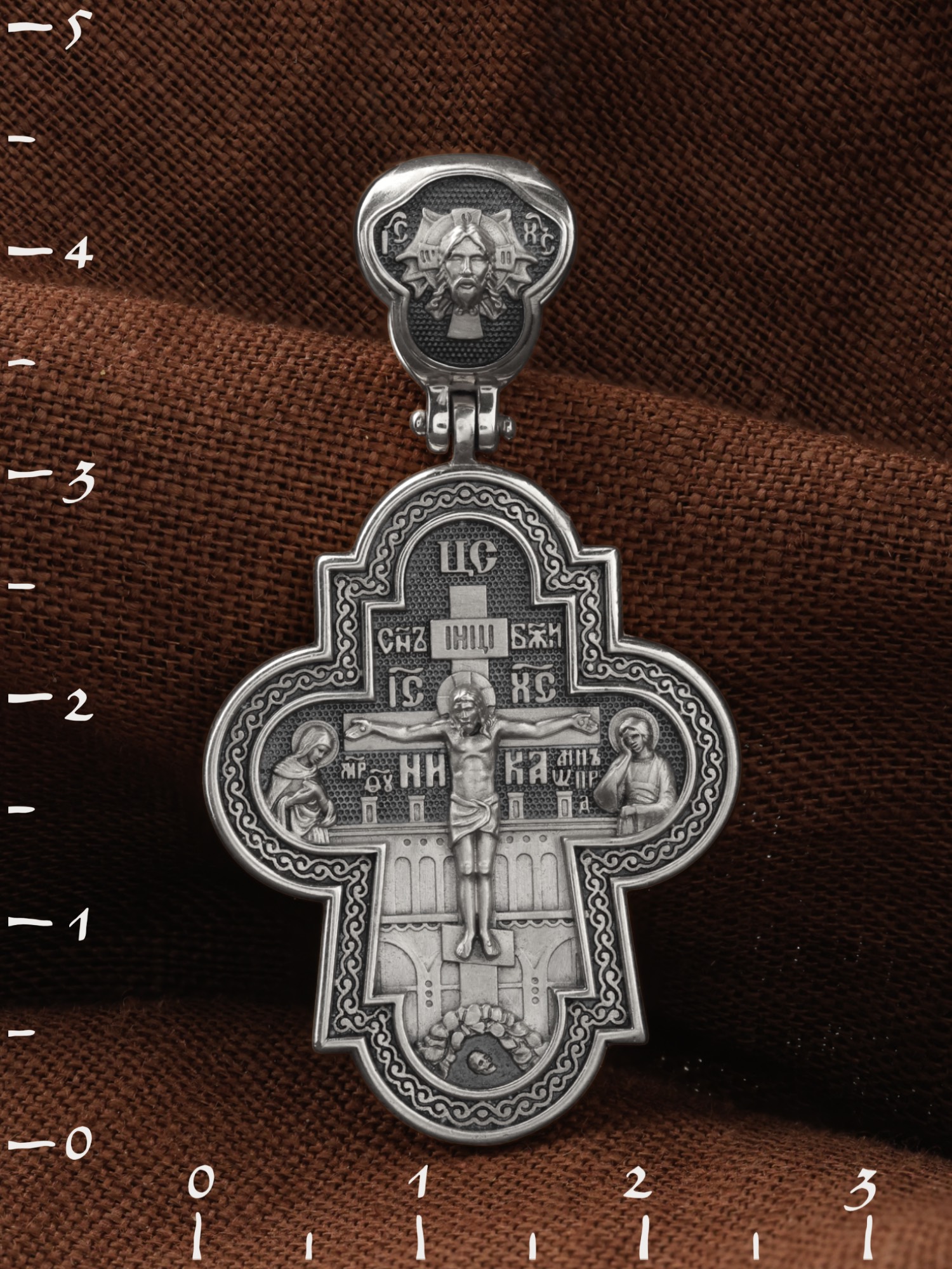 На лицевой стороне креста изображено Распятие Господа и Спасителя нашего Иисуса Христа, отдавшего Себя на смерть, для искупления грехов мира. Крест является символом жертвенной любви всеблагого Бога к падшим людям, всепобеждающим духовным оружием христиан, основанием и средоточием церковной жизни. Над Распятием помещена надпись «Царь Славы». Верхняя перекладина символизирует титло — табличку, на которой, согласно Евангелию, было начертано: Иисус Назорей Царь Иудейский (IНЦI). Распятие сопровождается надписями, олицетворяющими Христа. Надпись «Сын Божий» означает божественную природу Иисуса Христа. Надпись «IС» « ХС» означает Иисус Христос и размещена над поперечной перекладиной. Ниже — слово «НИКА», что означает «победитель». Слева от Распятия изображена Пресвятая Богородица, справа — апостол и евангелист Иоанн Богослов, один из ближайших учеников Иисуса Христа. За крестом высится Иерусалимская стена, в знак того, что Господь был распят вне стен города. Возвышение, на котором стоит Крест, символизирует гору Голгофу, на которой произошло Распятие. Под подножием Креста изображена покоящаяся голова (череп) Адама. На кулонном кольце изображен Нерукотворный образ Господа и Спасителя нашего Иисуса Христа, чудесно отпечатавшийся на плате, которым Христос вытер свой лик.