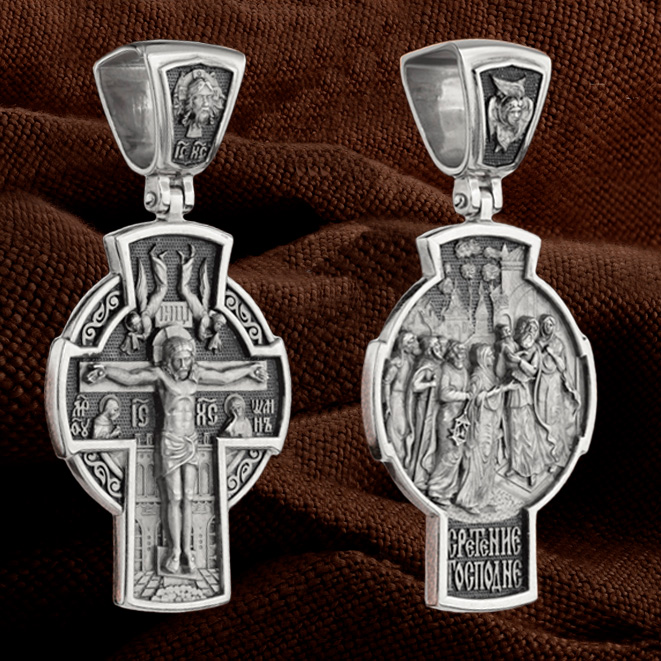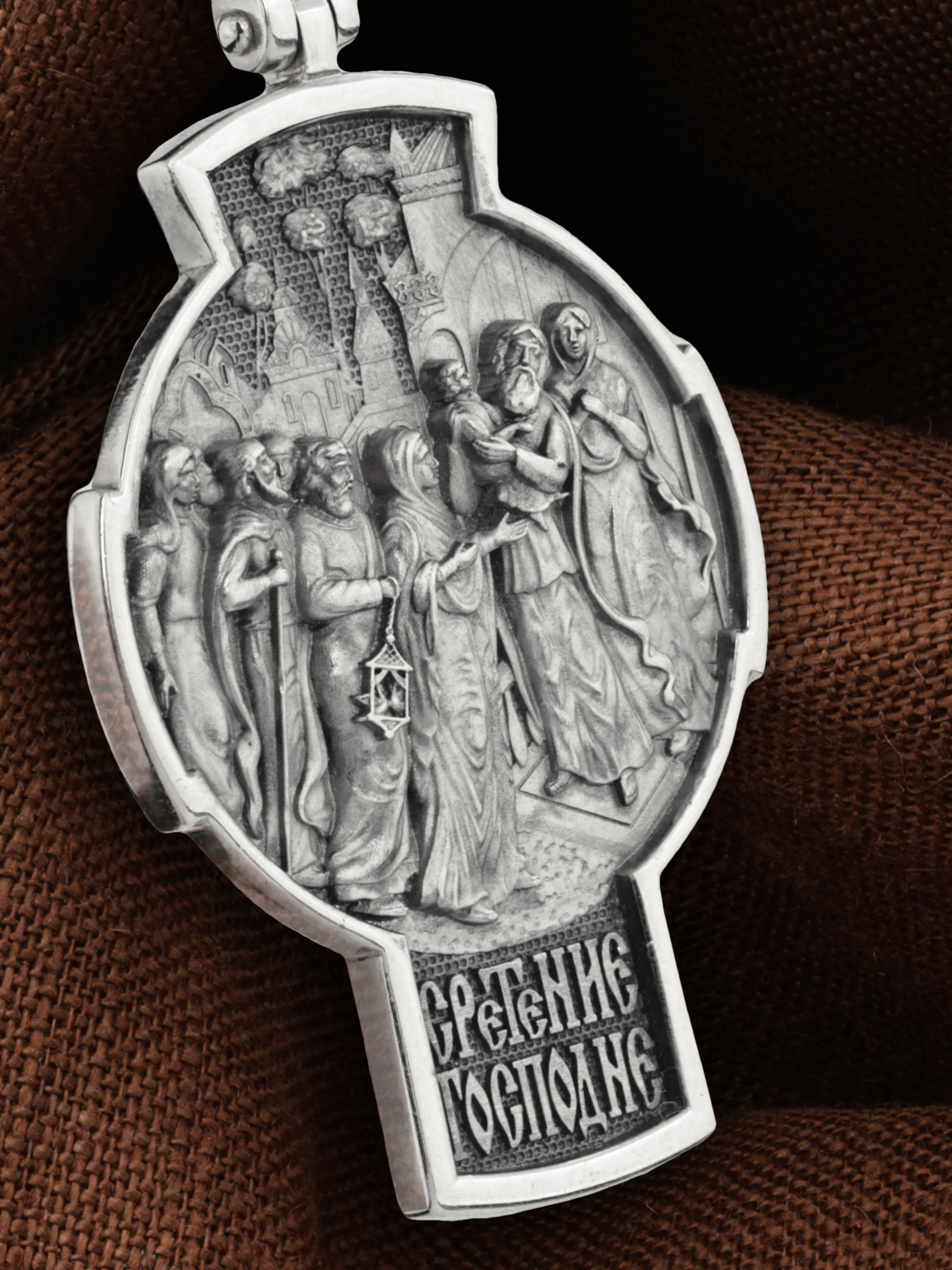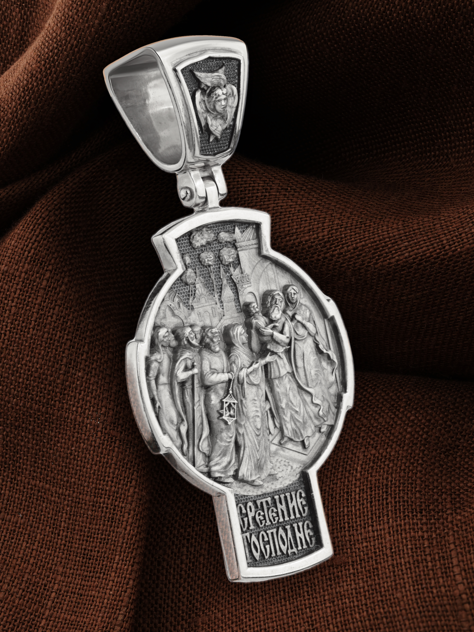 На оборотной стороне креста изображена икона Сретение Господне. В сороковой день по рождении Богомладенец был принесен в Иерусалимский храм. В это время жил в Иерусалиме праведный старец Симеон. Ему было откровение, что он не умрет, пока не увидит Христа Спасителя. По внушению свыше благочестивый старец пришел в храм в то время, когда Пресвятая Богородица и праведный Иосиф принесли туда Младенца Иисуса, чтобы исполнить законный обряд. Богоприимец Симеон взял Богомладенца на руки и, благословив Бога, изрек пророчество о Спасителе мира: «Ныне отпускаешь раба Твоего, Владыка, по слову Твоему, с миром, ибо видели очи мои спасение Твое, которое Ты уготовал пред лицем всех народов, свет к просвещению язычников и славу народа Твоего Израиля» (Лк. 2: 29–32). Пресвятой Деве праведный Симеон сказал: «Се, лежит Сей на падение и на восстание многих в Израиле и в предмет пререканий, и Тебе Самой оружие пройдет душу, да откроются помышления многих сердец». В храме была также 84-летняя вдовица Анна, пророчица, дочь Фануилова, которая постом и молитвой служила Богу в храме день и ночь. Она «славила Господа и говорила о Богомладенце всем, ожидавшим избавления в Иерусалиме». На кулонном кольце изображен шестикрылый Ангел — Серафим.