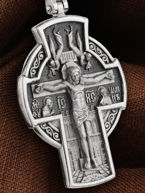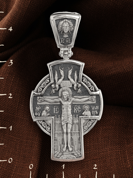 На лицевой стороне креста изображено Распятие Господа и Спасителя нашего Иисуса Христа, отдавшего Себя на смерть, для искупления грехов мира. Крест является символом жертвенной любви всеблагого Бога к падшим людям, всепобеждающим духовным оружием христиан, основанием и средоточием церковной жизни. Верхняя перекладина символизирует титло — табличку, на которой, согласно Евангелию, было начертано: Иисус Назорей Царь Иудейский (IНЦI). Надпись «IC» «ХC», означает Иисус Христос, помещается ниже поперечной перекладины креста. Слева от Распятия изображена Пресвятая Богородица, справа — апостол и евангелист Иоанн Богослов, один из ближайших учеников Иисуса Христа. За крестом высится Иерусалимская стена, в знак того, что Господь был распят вне стен города. Возвышение, на котором стоит Крест, символизирует гору Голгофу, на которой произошло Распятие. На кулонном кольце изображен Нерукотворный образ Господа и Спасителя нашего Иисуса Христа, чудесно отпечатавшийся на плате, которым Христос вытер свой лик.