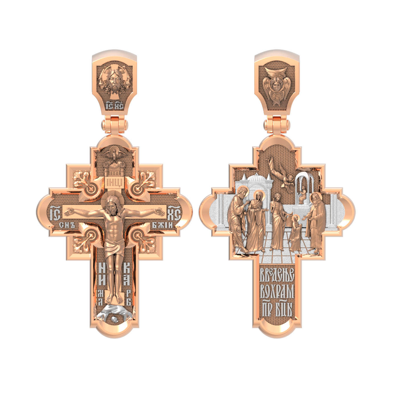 На оборотной стороне креста изображена икона Введение во Храм Пресвятой Богородицы. По сохраненным Преданием рассказам, родители Девы Марии, праведные Иоаким и Анна, молясь о разрешении неплодства, дали обет, если родится дитя, посвятить его на служение Богу. Когда Пресвятой Деве исполнилось три года, святые родители решили выполнить свое обещание. Собрав родственников и знакомых, одев Пречистую Марию в лучшие одежды, с пением священных песней, с зажженными свечами в руках привели ее в Иерусалимский храм. Там встретил отроковицу первосвященник со множеством священников. В храм вела лестница в пятнадцать высоких ступеней. Младенец Мария, казалось, не могла бы Сама взойти по этой лестнице. Но как только Ее поставили на первую ступень, укрепляемая силой Божией, Она быстро преодолела остальные ступени и взошла на верхнюю. Затем первосвященник, по внушению свыше, ввел Пресвятую Деву в Святое святых, куда из всех людей только раз в году входил первосвященник с очистительной жертвенной кровью. Все присутствовавшие в храме дивились необыкновенному событию. На кулонном кольце изображен шестикрылый Ангел — Серафим.