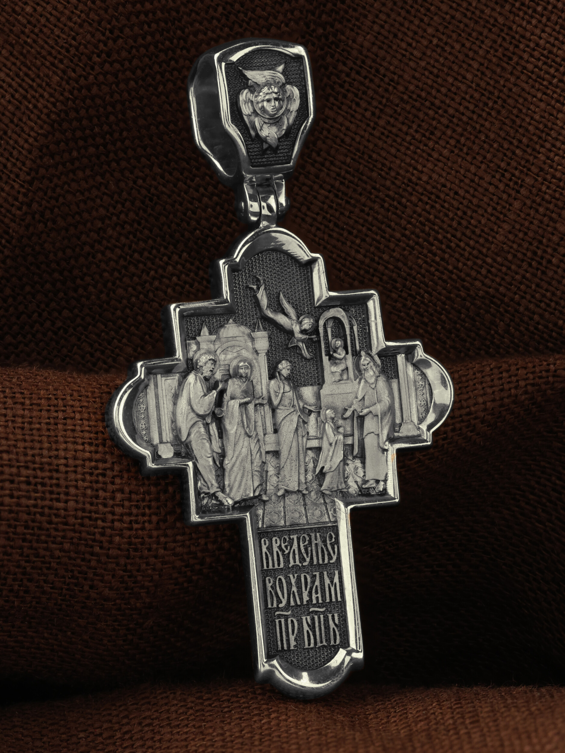 На оборотной стороне креста изображена икона Введение во Храм Пресвятой Богородицы. По сохраненным Преданием рассказам, родители Девы Марии, праведные Иоаким и Анна, молясь о разрешении неплодства, дали обет, если родится дитя, посвятить его на служение Богу. Когда Пресвятой Деве исполнилось три года, святые родители решили выполнить свое обещание. Собрав родственников и знакомых, одев Пречистую Марию в лучшие одежды, с пением священных песней, с зажженными свечами в руках привели ее в Иерусалимский храм. Там встретил отроковицу первосвященник со множеством священников. В храм вела лестница в пятнадцать высоких ступеней. Младенец Мария, казалось, не могла бы Сама взойти по этой лестнице. Но как только Ее поставили на первую ступень, укрепляемая силой Божией, Она быстро преодолела остальные ступени и взошла на верхнюю. Затем первосвященник, по внушению свыше, ввел Пресвятую Деву в Святое святых, куда из всех людей только раз в году входил первосвященник с очистительной жертвенной кровью. Все присутствовавшие в храме дивились необыкновенному событию. На кулонном кольце изображен шестикрылый Ангел — Серафим.