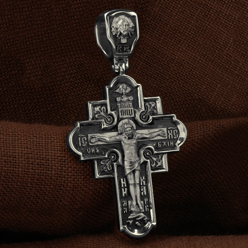На лицевой стороне креста изображено Распятие Господа и Спасителя нашего Иисуса Христа. Крест- символ спасения и искупления рода человеческого, знамение победы над смертью и адом. Иисус Христос, как искупительная жертва освобождения человечества от власти греха, умер крестной смертью и в третий день воскрес. Верхняя перекладина символизирует титло — табличку, на которой, согласно Евангелию, было начертано: Иисус Назорей Царь Иудейский (IНЦI). Надпись «IC» «ХC», означает Иисус Христос, помещается на разных сторонах поперечной перекладины креста. Ниже перекладины расположено словосочетание «СЫН БОЖИЙ», что означает божественную природу Иисуса Христа. Надпись «МЛРБ» — «место лобное рай бысть» означает, что место лобное стало раем и помещаются в нижней части креста. Рядом — слово «НИКА», что означает «победитель». Возвышение, на котором стоит Крест, символизирует гору Голгофу, на которой произошло Распятие. Под подножием Креста изображена покоящаяся голова (череп) Адама. На кулонном кольце изображен Нерукотворный образ Господа и Спасителя нашего Иисуса Христа, чудесно отпечатавшийся на плате, которым Христос вытер свой лик. Ниже надпись — «IC» «ХC».