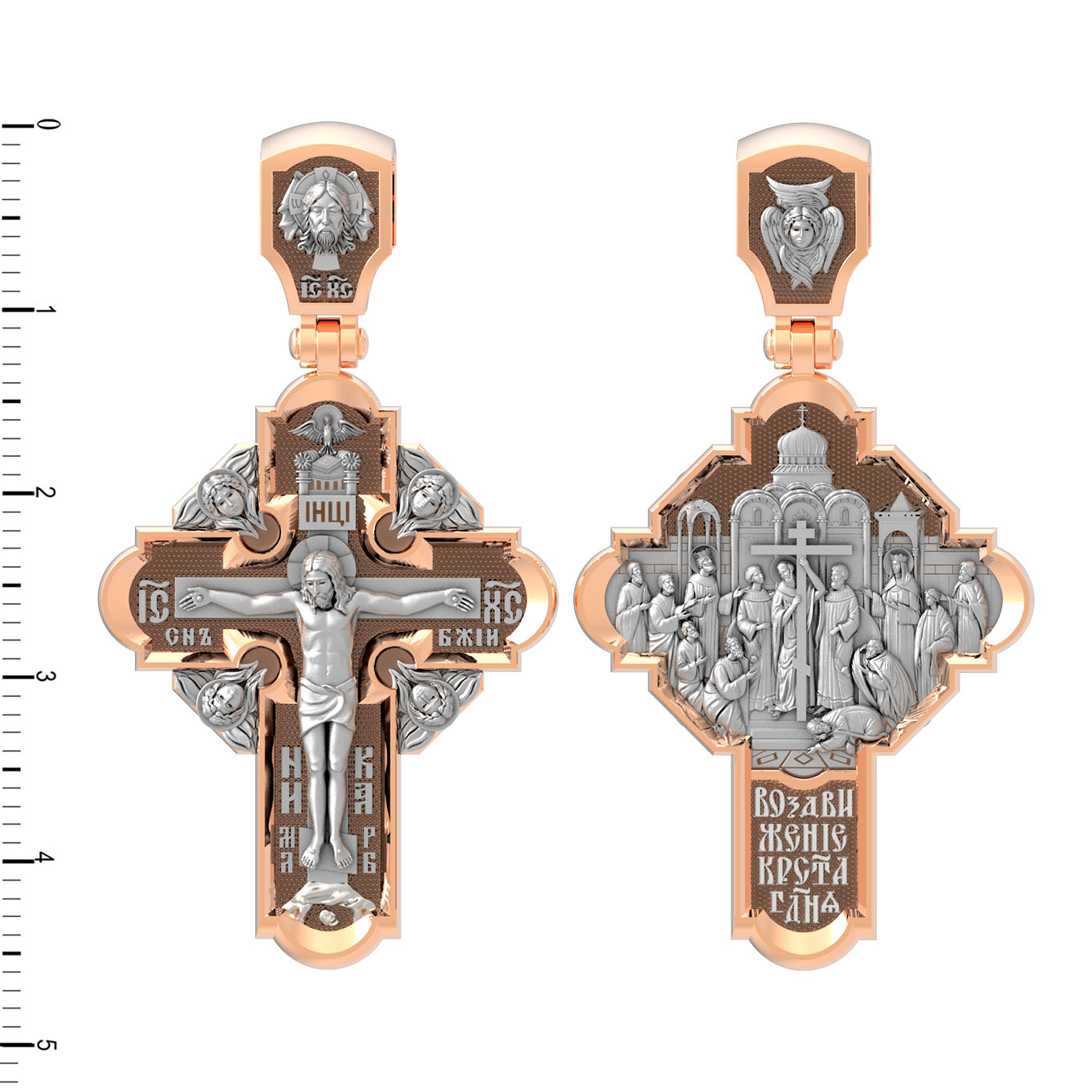 На оборотной стороне креста изображена икона Воздвижение Честного и Животворящего Креста Господня. Равноапостольный царь Константин пожелал построить храмы Божии на священных для христиан местах в Палестине и найти Крест, на котором был распят Спаситель. Исполнить желание царя взялась, с великою радостью, его мать, св. равноапостольная царица Елена. Крест был обретен в 326 году около горы Голгофы в Иерусалиме. C VII века с этим днём стали соединять память о возвращении Животворящего Креста из Персии византийским императором Ираклием (629). Праздник называется Воздвижением Креста, потому что и при обретении, и при возвращении Креста патриарх Макарий поднимал (Воздвигал) крест три раза, чтобы все могли его видеть. Народ же, видя Крест Спасителя, кланялся и восклицал: «Господи, помилуй!». Св. равноапостольные цари Константин и Елена, над местом страданий, погребения и воскресения Иисуса Христа построили обширный и великолепный храм в честь Воскресения Христова. На кулонном кольце изображен шестикрылый Ангел — Серафим.