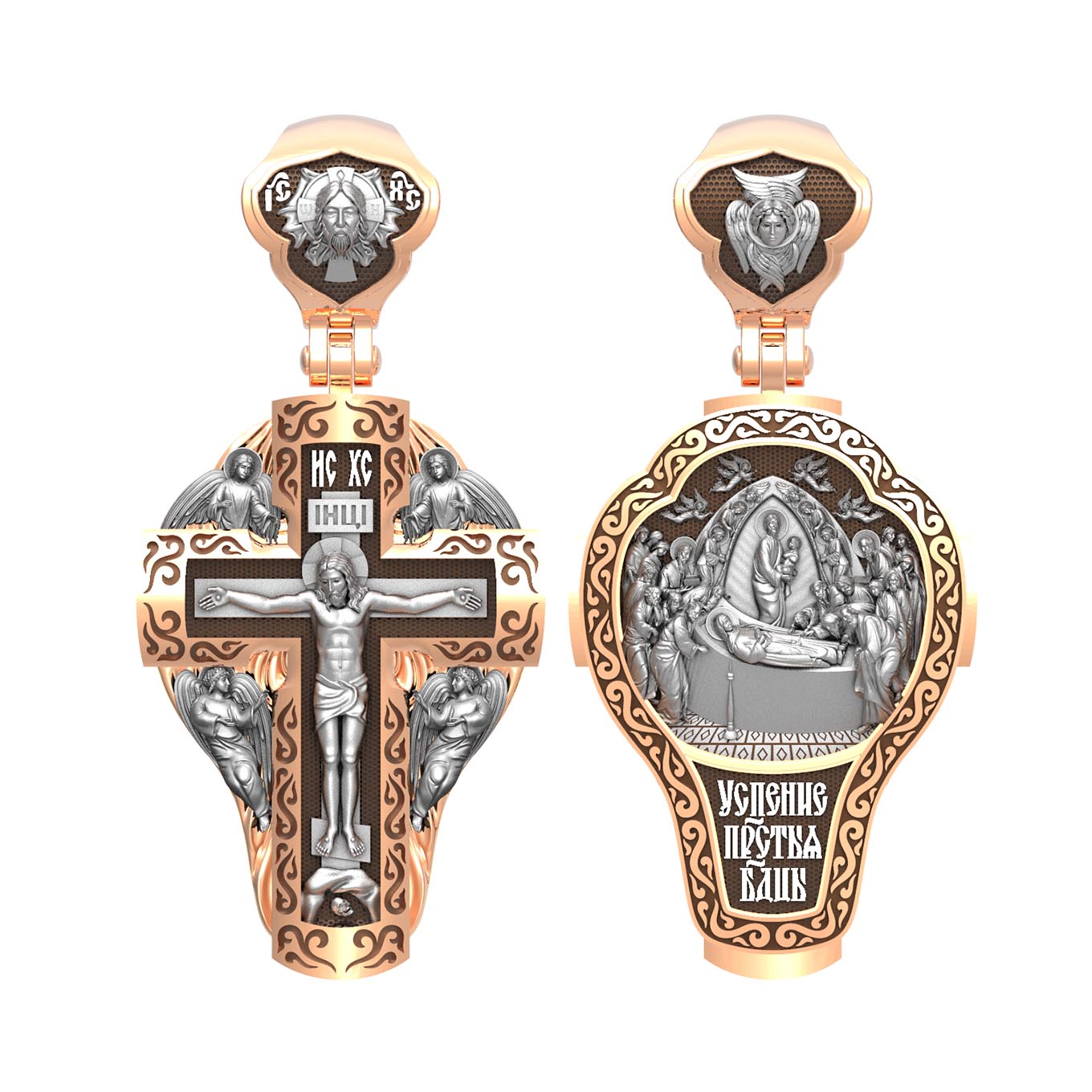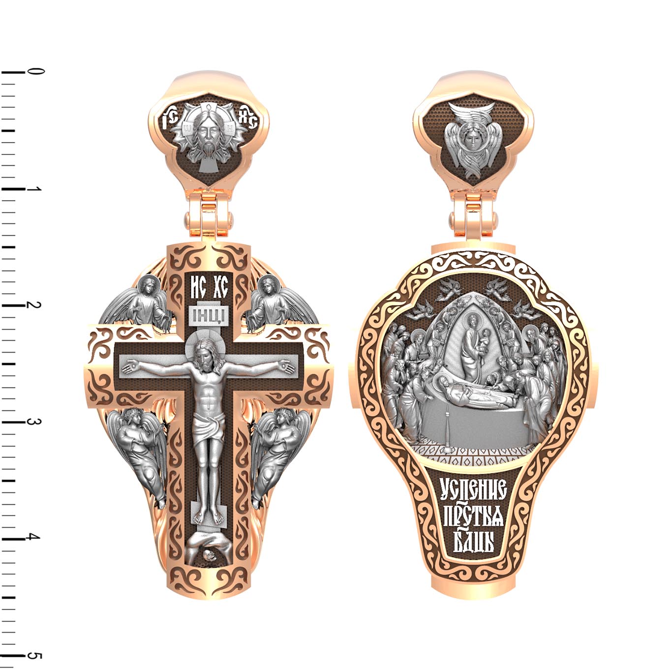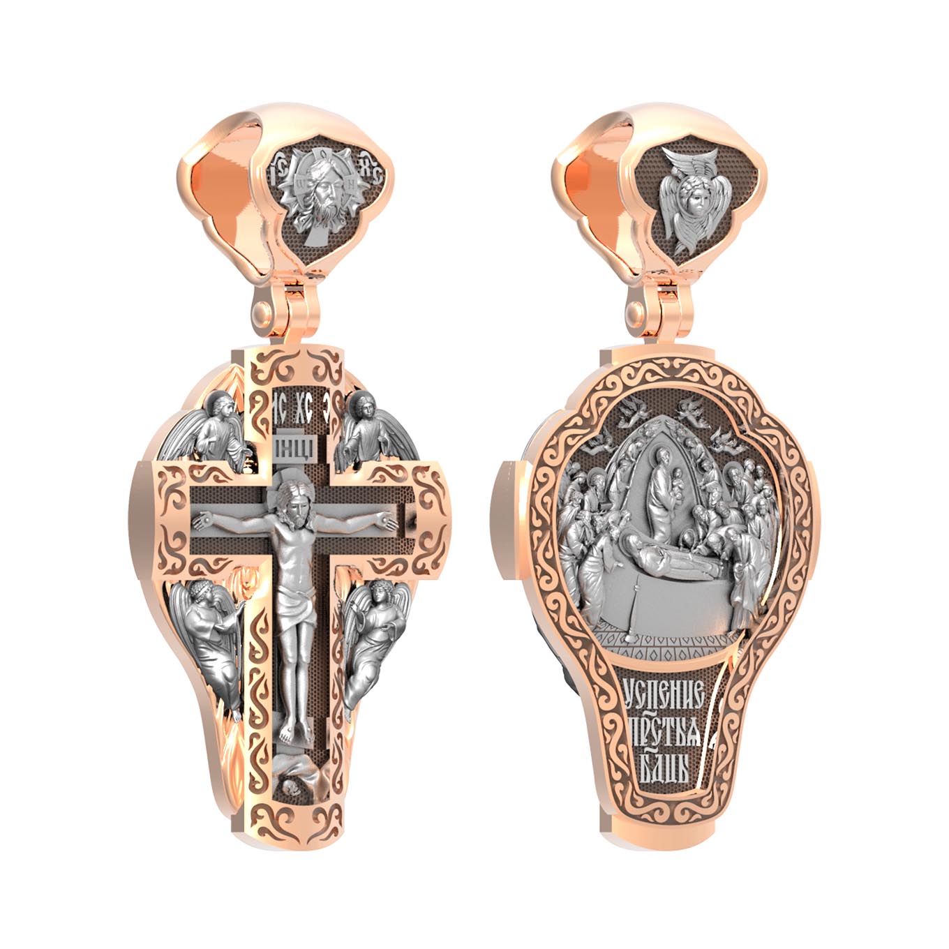 На оборотной стороне креста изображена икона Успения Пресвятой Богородицы. Все годы после Распятия, Воскресения и Вознесения Иисуса Христа Пресвятая Дева провела большей частью в Иерусалиме, проповедуя Господа наравне с апостолами. Но вот настало время Ее земной кончины. Архангел Гавриил возвестил Ей, что через три дня душа Ее оставит тело. Но Богородица очень обрадовалась. Ведь Ее ожидала встреча с Тем, Кого Она любила гораздо больше, чем жизнь. Три дня спустя в доме апостола Иоанна, где жила Мария, собрались и другие апостолы: Господь чудесным образом устроил так, что все они вернулись к этому дню из дальних странствий, где проповедовали Христа. Не было только Фомы. Апостолы стали свидетелями блаженной кончины Святой Девы. Сам Христос, окруженный множеством ангелов, явился, чтобы принять душу Своей Пречистой Матери и возвести Ее в рай. На кулонном кольце изображен шестикрылый Ангел — Серафим.
