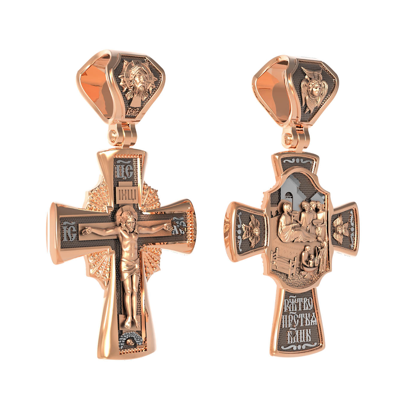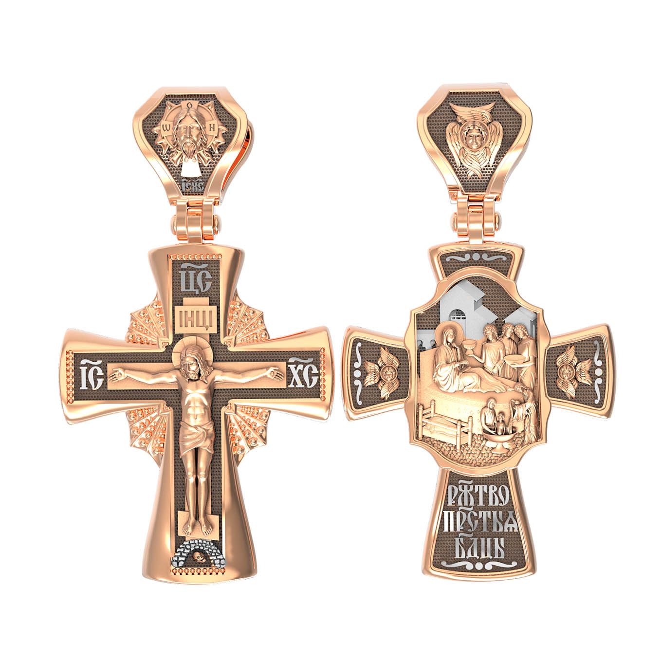 На оборотной стороне креста изображена икона Рождество Пресвятой Богородицы. Согласно церковному Преданию, Пресвятая Дева Мария родилась в небольшом галилейском городе Назарете. Родителями Её были праведные Иоаким и Анна. Супруги были бездетны, но не теряли надежды, что Господь может разрешить неплодство Анны даже в её преклонном возрасте. Они горячо молились и просили Господа даровать им дитя, которое обещали посвятить Богу для служения в храме. И Господь услышал их молитвы: Праведная Анна зачала и разрешилась дочерью Марией — будущей Пресвятой Богородицей. На кулонном кольце изображен шестикрылый Ангел — Серафим.