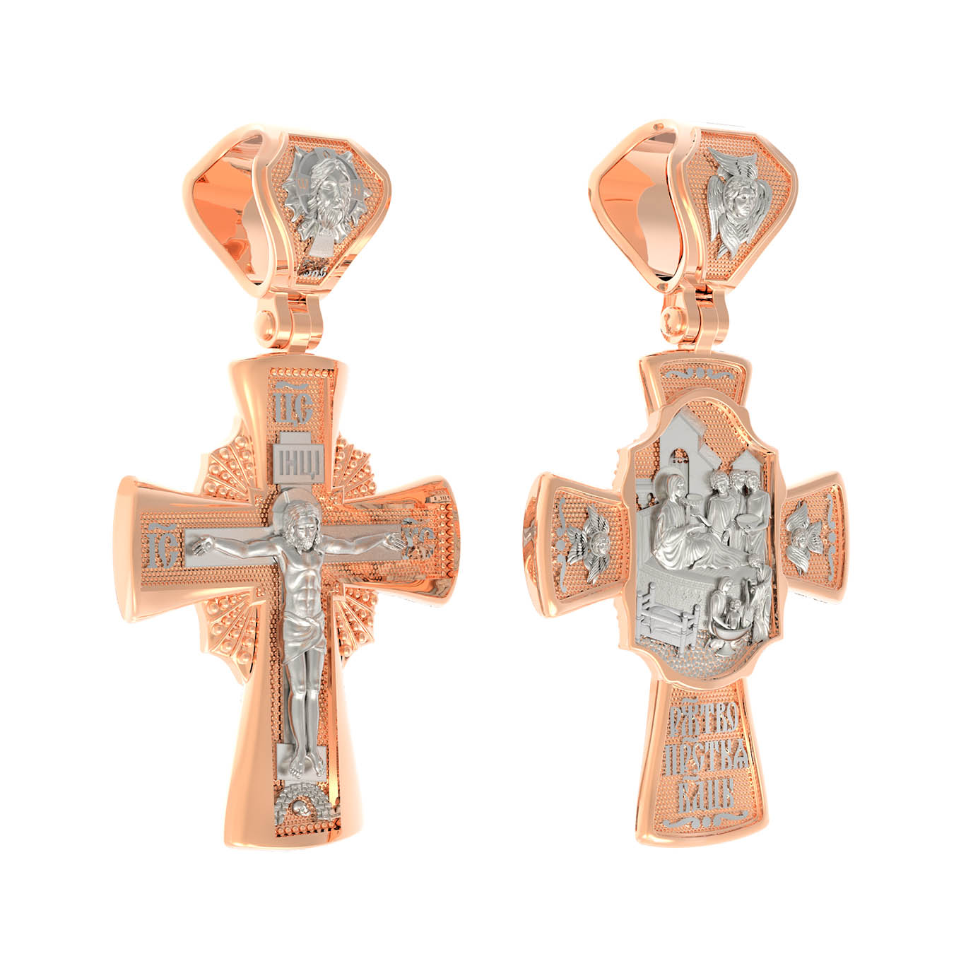 На оборотной стороне креста изображена икона Рождество Пресвятой Богородицы. Согласно церковному Преданию, Пресвятая Дева Мария родилась в небольшом галилейском городе Назарете. Родителями Её были праведные Иоаким и Анна. Супруги были бездетны, но не теряли надежды, что Господь может разрешить неплодство Анны даже в её преклонном возрасте. Они горячо молились и просили Господа даровать им дитя, которое обещали посвятить Богу для служения в храме. И Господь услышал их молитвы: Праведная Анна зачала и разрешилась дочерью Марией — будущей Пресвятой Богородицей. На кулонном кольце изображен шестикрылый Ангел — Серафим.