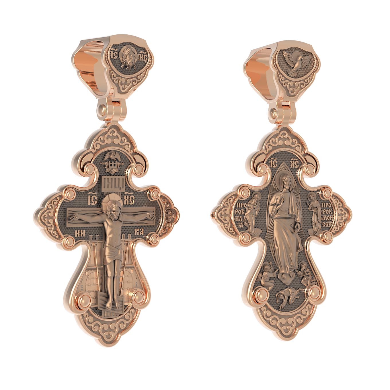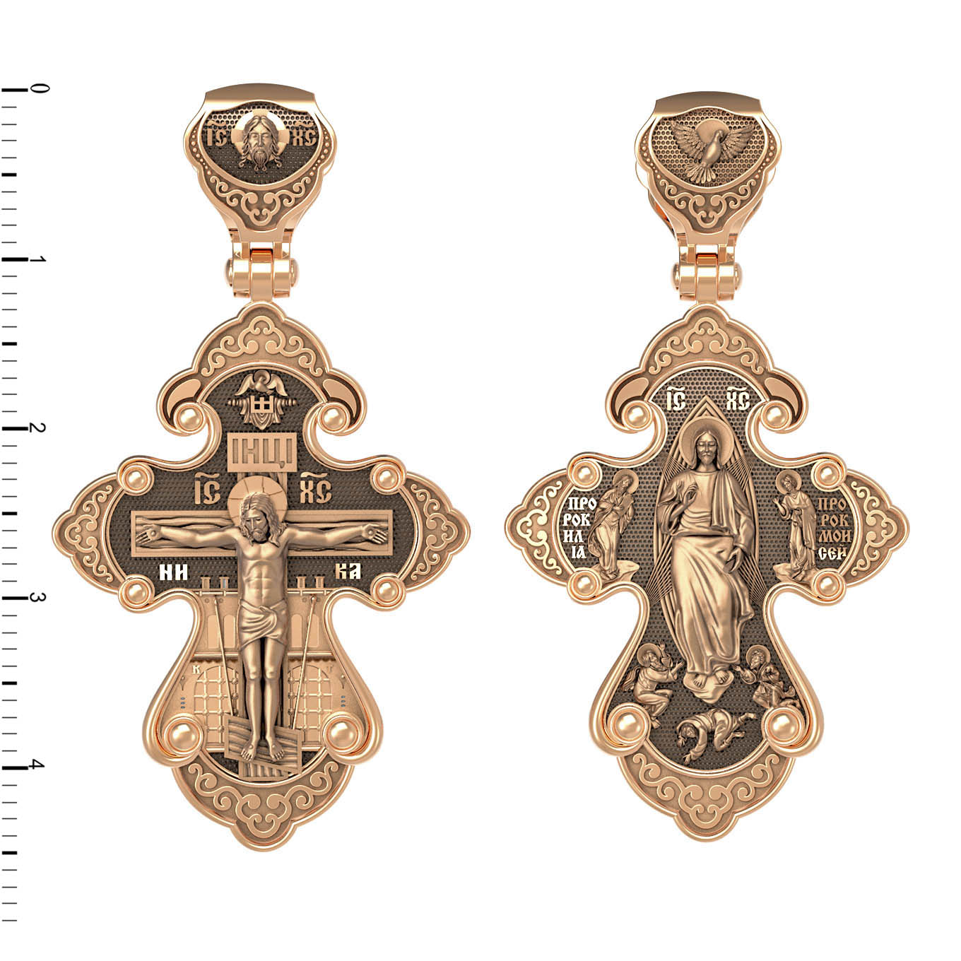 На оборотной стороне креста изображена икона «Преображение Господне». Иисус Христос вместе со своими учениками Петром, Яковом и Иоанном взошел на гору Фавор для молитвы. Пока Господь молился, ученики заснули, а проснувшись увидели, что Иисус преобразился — «лицо Его просияло, а одежды сделались ослепительно белыми». Рядом с Сыном Божьим они увидели ветхозаветных пророков — Моисея и Илию, которые беседовали с Ним о грядущих искупительных страданиях. Увидев такую картину, апостолов охватила неземная благодать, они захотели, чтобы это состояние продолжалось все время. А через некоторое время сверху сошло облако, которое скрыло Иисуса, Илию и Моисея от взора учеников и они услышали из облака Божий глас: « Сей есть Сын Мой возлюбленный, в Котором Мое благоволение. Его слушайте!» (Мф. 17,1−13). В страхе и почтении Петр, Иоанн и Иаков повалились на землю. Вскоре к ним подошел Иисус Христос в своей обычной одежде и сказал им, чтобы больше никто из людей, до Его Воскрешения, не знал о том, что произошло на этой горе. На кулонном кольце изображен парящий голубь — символ Святого Духа и Его благодати.