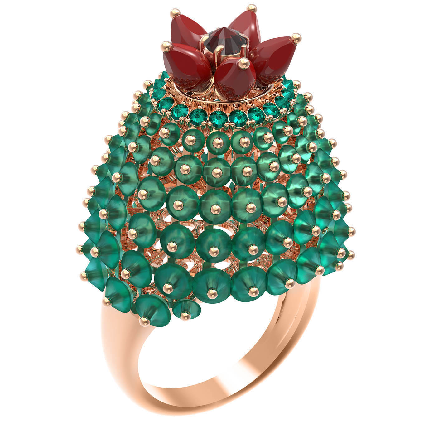 Кольцо из золота c гранатом, хризопразом, изумрудом и кораллом