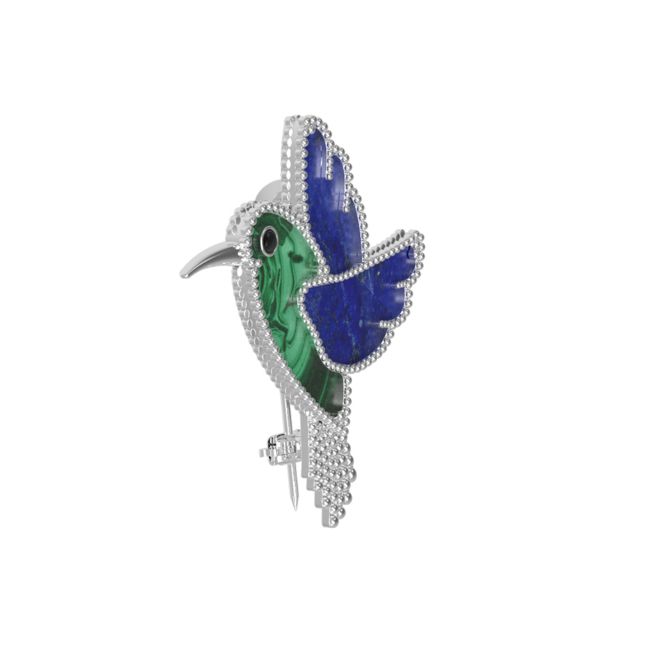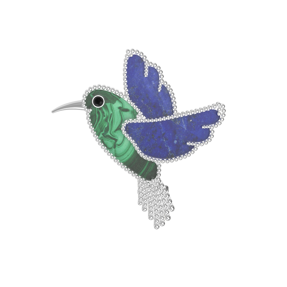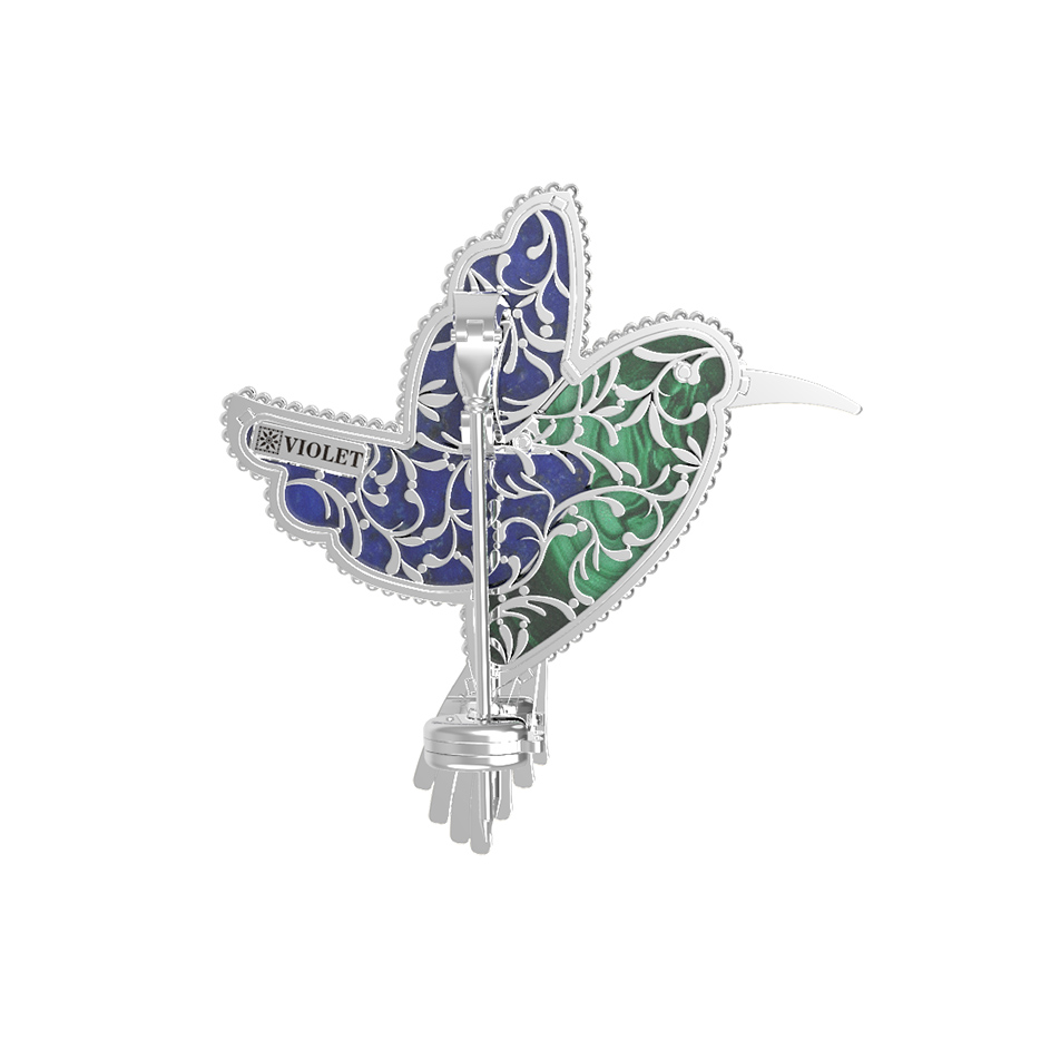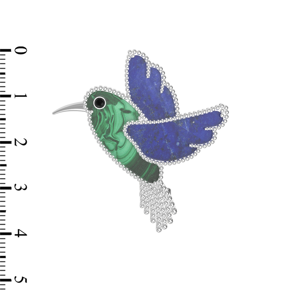 Брошь из белого золота c эмалью, лазуритом и малахитом