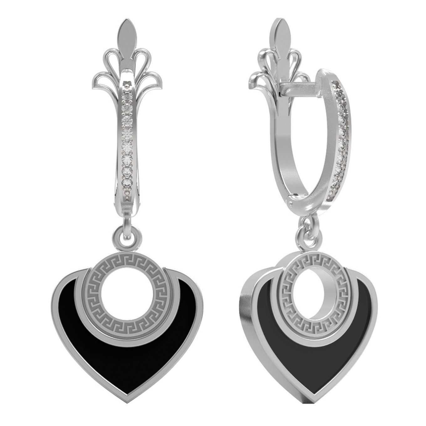 Серьги из белого золота c фианитом и ониксом