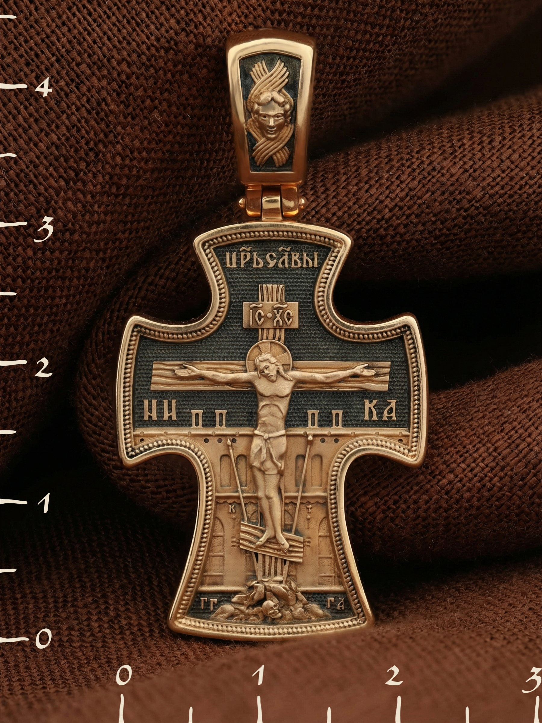 На лицевой стороне креста изображено Распятие, потому что это орудие казни Иисус Христос сделал орудием победы над грехом и смертью. Своими страданиями Он искупил грехи человечества, умерев и сошествовав во ад, победил сатану, освободил души праведников от вечной смерти и открыл им небесные врата рая. Жертва Христа сделала возможным спасение для каждого человека. На православном кресте Христос не умирает, а свободно простирает руки, ладони Иисуса открыты, будто он хочет обнять все человечество, даря им свою любовь и открывая путь к вечной жизни. Над титлом видим слова «ЦРЬ СЛВЫ» — Царь Славы. Верхняя перекладина символизирует собой табличку с надписью «IC XC» — Иисус Христос, ниже перекладины добавляется: «НИКА» (греч. — Победитель). Возвышение, на котором стоит Крест, символизирует гору Голгофу, на которой произошло Распятие. У подножия Креста изображают прах Адама, обозначенный черепом. По сторонам Голгофы начертаны буквы «ГГ» (Гора Голгофа) и «ГА» (голова Адама). Справа и слева от Креста изображены орудия страданий Господа — трость и копие, обозначенные буквами «Т» и «К».