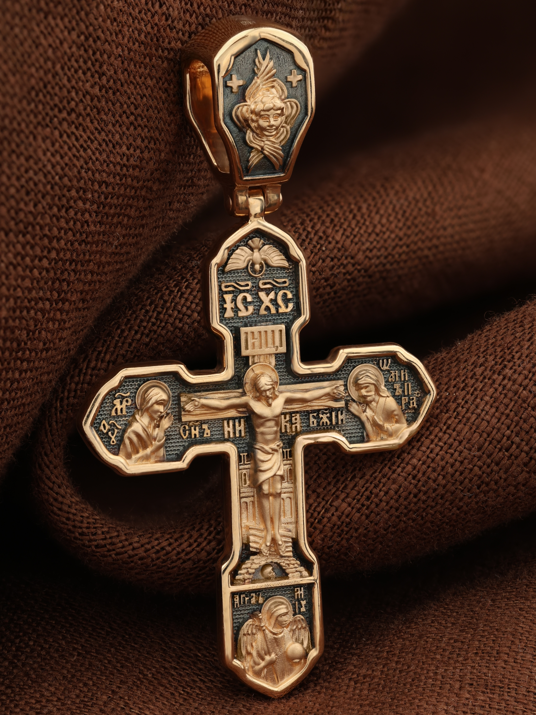 На лицевой стороне изображено Распятие Господа Иисуса Христа, над вершиной которого помещены титлы Его святого имени — «ИС ХС». Под основной перекладиной надписи — «НИКА», что в переводе с греческого означает «победитель», и словосочетание «СЫН БОЖИЙ», что означает божественную природу Иисуса Христа. С двух сторон Христу предстоят Пресвятая Богородица и св. Андрей Первозванный. Внизу — образ Архангела Михаила, могучего защитника от злых сил. Это он низверг дьявола и встал во главе ангелов для борьбы с бесовскими силами. Его имя означает «Кто яко Бог?».