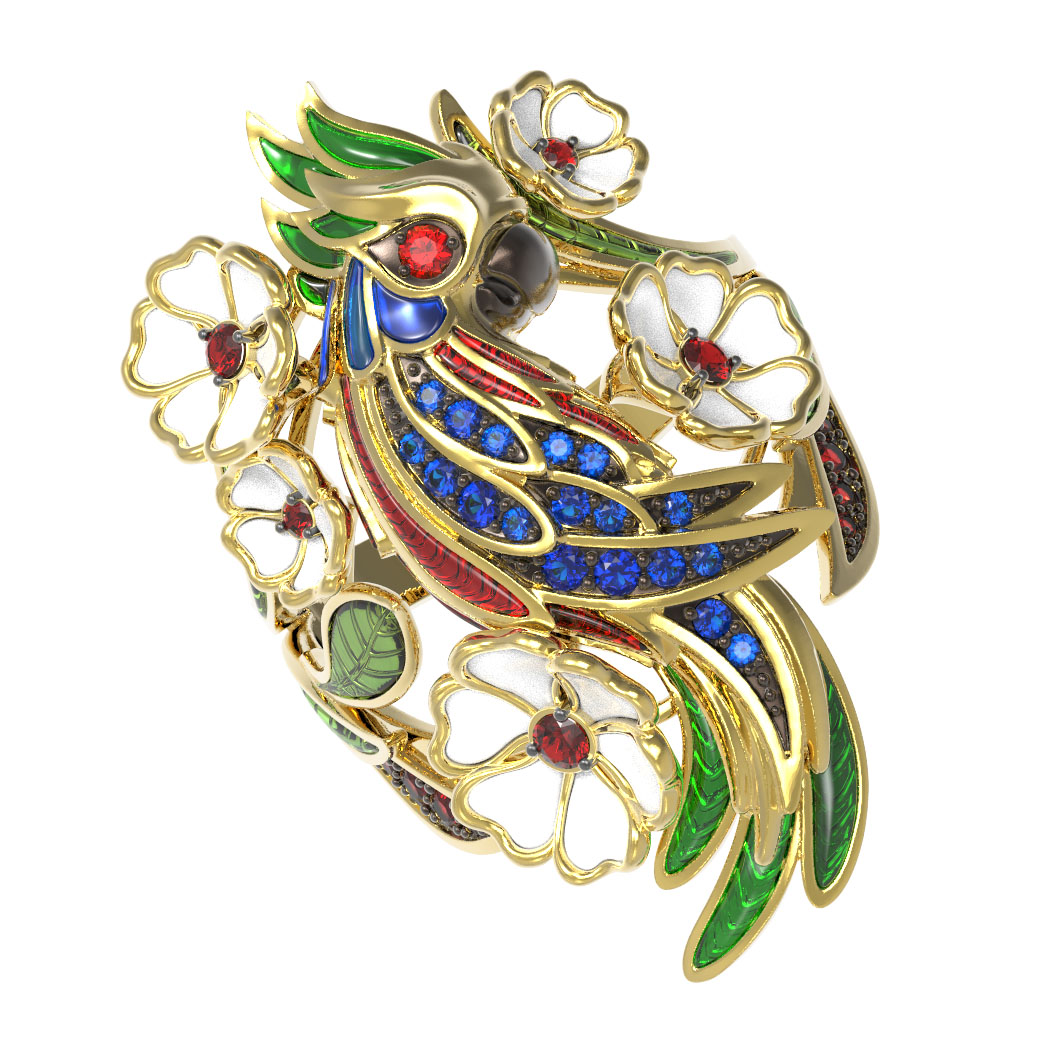 Кольцо из лимонного золота c эмалью, гранатом, рубином и сапфиром