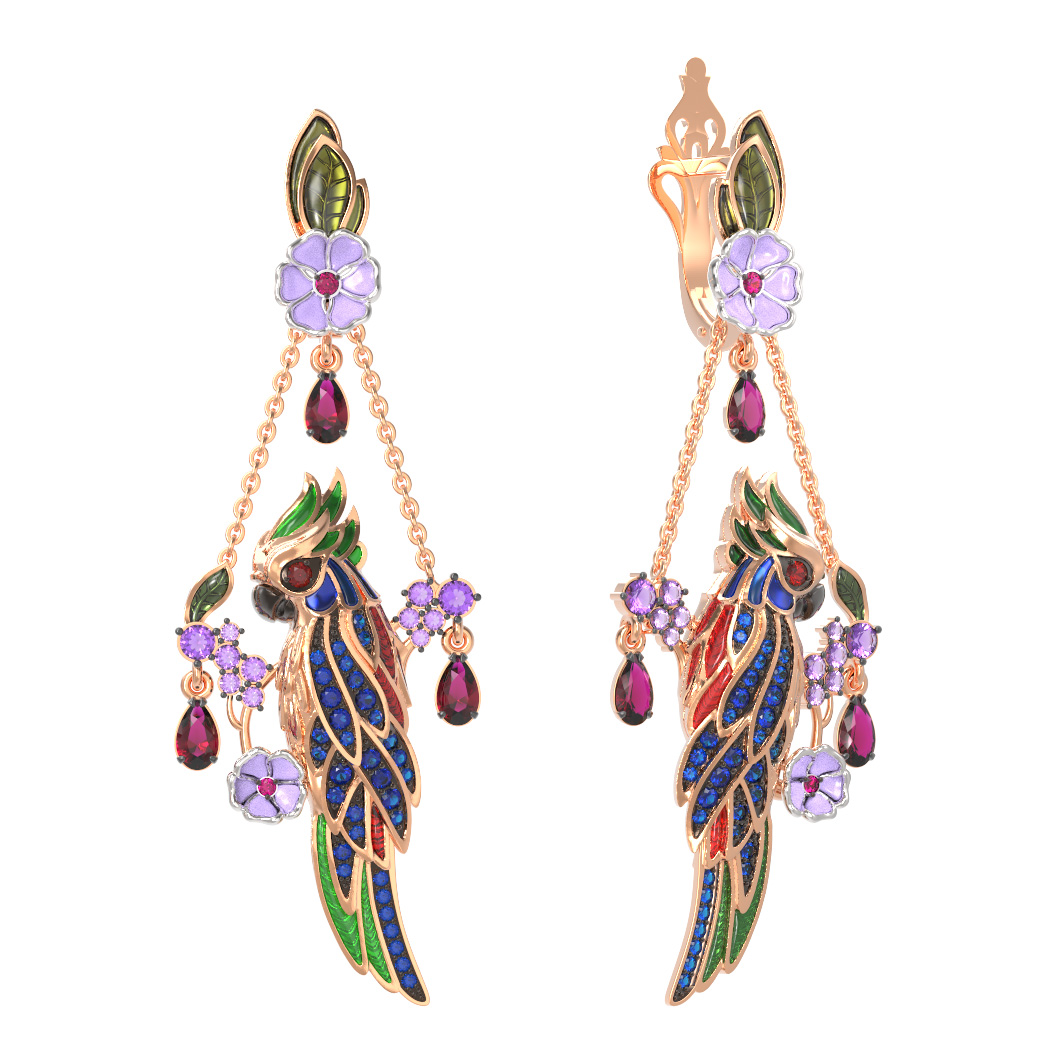 Серьги из золота c эмалью, аметистом, рубином, аметистом и сапфиром