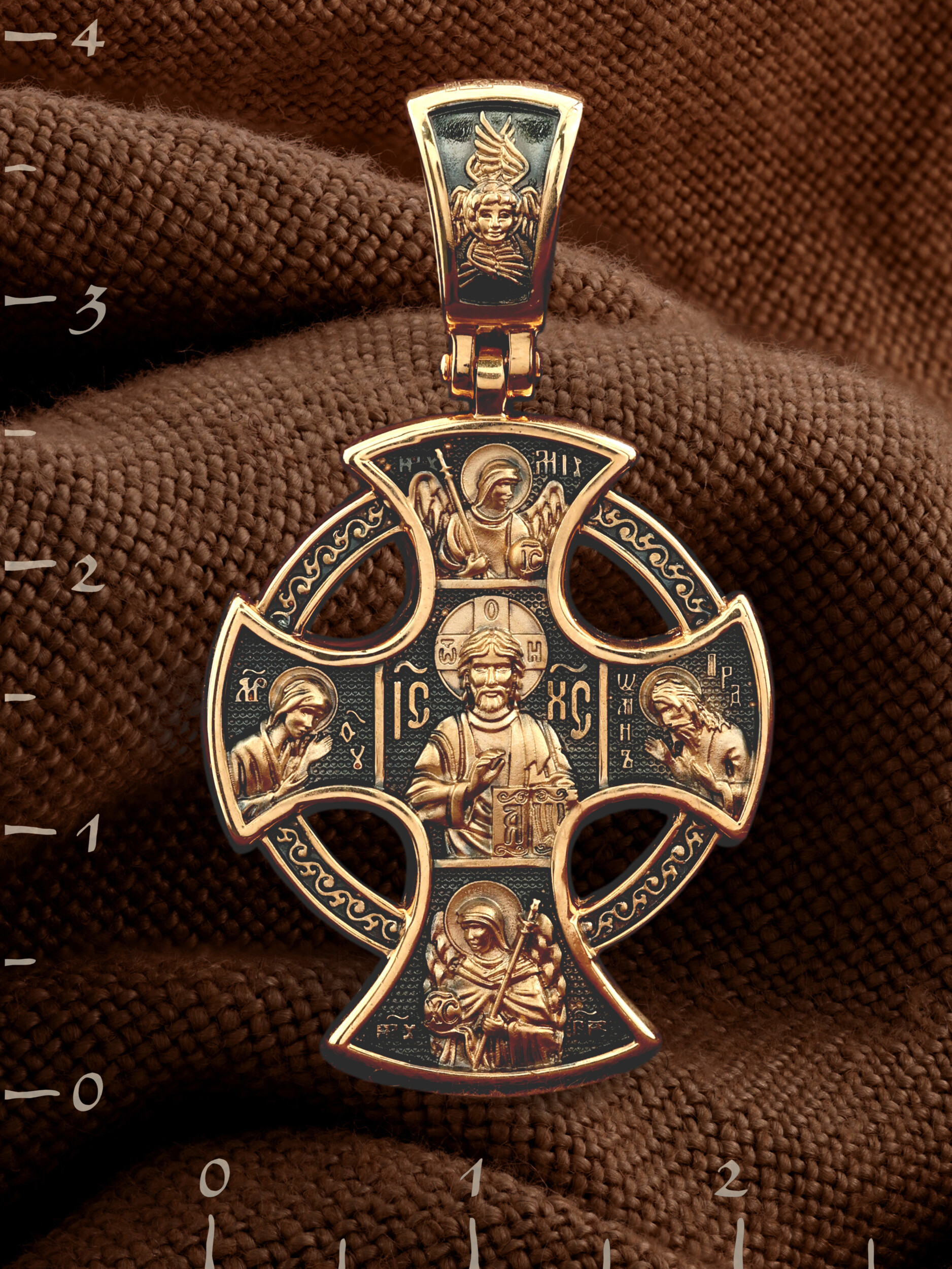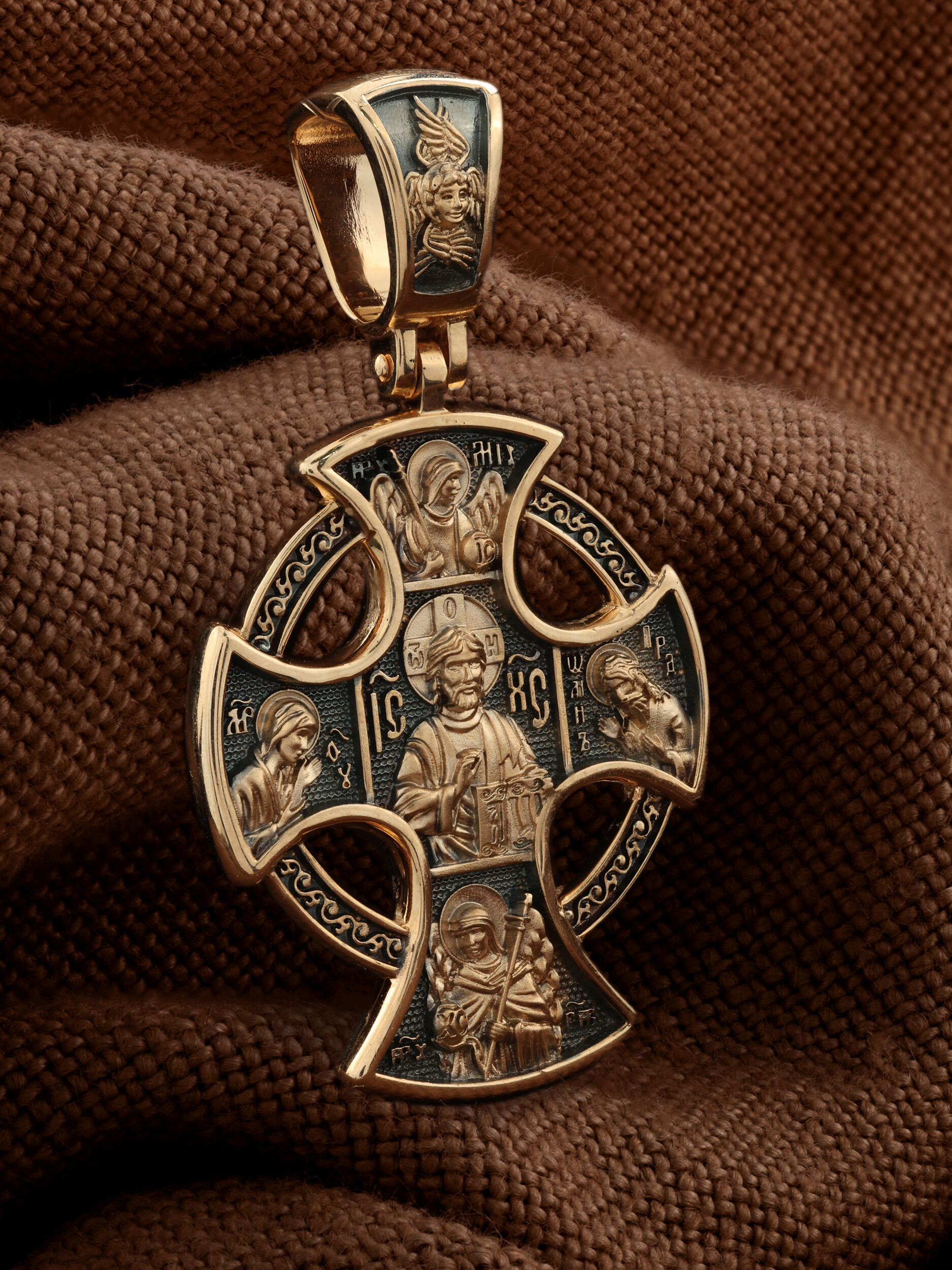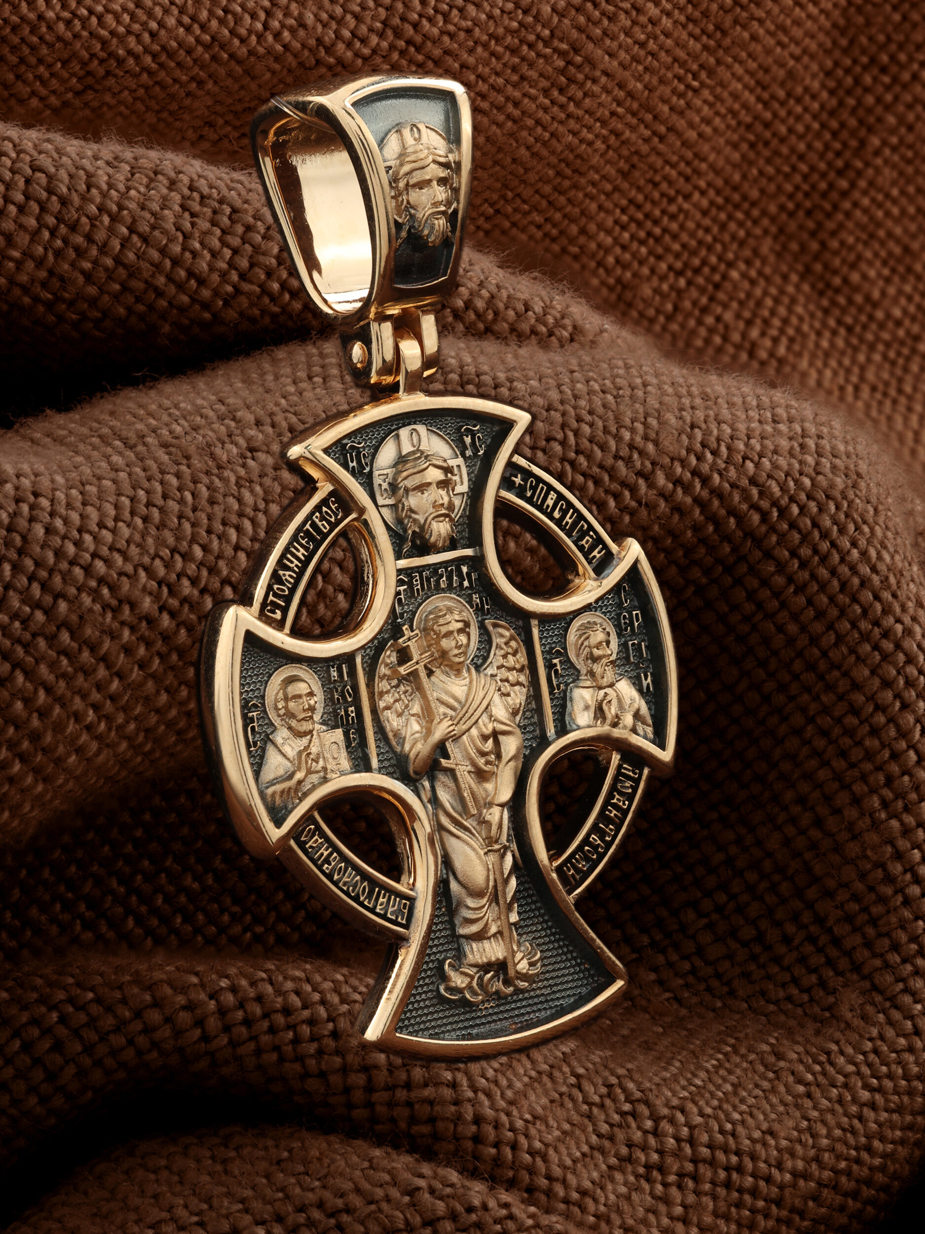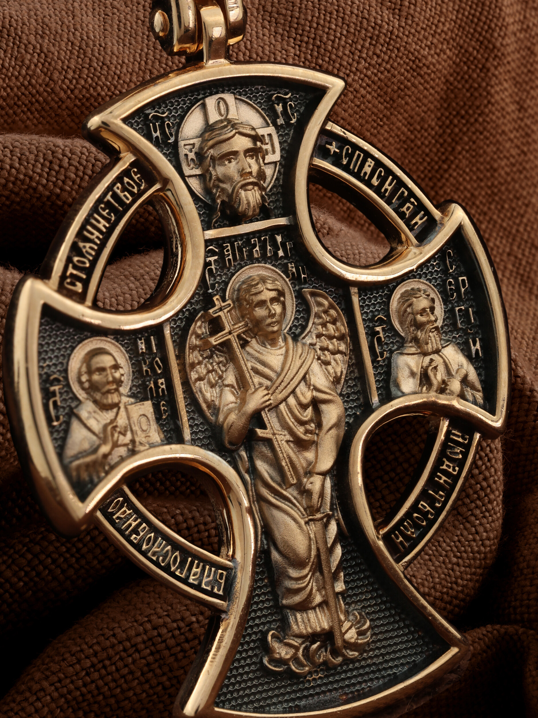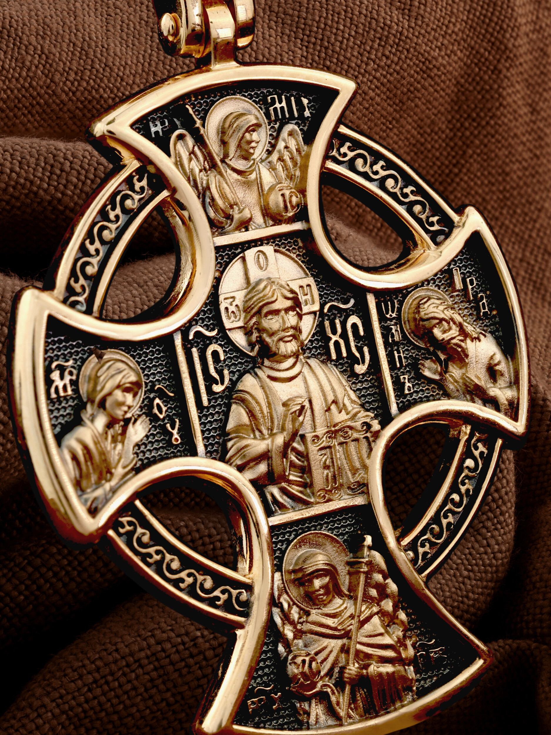 В центре лицевой стороны изображена ипостась Сына Божьего в окружении Пресвятой Богородицы и св. пророка и Предтечи Господня Иоанна Крестителя, которые имеют особое дерзновение перед Богом молиться за всех людей. Над образом Иисуса Христа изображен архангел Михаил, в нижней части креста — архангел Гавриил. В руках у Иисуса Христа находится Новый Завет. В кулонное кольцо помещено изображение Спаса Нерукотворного, образ Спасителя, который Он запечатлел на плате и передал для исцеления больному проказой царю Эдессы.