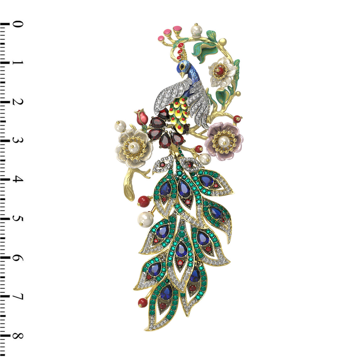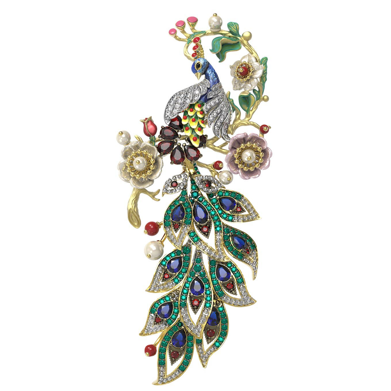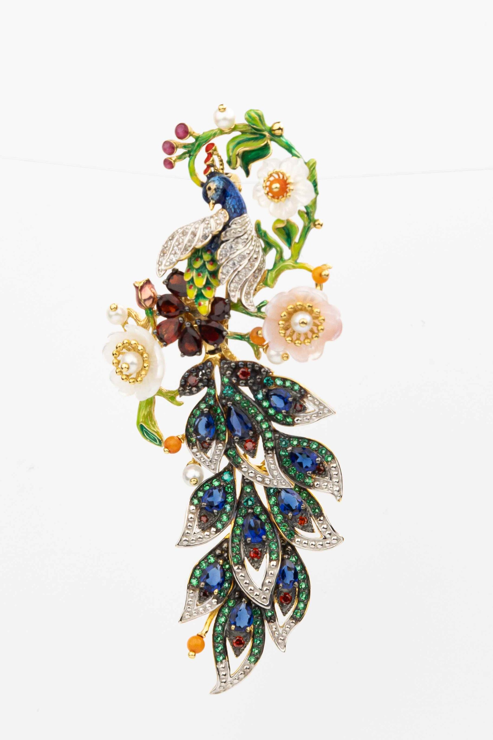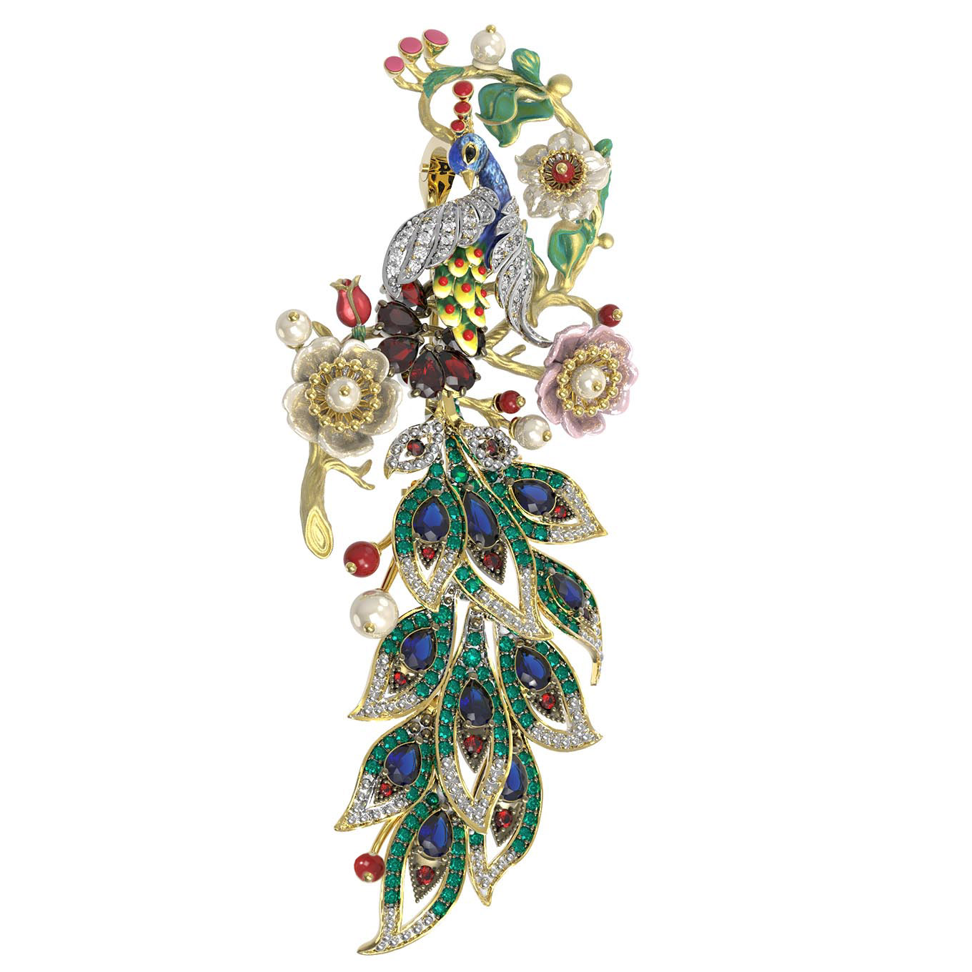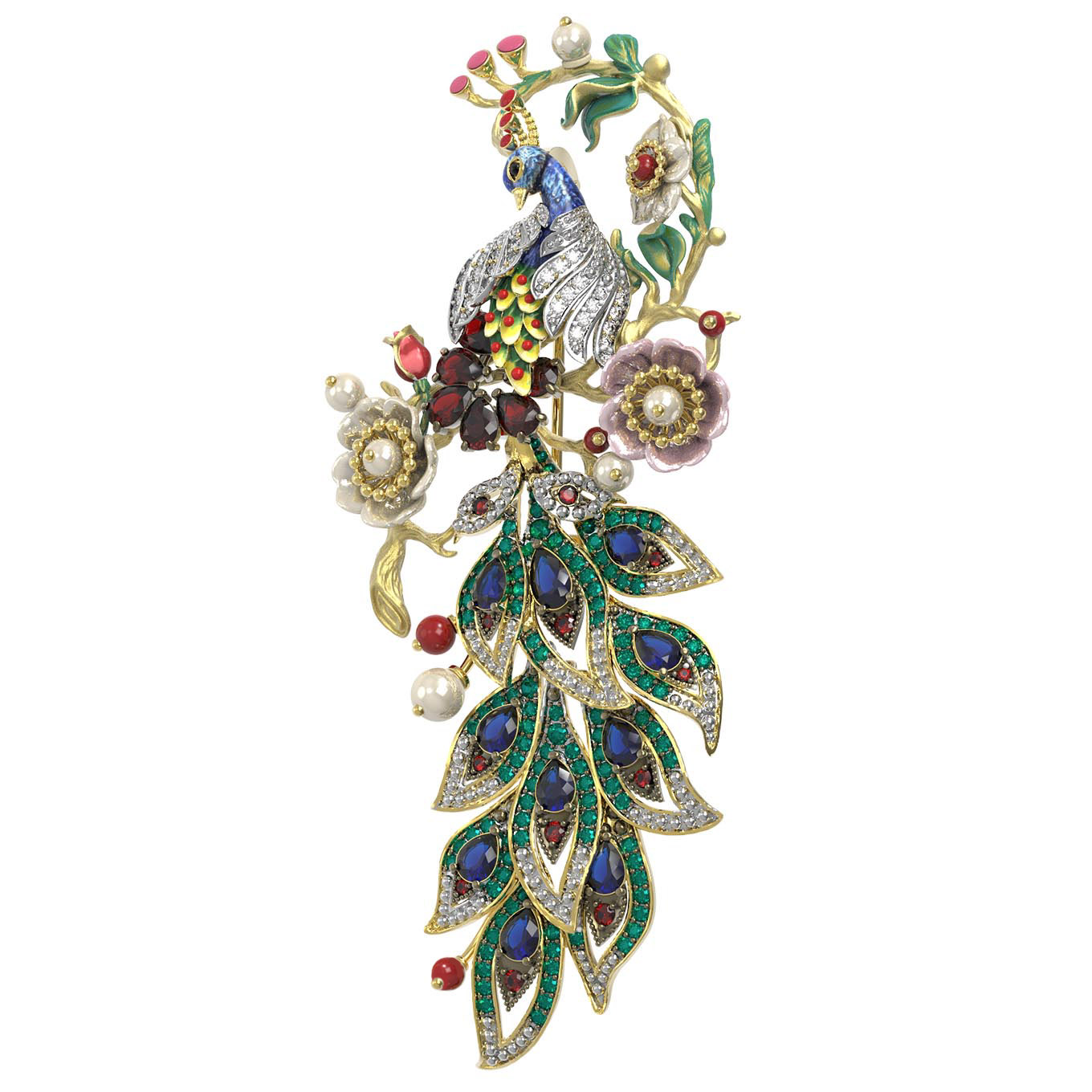 Брошь из лимонного золота c эмалью, фианитом, гранатом, жемчугом, сапфиром, кораллом и перламутром