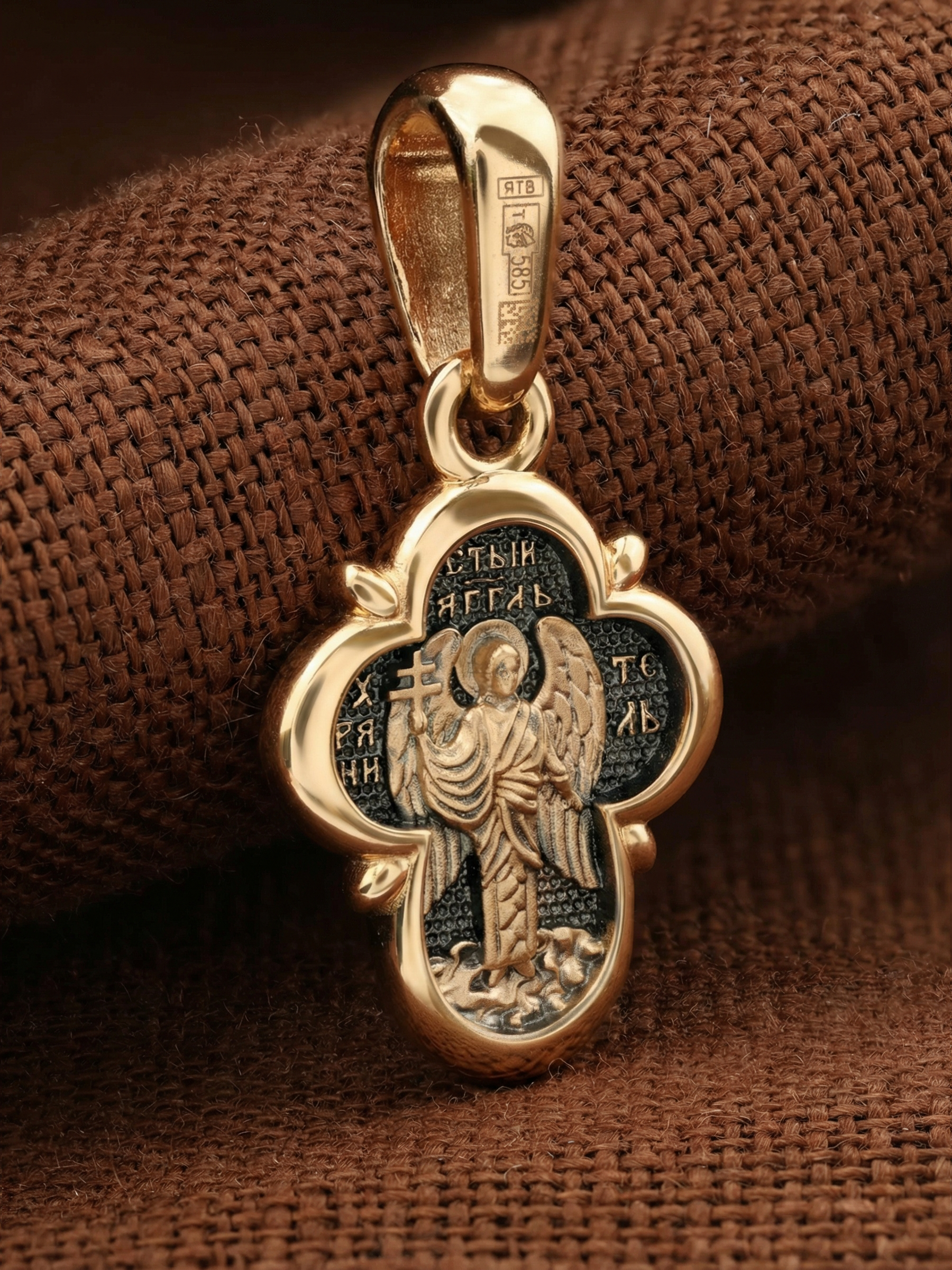 На оборотной стороне креста изображен Святой Ангел-Хранитель держащий в правой руке крест. Ангел-Хранитель — это Ангел приставляемый Богом к человеку при крещении для охраны и помощи в добрых делах. Он невидимо находится при человеке на протяжении всей его жизни, если человек сохраняет в себе любовь к Богу и истинную веру перед Ним. Ангел-Xранитель делают для нас все, что служит к истинному нашему благу и спасению. Невидимо пребывая при нас постоянно, он, руководствуя нас ко спасению, не только по нашему желанию таинственно наставляет нас на все доброе и полезное, не только возносит наши молитвы к Богу, но еще и сам от себя охраняют и защищают нас от врагов видимых и невидимых и ходатайствует за нас пред Богом. Ангел-Хранитель так любит нас, как никто на земле любить не может. Одного лишь каждому из нас он желает — спасения души; к этому он направляет все свои заботы.