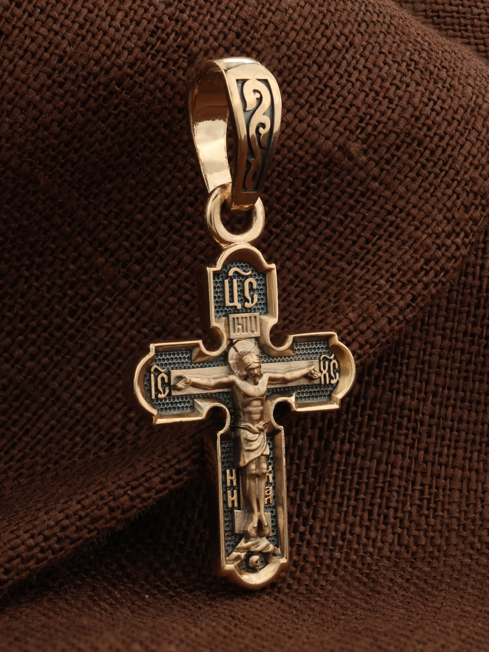 На лицевой стороне креста изображено Распятие Господа и Спасителя нашего Иисуса Христа, отдавшего Себя на смерть для искупления грехов мира. Крест является символом жертвенной любви Всеблагого Бога к падшим людям, всепобеждающим духовным оружием христиан, основанием и средоточием церковной жизни. Над вершиной Распятия помещена надпись «Царь Славы». На верхней перекладине расположена надпись «IНЦI». Она символизирует титло — табличку, на которой, согласно Евангелию, было начертано: Иисус Назорей, Царь Иудейский. Надпись «IC» «ХC»», означает Иисус Христос, помещаются на разных сторонах поперечной перекладины креста. Ниже помещена надпись «НИКА», что означает «победитель». Крест стоит на горе камней, символизирующих Голгофу. Под подножием Креста изображена покоящаяся голова (череп) Адама.