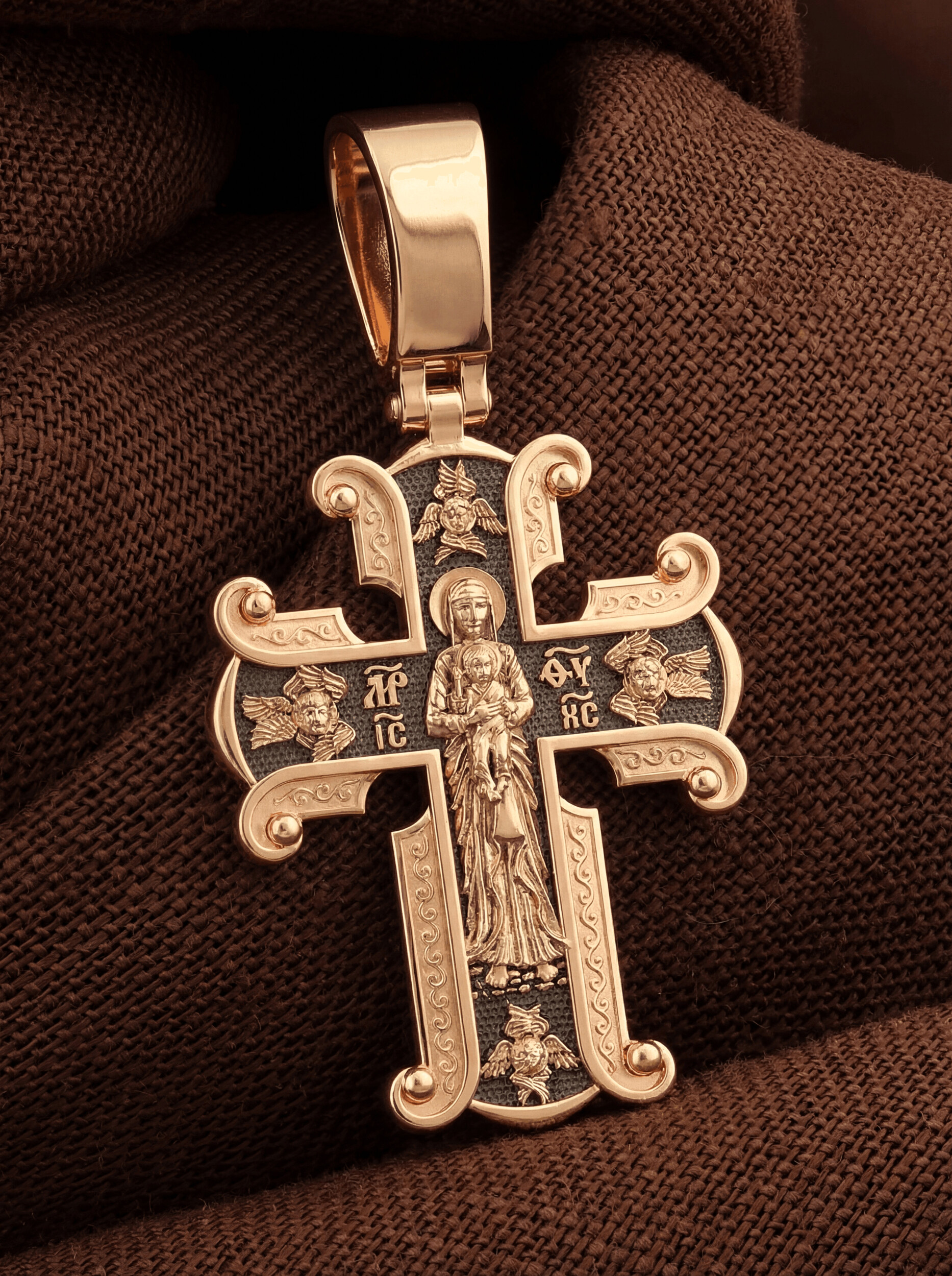 На лицевой стороне необычной формы нательного креста мы видим распятие Господне. Сам крест украшен плетением полурастительной тематики и золотым ободком, заканчивающимся завитками. На ухе с лицевой стороны надпись — Царь Славы. Под ней — шестикрылый огненный серафим, и буквы «IНЦI», означающие Иисус Назорей Царь Иудейский. С обеих сторон горизонтальной перекладины надписи — монограмма святого имени Христа — «ИС ХС», а под ней — «НИКА» (Победитель) и «Сын Божий». В подножии мы видим изображенную гору Голгофу в виде скалистой горки с Главой Адамовой в пещере.