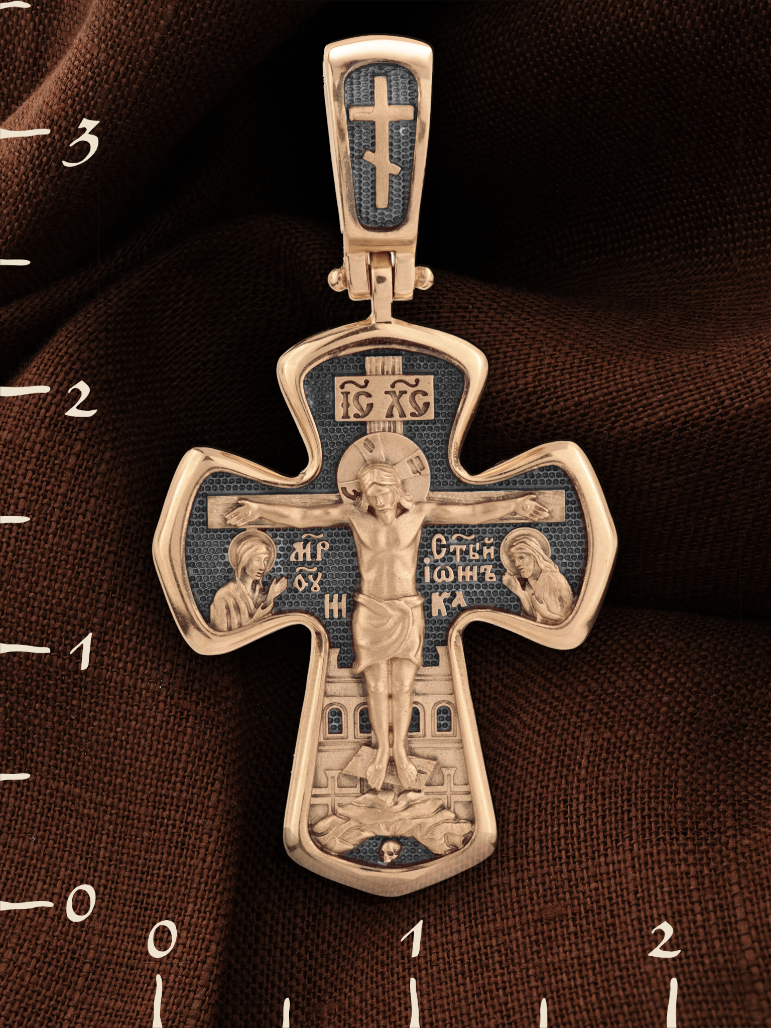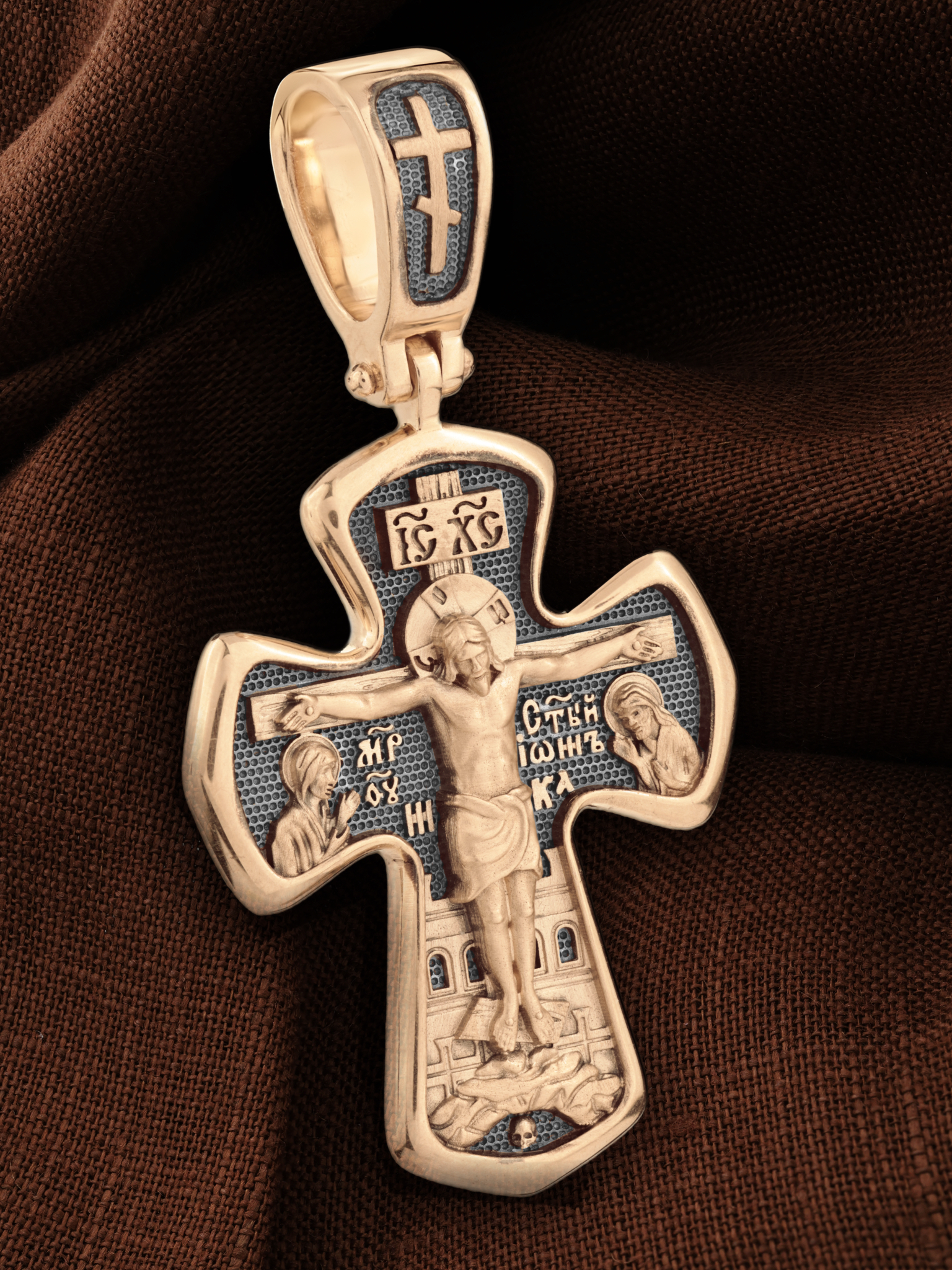 На лицевой стороне креста изображено Распятие Господа и Спасителя нашего Иисуса Христа, отдавшего Себя на смерть, для искупления грехов мира. Господь сказал: кто хочет идти за Мною, отвергнись себя, и возьми крест свой, и следуй за Мною. (Мк. 8: 34). Крест является символом жертвенной любви всеблагого Бога к падшим людям, всепобеждающим духовным оружием христиан, основанием и средоточием церковной жизни. На верхней перекладине помещена надпись «IС» « ХС», что означает Иисус Христос. Ниже — слово «НИКА», что означает «победитель». Слева от Распятия изображена Пресвятая Богородица, справа — апостол и евангелист Иоанн Богослов, один из ближайших учеников Иисуса Христа. За Распятием высится Иерусалимская стена, в знак того, что Господь был распят вне стен города. Возвышение, на котором стоит Крест, символизирует гору Голгофу, на которой произошло Распятие. Под подножием Креста изображена покоящаяся голова (череп) Адама. На кулонном кольце помещен крест.